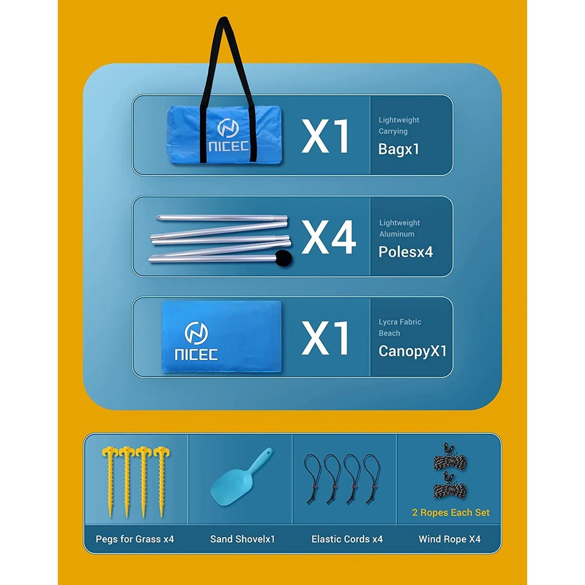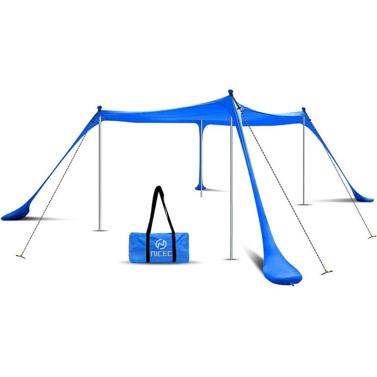 - This all-in-one set includes a lycra fabric canopy, a carry bag, four aluminum poles, four pegs, one sand shovel, four elastic cords, and two ropes.