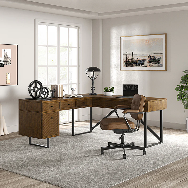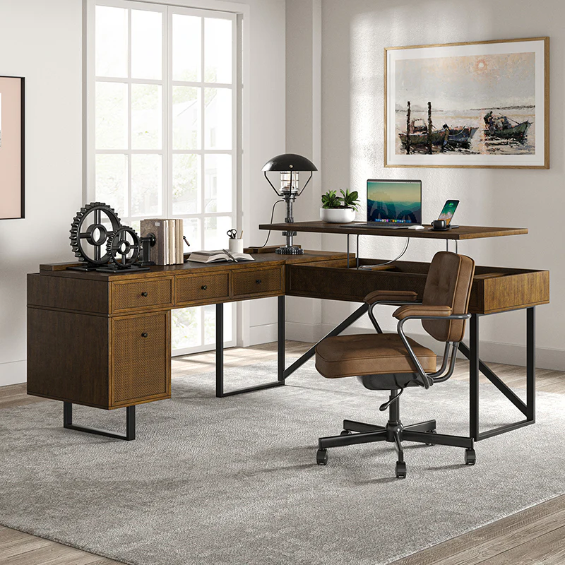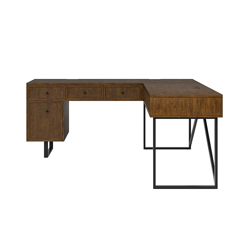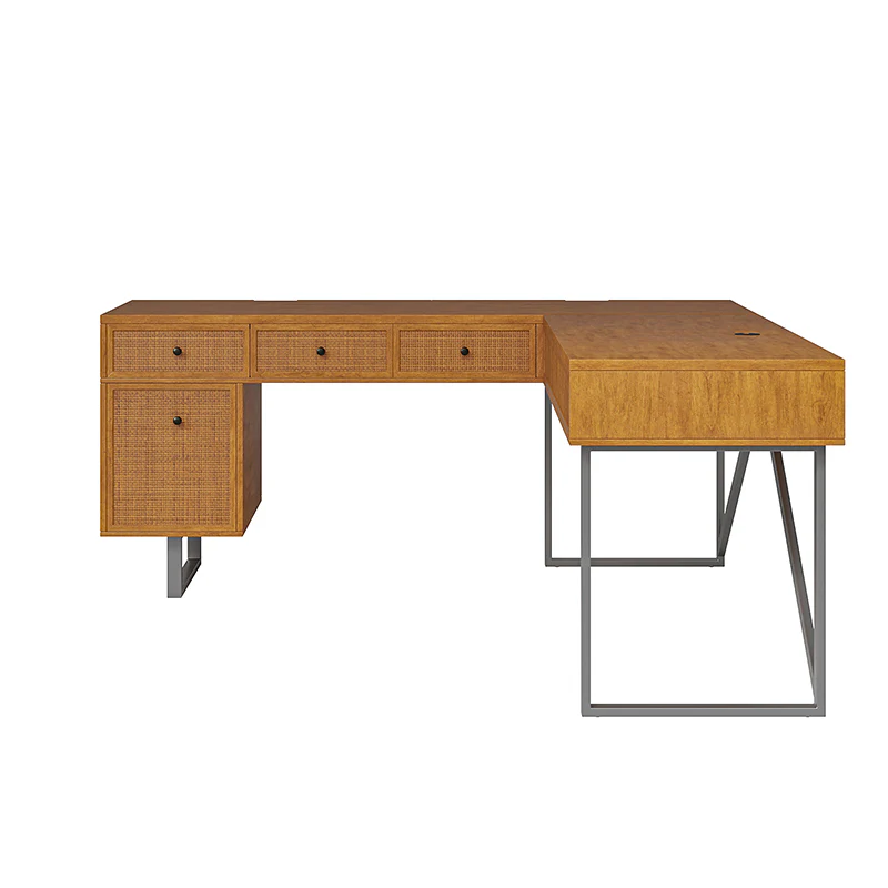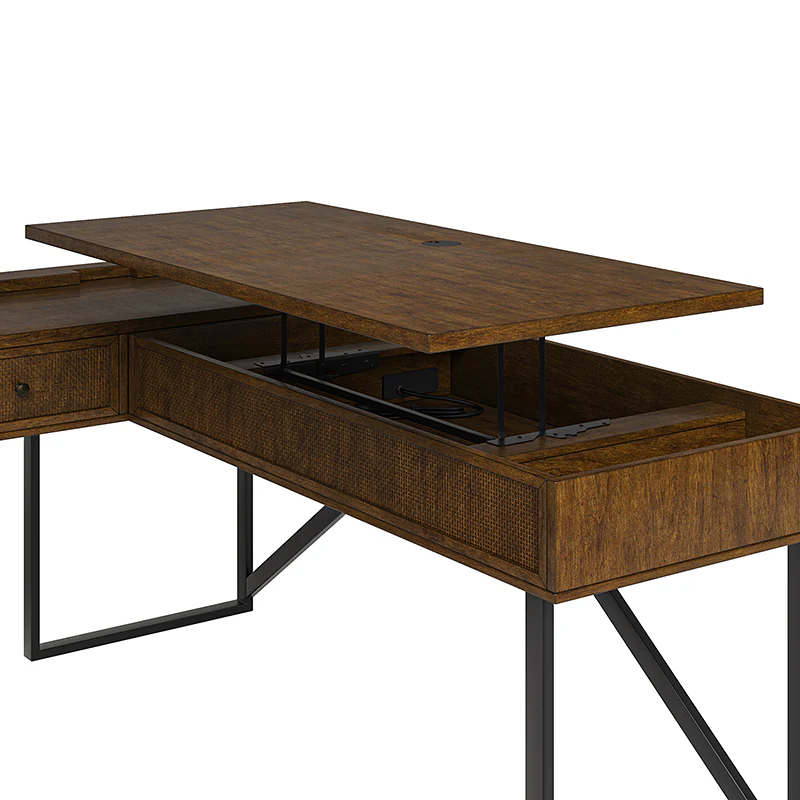 Upgrade your workspace with the ergonomic industrial and mid-century L-shaped desk. This premium alternative to a desk riser features an innovative sit-stand return that provides all the health benefits of a standing desk, with a more advanced height adjustment option. The built-in mechanical system allows the tabletop to hold in place at a vertical height of 41 inches and return easily to a sitting position.The desk includes a file drawer with a stylish rattan finish and full-extension ball-bearing slides for easy access to legal and letter-sized documents. Additionally, it features a drawer for supplies and utensils, equipped with wire management grommets to keep wires and cables safe and out of sight. This desk seamlessly combines functionality, aesthetics, and ergonomic benefits to create a versatile and stylish addition to any workspace.