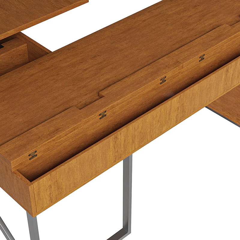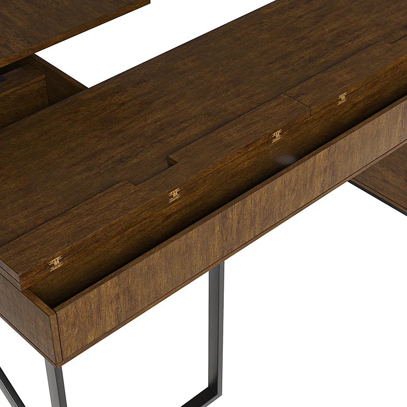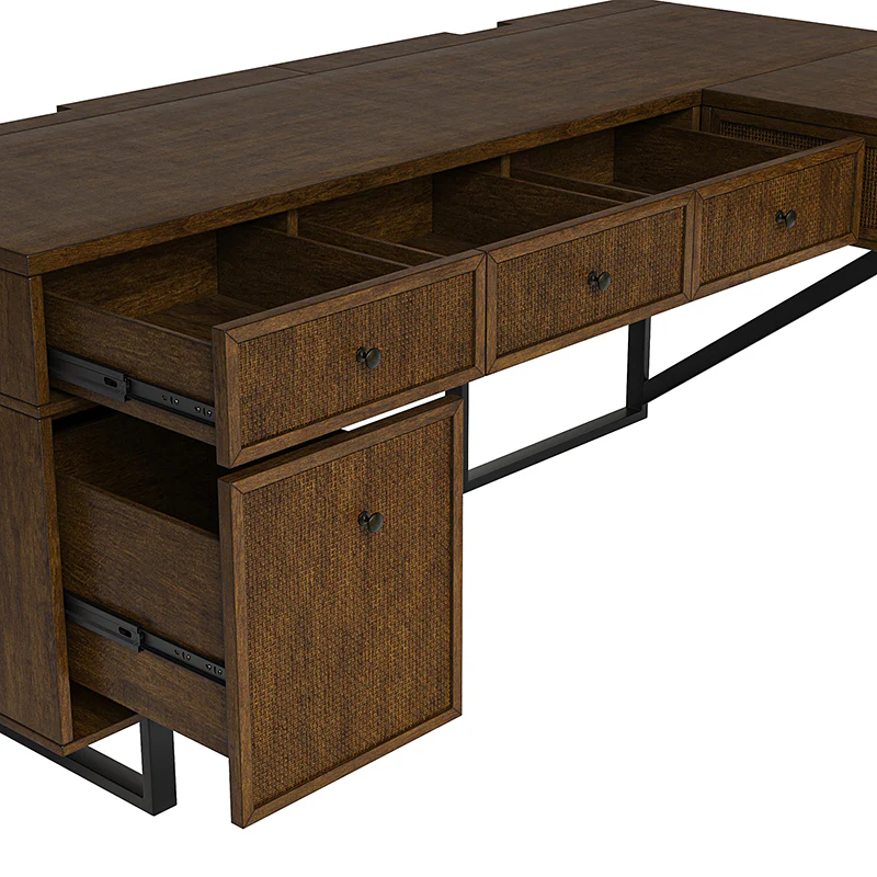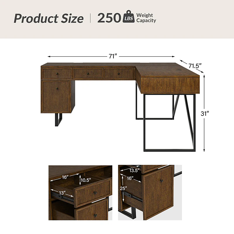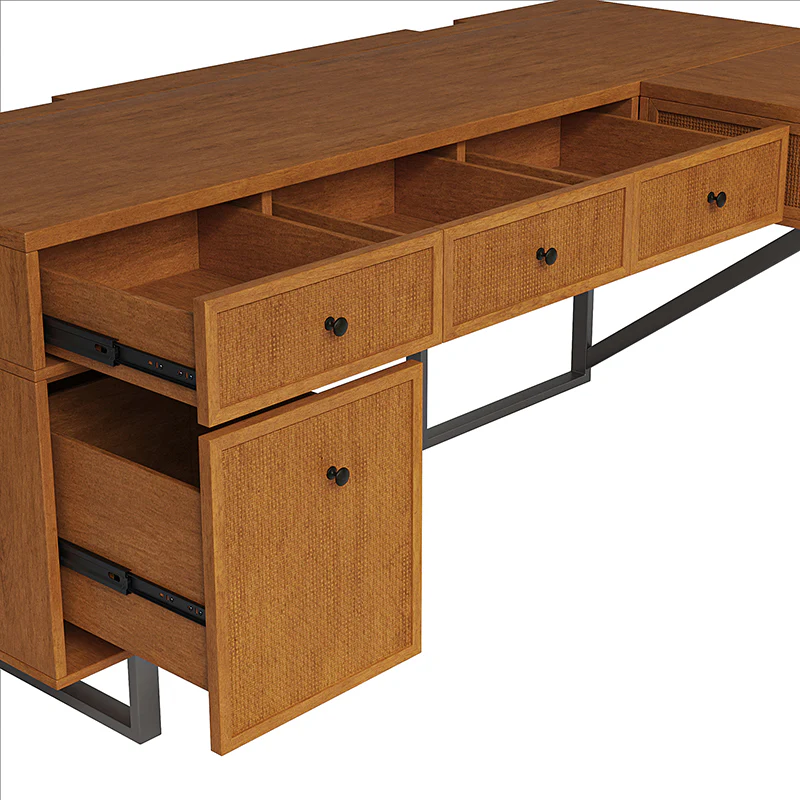 Upgrade your workspace with the ergonomic industrial and mid-century L-shaped desk. This premium alternative to a desk riser features an innovative sit-stand return that provides all the health benefits of a standing desk, with a more advanced height adjustment option. The built-in mechanical system allows the tabletop to hold in place at a vertical height of 41 inches and return easily to a sitting position.The desk includes a file drawer with a stylish rattan finish and full-extension ball-bearing slides for easy access to legal and letter-sized documents. Additionally, it features a drawer for supplies and utensils, equipped with wire management grommets to keep wires and cables safe and out of sight. This desk seamlessly combines functionality, aesthetics, and ergonomic benefits to create a versatile and stylish addition to any workspace.