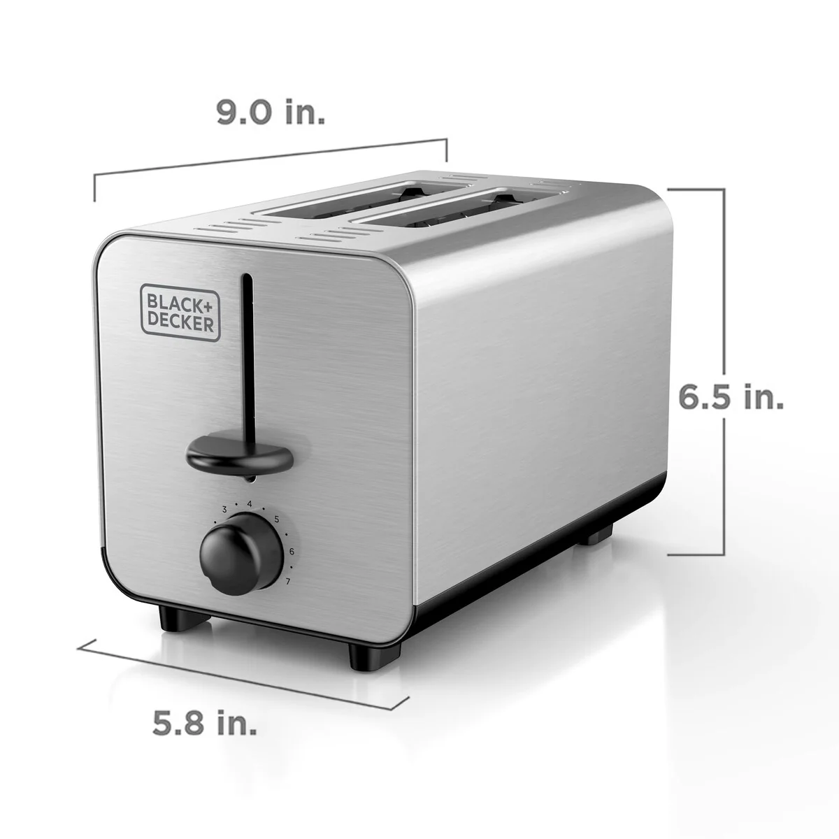 With the Black and Decker 2 Slice Stainless Steel Toaster, enjoy toasting versatility at the touch of a button! Toast all types of breads, waffles, and pastries. Set the shade selector from 1-7 to get toast just the way you like it. The two wide slots make it easy to get your day going.Material: Stainless SteelColor: SilverPower: 750W, 120V2 Wide Slots7 Toast Shade SettingsTurning KnobDrop Down Crumb TrayHigh-Lift LeverCancel FunctionItem Dimensions: 9" length, 5.8" width, 6.5" height