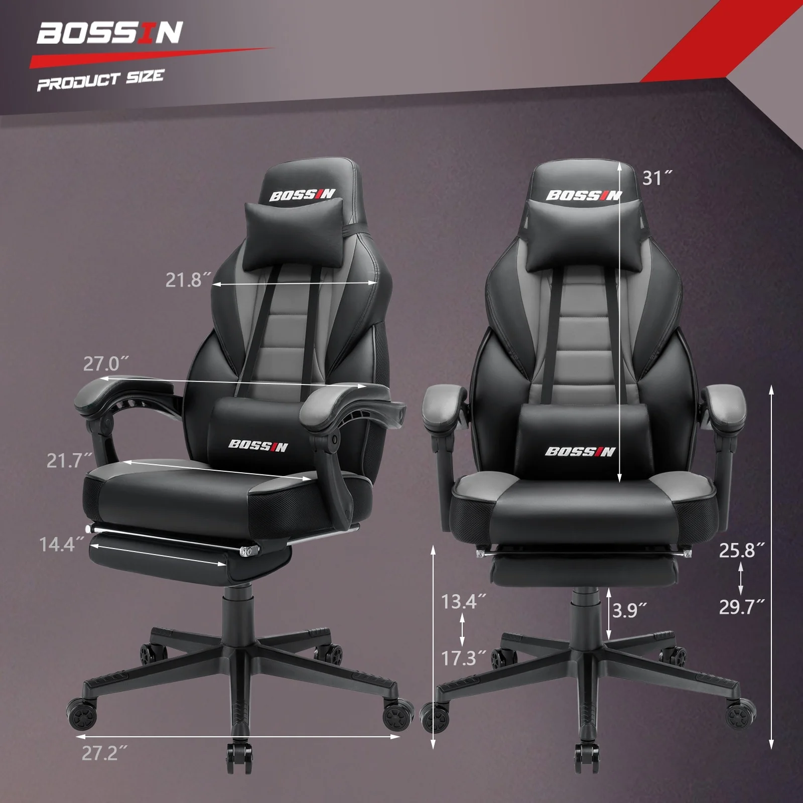 BOSSIN Gaming Chair extends the length of the backrest to support your shoulders and head. Felt relax at working period and exciting gaming sessions. And that backrest allow 90 to 155 degree movement or lying down like a bed. for taking a quick nap.Our gaming chairs not only have a cool style, a stylish look, but also support for all-day comfort.