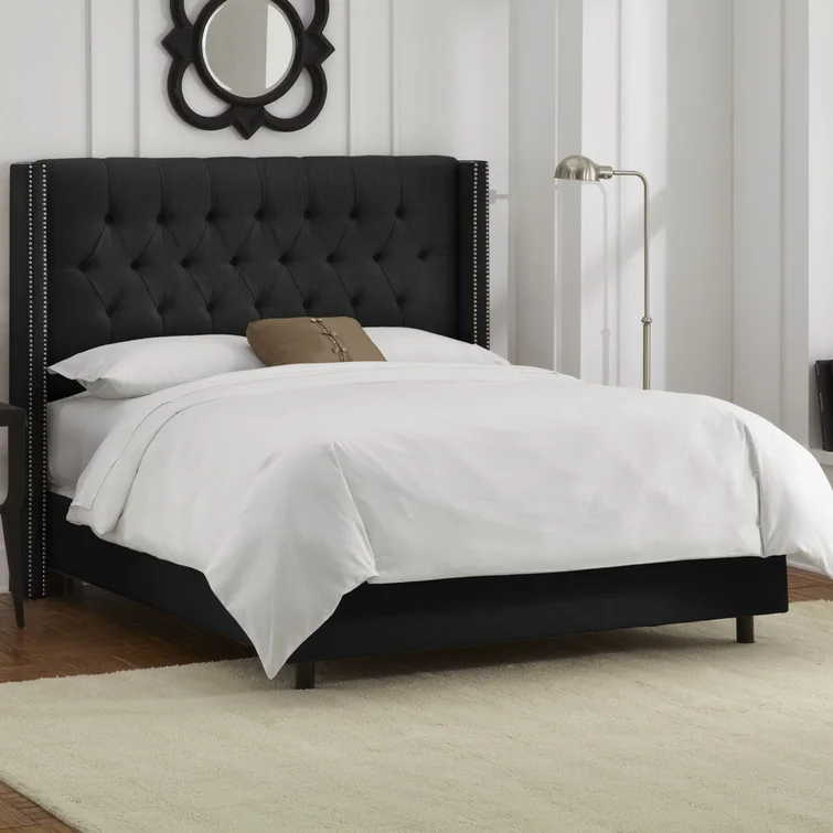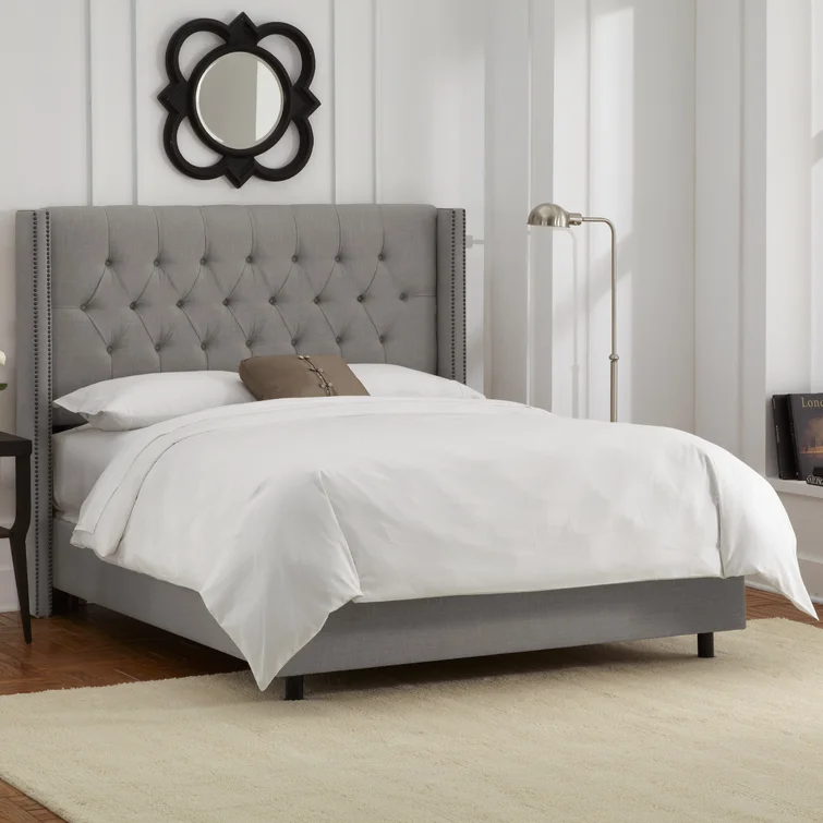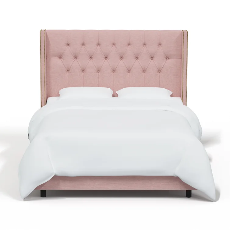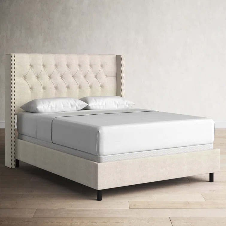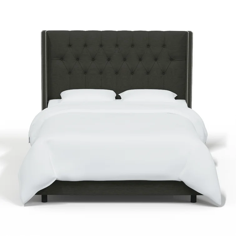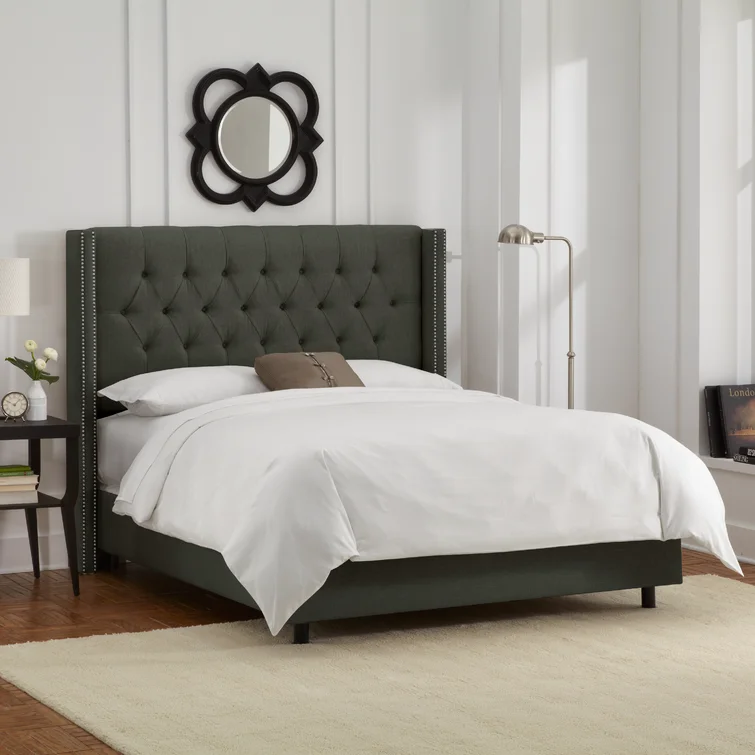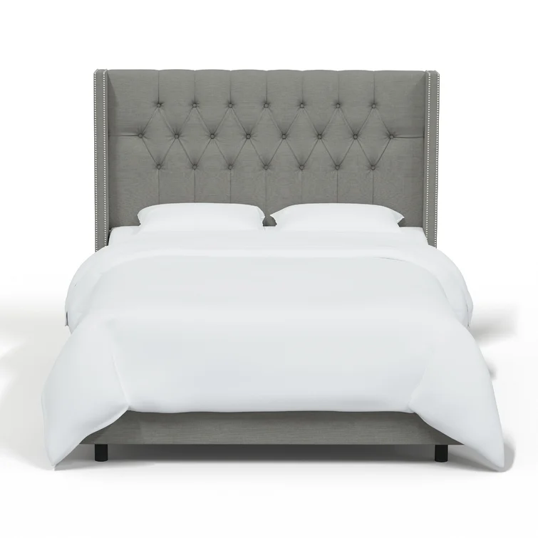 Since you spend about one-third of your life asleep (and another third wishing you were back between the sheets), you might as well pass the time in a bed you love. Crafted from solid pine wood, this bed features a subtle wingback headboard wrapped in linen-like fabric for a classy, casual look in any cozy master suite. Its foam-padded headboard offers support for reading and watching TV, while button tufts and nailhead trim round out the design.