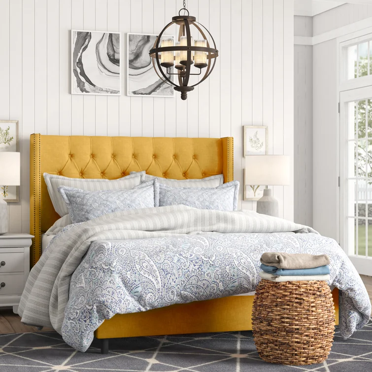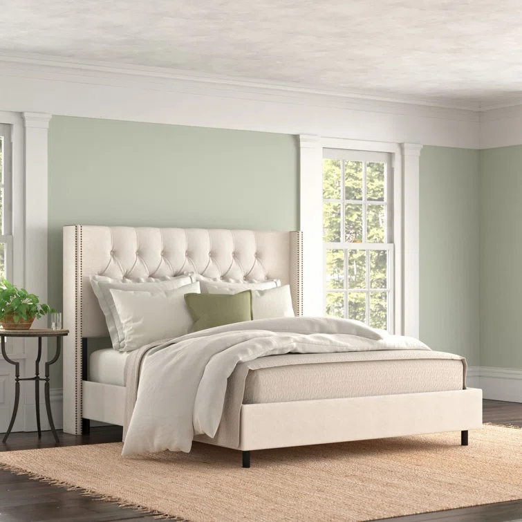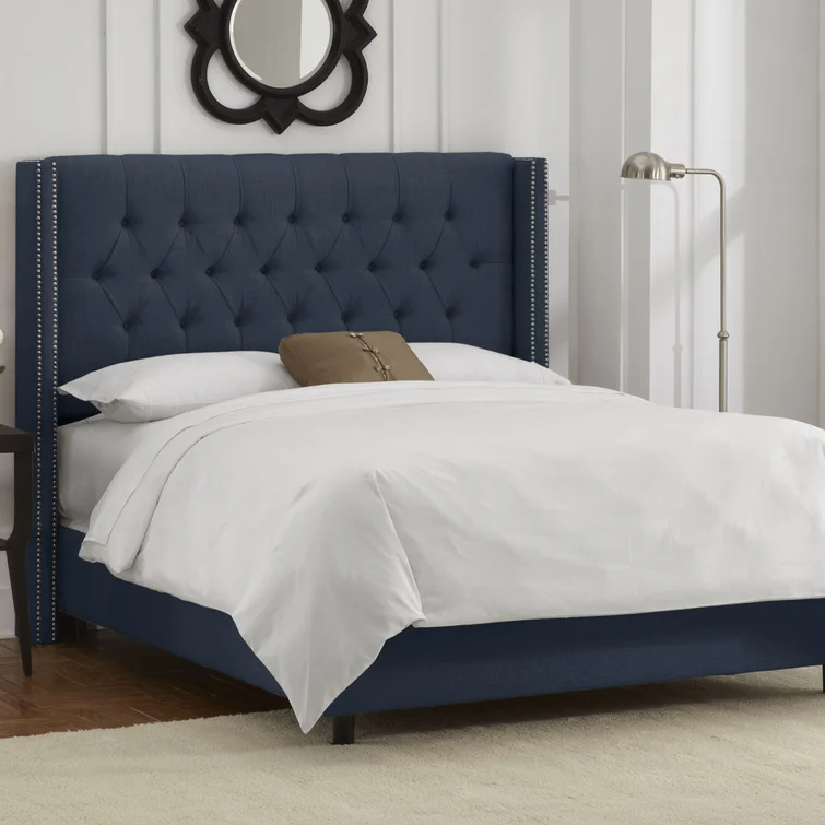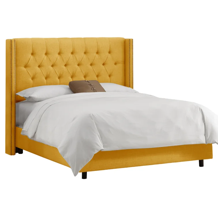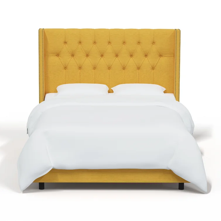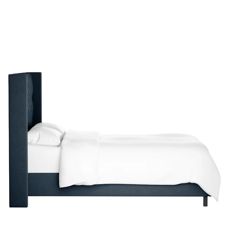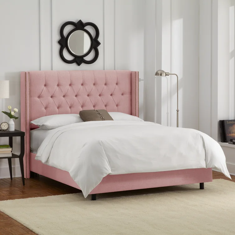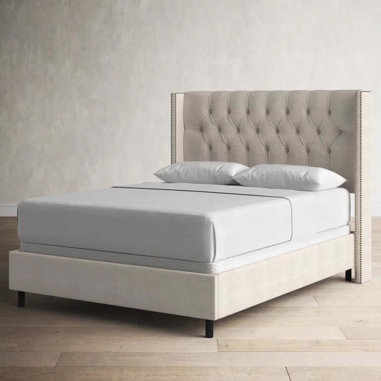 Since you spend about one-third of your life asleep (and another third wishing you were back between the sheets), you might as well pass the time in a bed you love. Crafted from solid pine wood, this bed features a subtle wingback headboard wrapped in linen-like fabric for a classy, casual look in any cozy master suite. Its foam-padded headboard offers support for reading and watching TV, while button tufts and nailhead trim round out the design.
