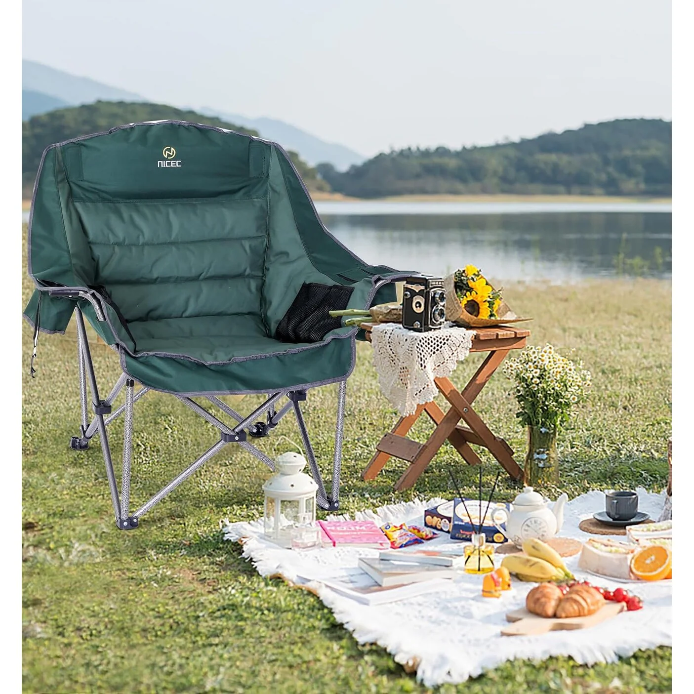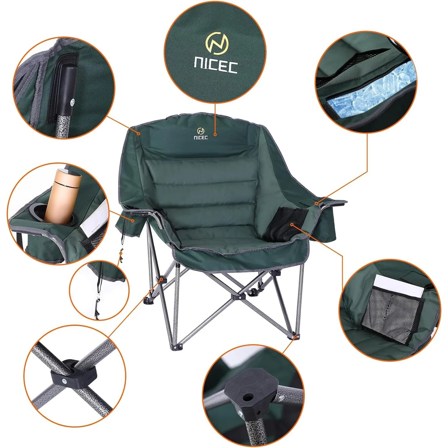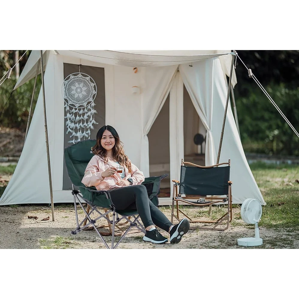 - Easy Folding and Portability:** Despite its size, the chair remains conveniently portable with its easy folding mechanism. Effortlessly pack and transport the chair to your camping site or outdoor event, ensuring comfort is always within reach wherever you go.