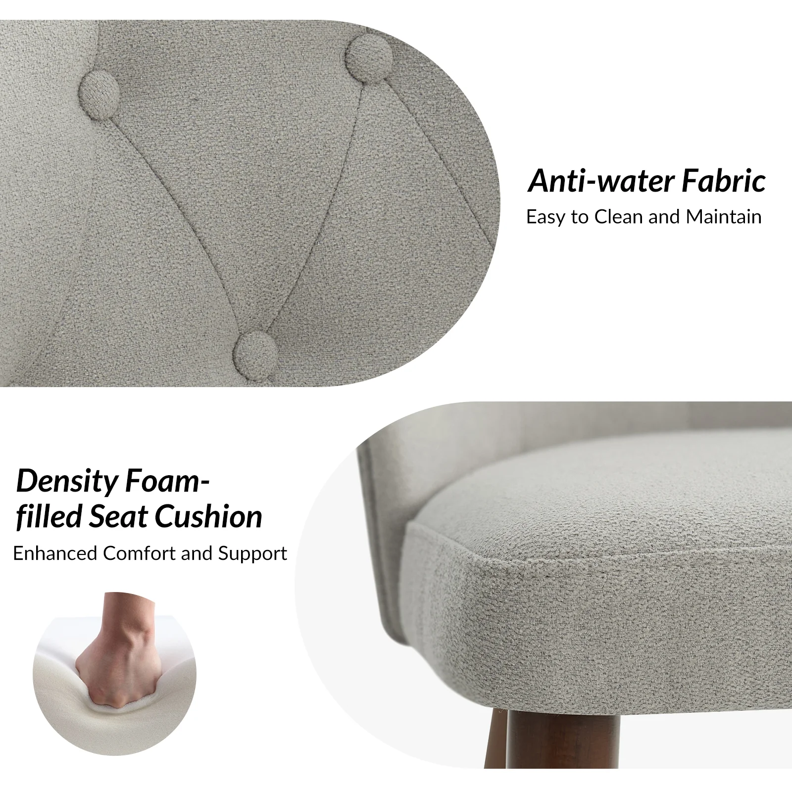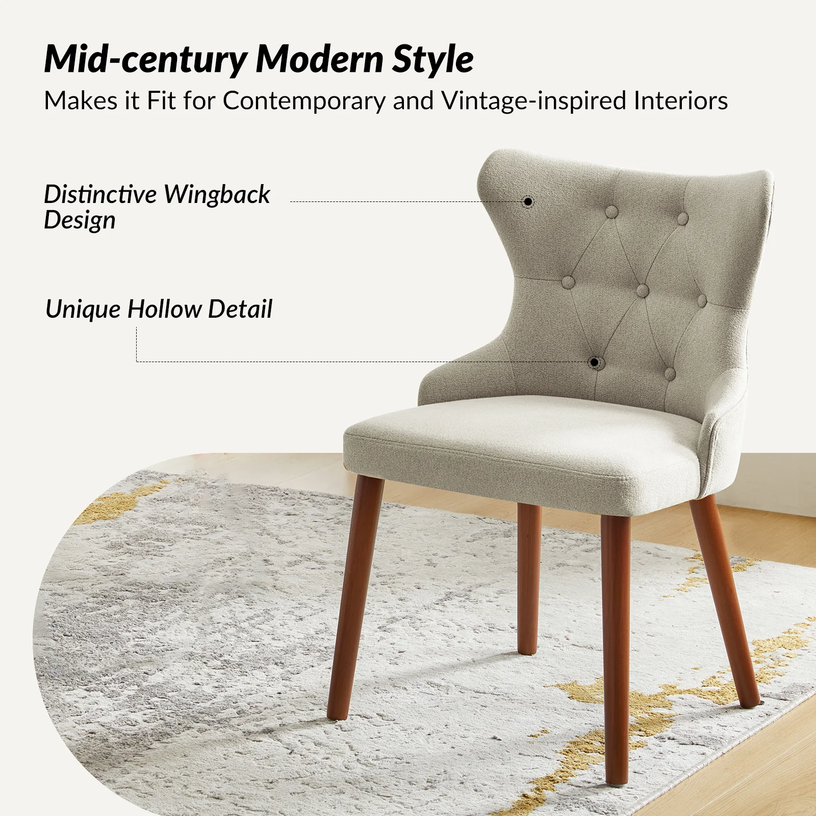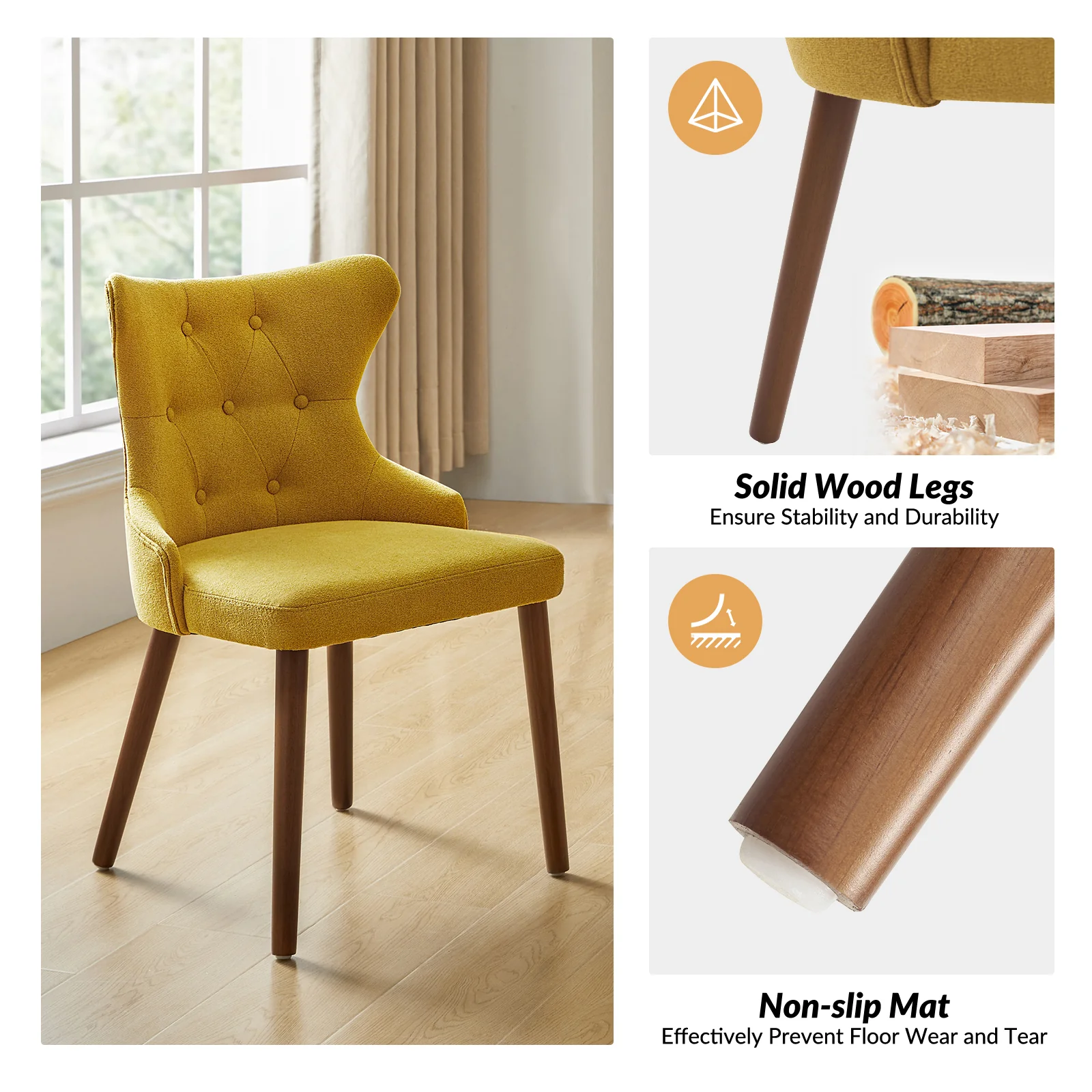 This mid-century modern dining chair set brings sophistication and comfort to your dining area. The set includes elegant wingback chairs, each designed with solid wood legs for a sturdy and classic foundation. The backrests feature a button-tufted design, adding a touch of vintage charm and visual interest to the chairs. Upholstered in waterproof fabric, these chairs are easy to maintain and keep clean, making them suitable for households with children or frequent guests. Crafted from high-density foam-filled seats that offer support, you can sit comfortably for extended periods. This dining chair set is easy to install with threaded legs, no tools required. The ergonomic design ensures you and your guests can enjoy dinners or social gatherings without discomfort. Whether placed in a dining room, kitchen, or even as accent chairs in other living spaces, this dining chair set enhances any decor with its stylish mid-century modern design.