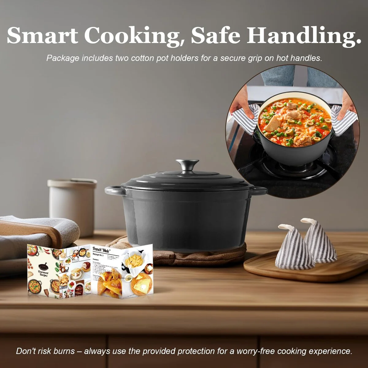 Effortless Cleaning & Safety First: The flat and smooth enamel surface not only delivers a superior cooking experience but also makes cleaning a breeze. Easily remove food residues with a gentle wipe from a soft sponge or cloth. Additionally, we've included a cotton heat-resistant cap, ensuring a comfortable grip and safeguarding you from burns when handling the pot's handles and lid.