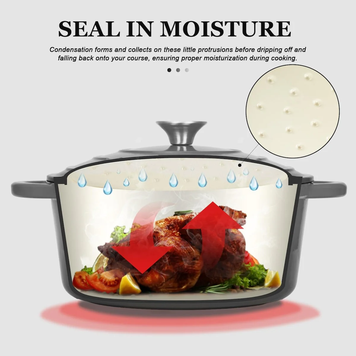 Perfectly Preserved Flavors: Say goodbye to dry and overcooked meals! With our innovative design, water vapor condenses evenly on the lid, preserving the ideal humidity and flavors. Unlike traditional pot covers where condensation runs down the sides, our lid keeps your dishes succulent.