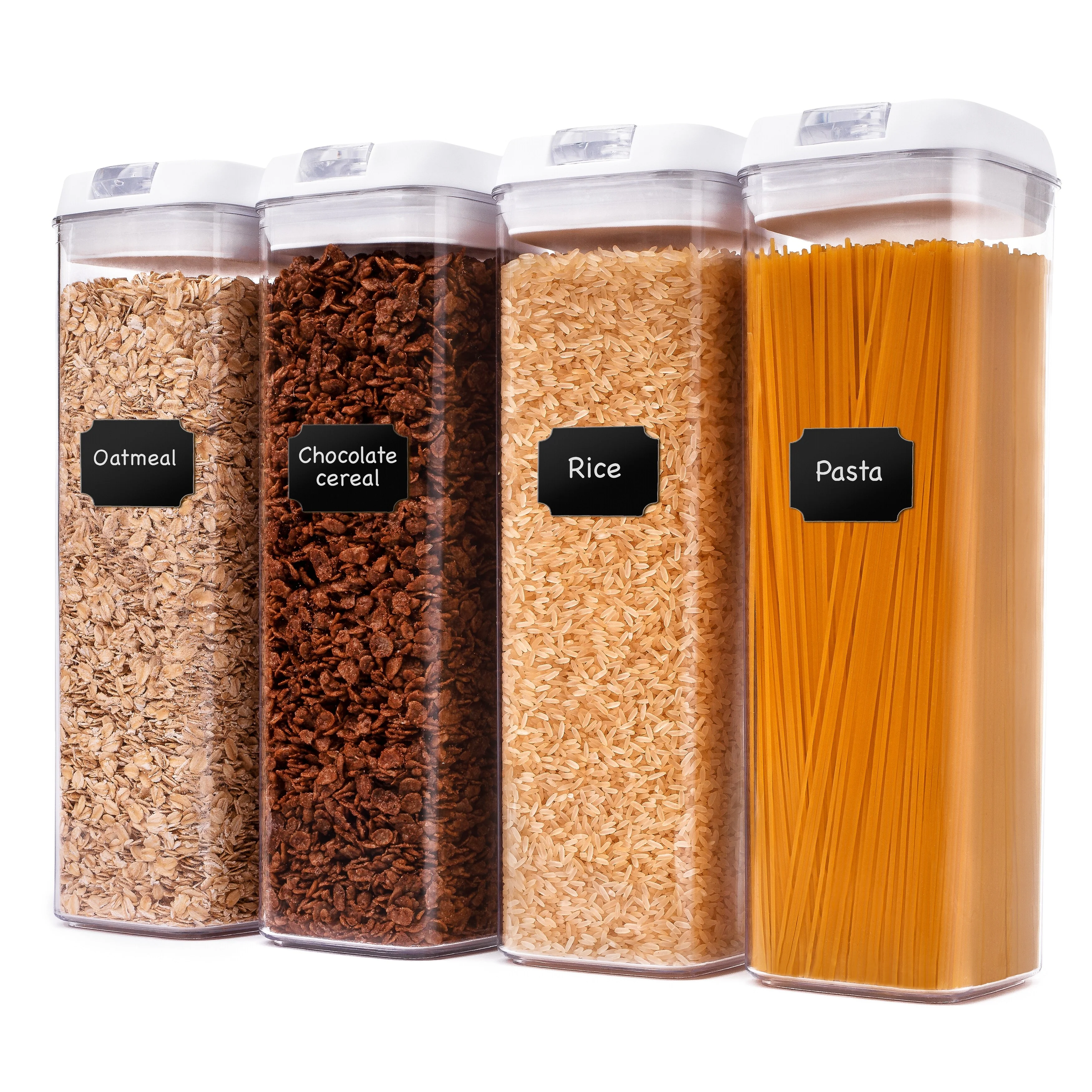 - PANTRY ORGANIZATION - Airtight, space efficient stackable design keeps your pantry and kitchen cabinets organized; Set includes 4 wide mouth containers and lids plus white dry erase marker and 24 reusable labels