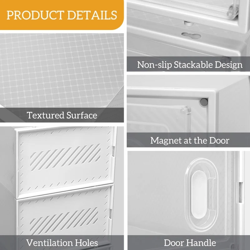 The materials we use are different from the general plastic products on the market. This product is made of high-quality plastic plate, which is more durable. The size of the shoebox is enough for ordinary men's or women's shoes (US Size: 5.0 ~ 10 / EU size: 37 ~ 44). A single shoebox can accommodate l 23 * W 33.4 * h 14cm shoes, including ordinary sports shoes, flat shoes, flip flops, sandals, etc.Shoe storage boxes provide additional storage space no matter where you need them, keeping your home comfortable and tidy. Our stackable shoe storage boxes provide additional storage space no  matter where you need it, keeping your home comfortable and tidy. You  can use them not only to store shoes but also clothes, cosmetics,  electronics, and other odds and ends. The ventilated design facilitates the air circulation in the item to ensure that there is no peculiar smell. The body of the boxes is made of ABS plastic, which is new patented material. It is 0.62mm thick to ensure the boxs firmness.