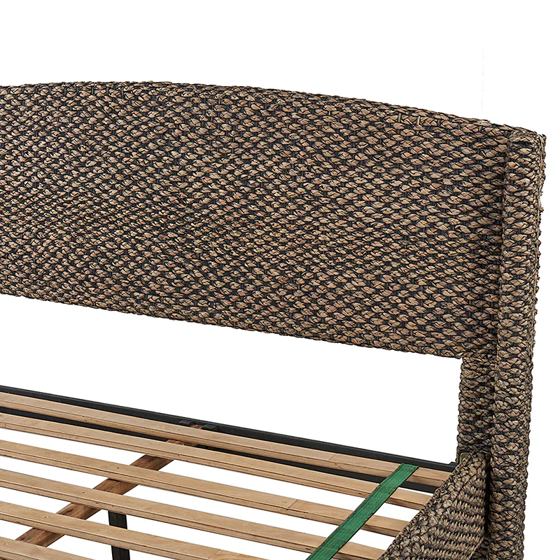 Introducing a captivating bed that exudes coastal charm and beach house style. The camber panel headboard of the bed is adorned with a braided design, evoking a rugged yet alluring feel. Its wingback design adds a touch of elegance and complements coastal and rustic decor seamlessly. Crafted with natural materials like woven grass rope, this bed effortlessly combines farmhouse, traditional, coastal, sea house, beach house, tropical, rustic, lodge, and French Country aesthetics. With its versatile appeal and timeless allure, this bed becomes a statement piece in any bedroom, inviting you to relax and unwind in a serene coastal ambiance.