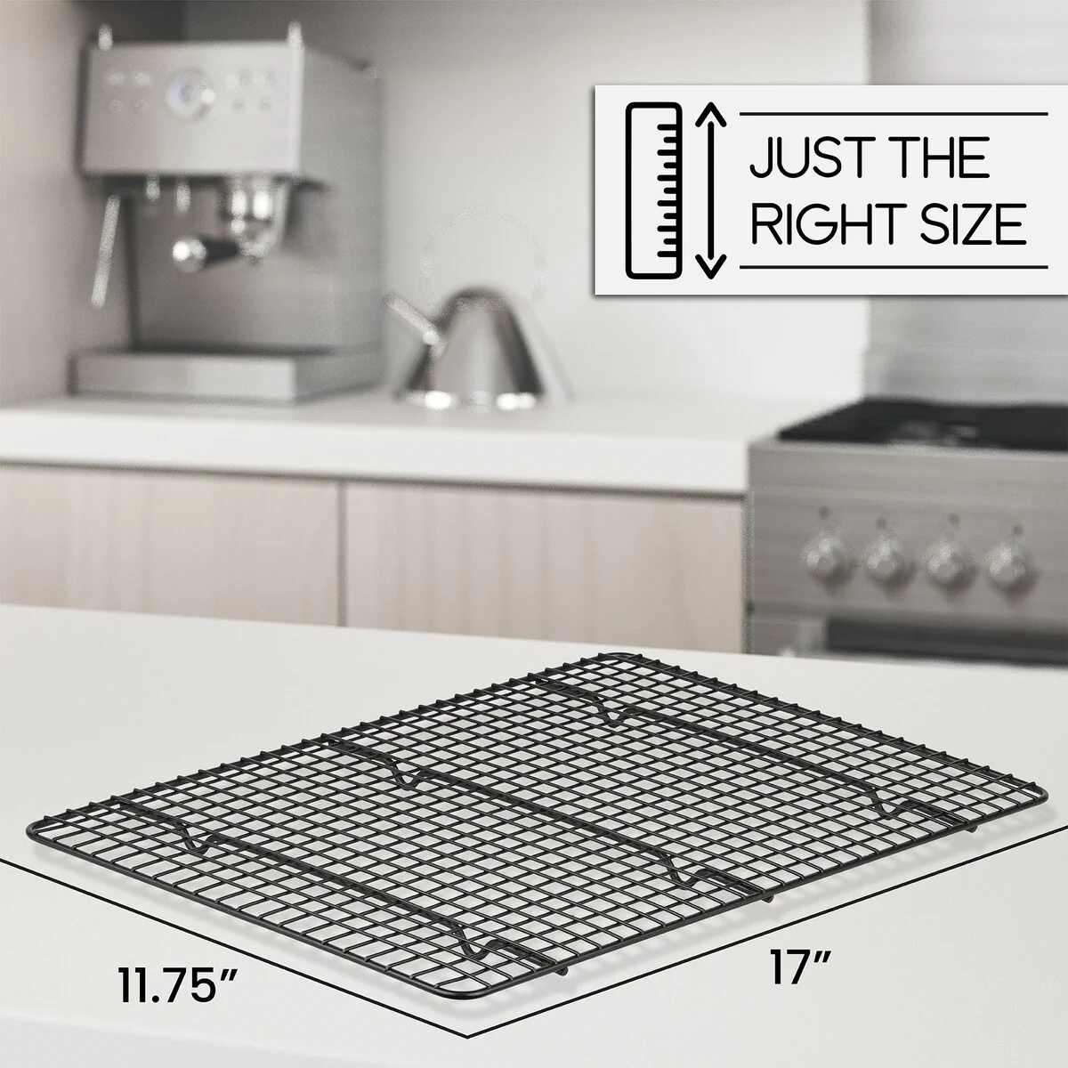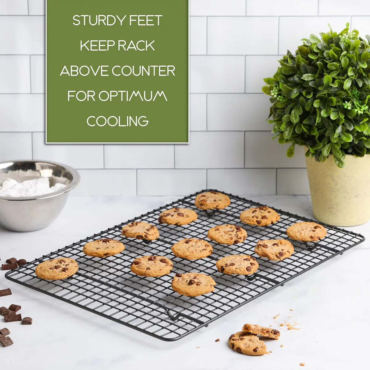 - VERSATILE: The cooling rack is perfect for baking cakes and cookies, roasting vegetables, and allowing baked goods to cool. The cooling rack has raised feet and crosswires for stability and maximum airflow.