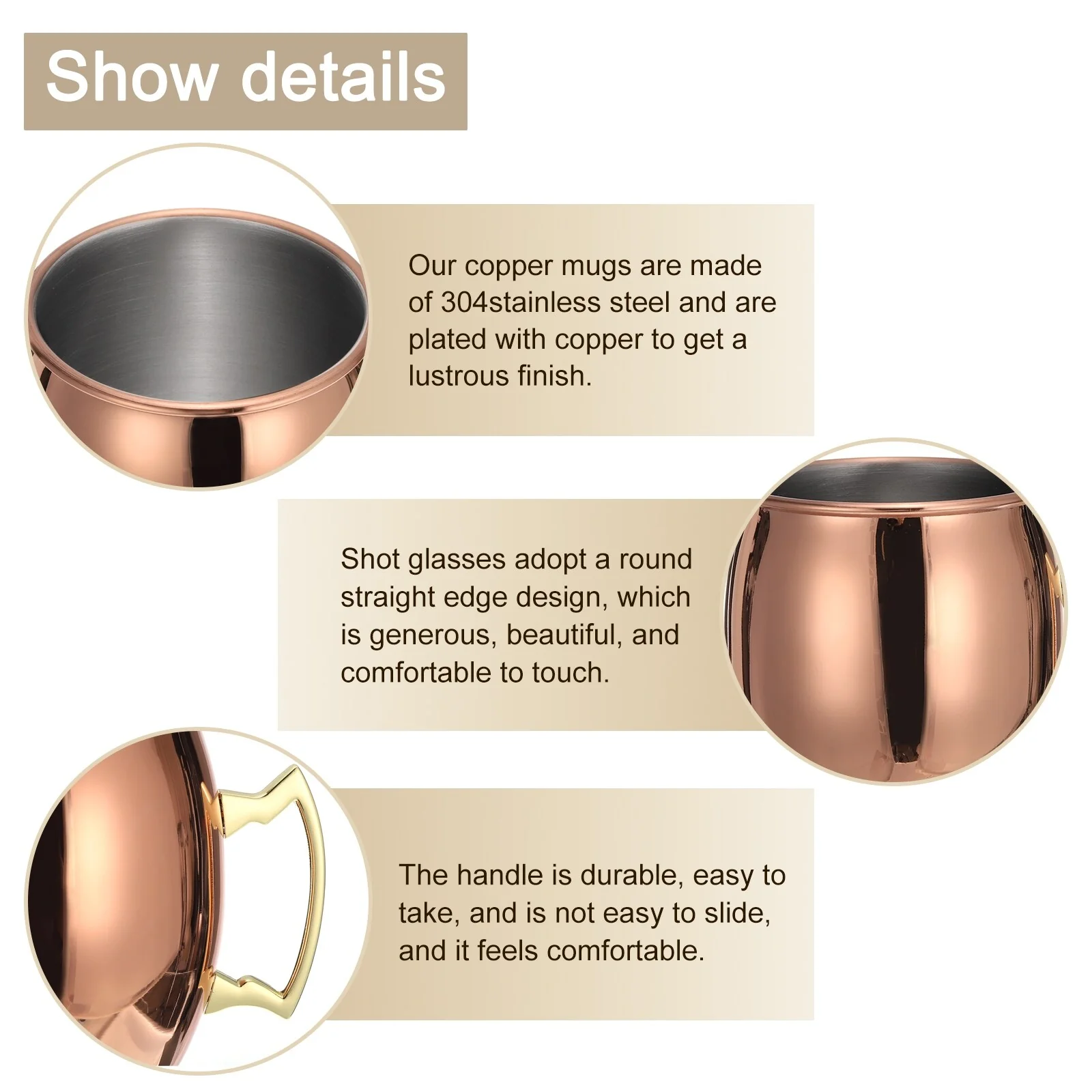 Durable and Sturdy: Our copper mugs are made of 304stainless steel and are plated with copper to get a lustrous finish. Compared with solid copper, a Stainless Steel mug is not easy to rust and enhances the taste.; The handle is durable, easy to take, and is not easy to slide, and it feels comfortable.