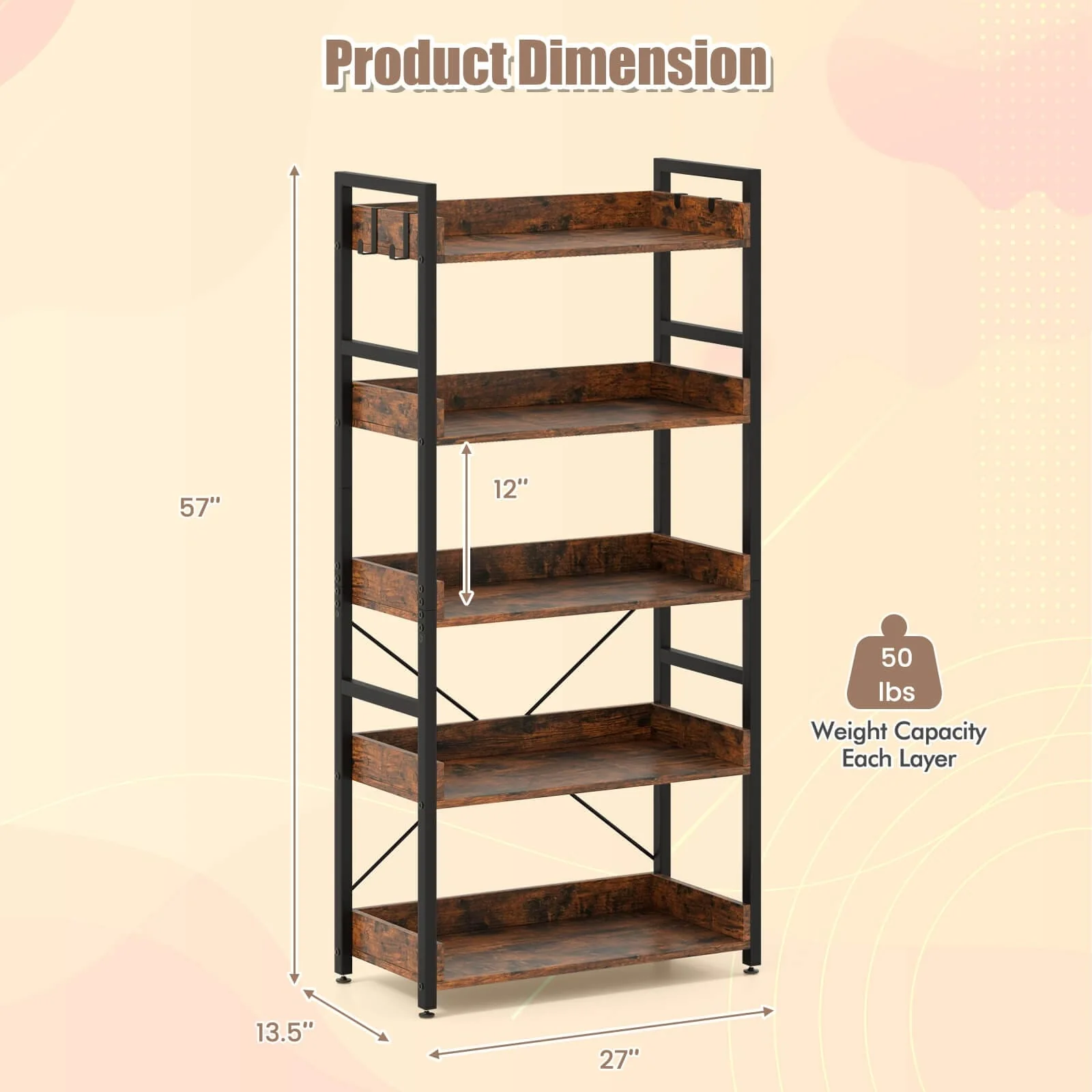 5 open shelves and 4 hooks provide spacious storage space to store items