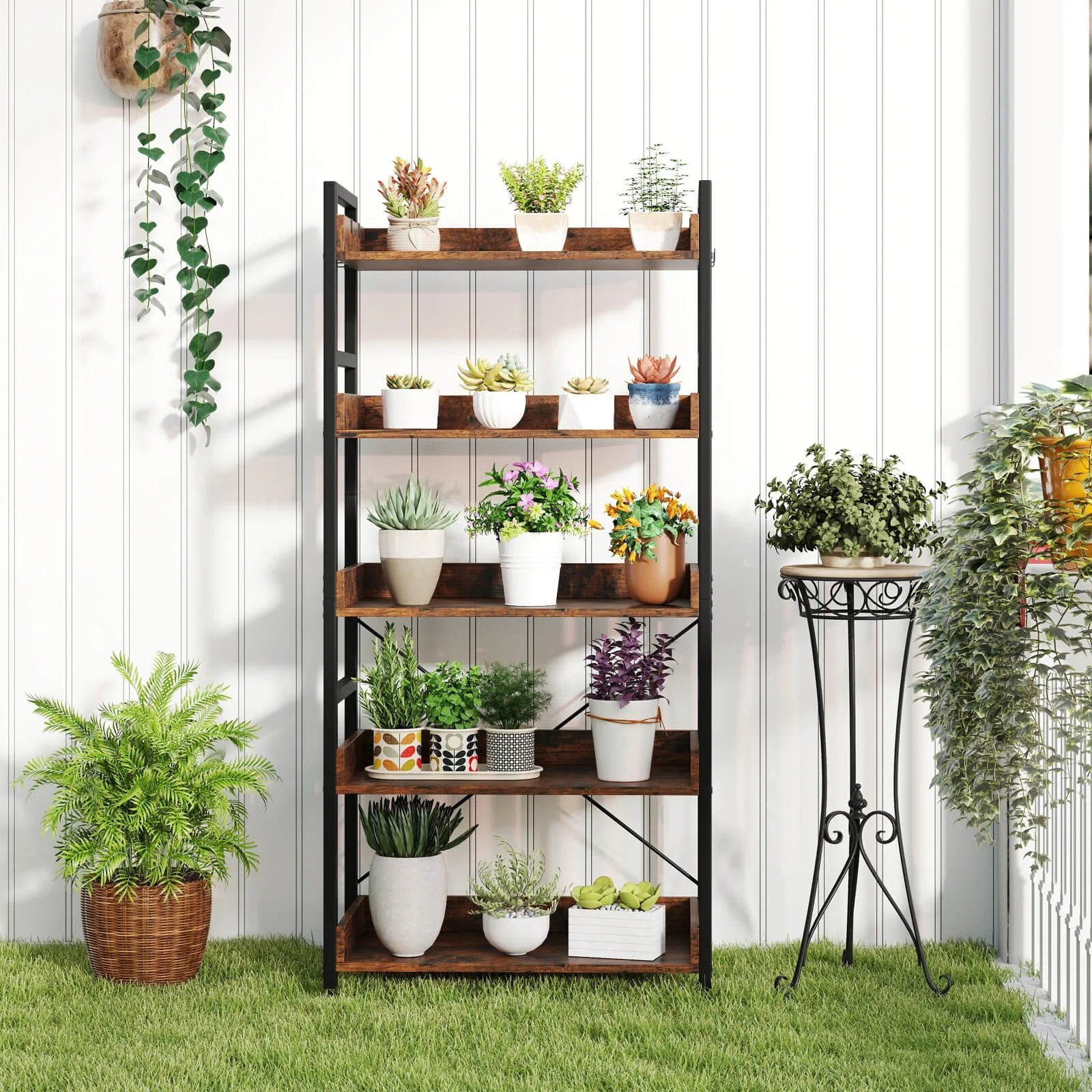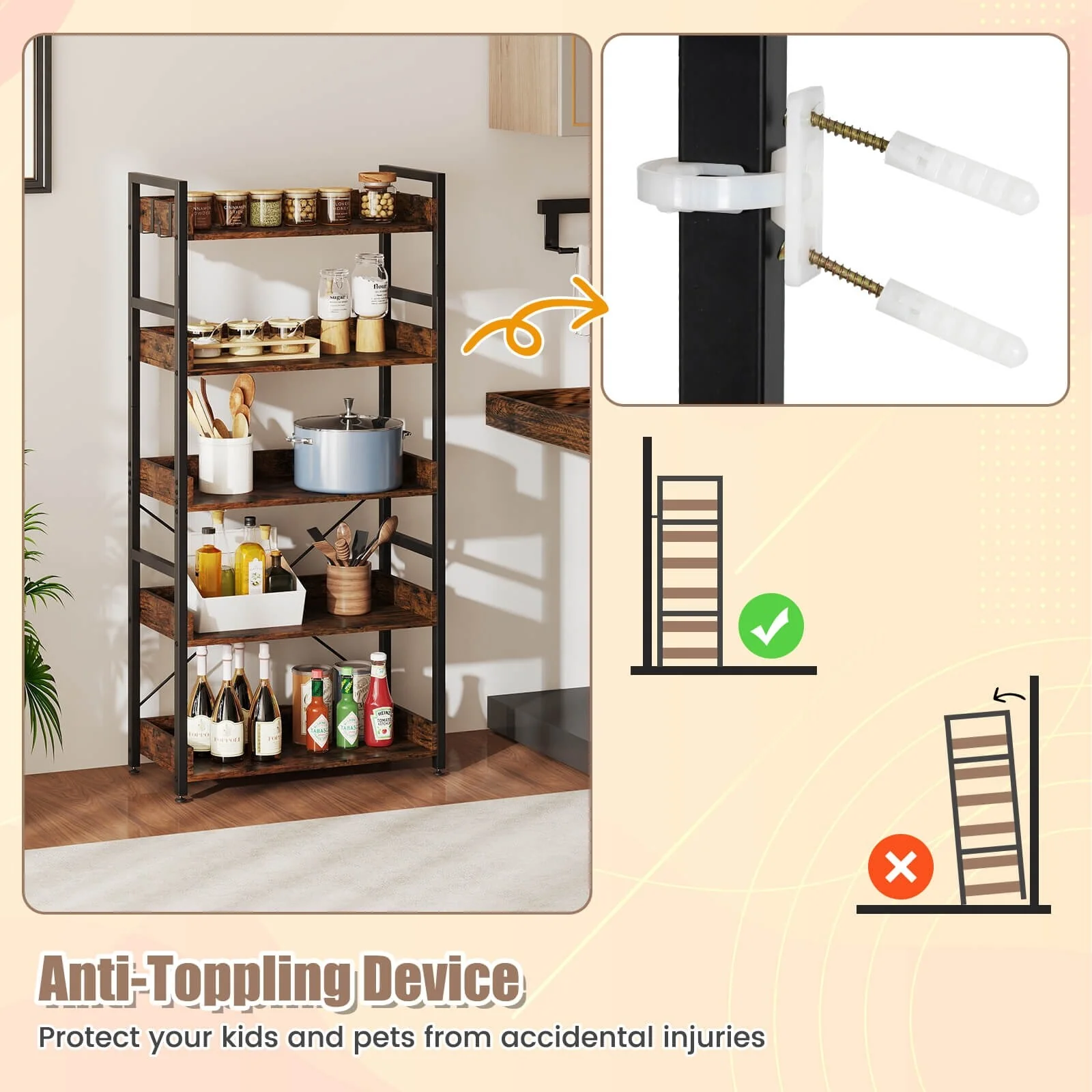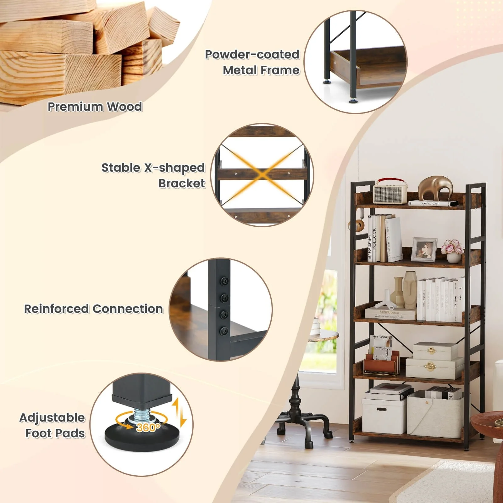 Our 5-tier storage rack is the combination of a simply stylish and practical bookshelf to make your space neat, organized, and also in elegant style. Featuring sturdy metal and wood construction, an X-shaped bracket, the rustic standing bookshelf is durable, rustproof, and deform-resistant for long-time uses. Equipped with anti-tip fittings, the bookcase can be anchored to the wall without wobbling or tipping. Raised edge protection design protects your belongings from accidental falling. A practical storage display rack and a great choice for you!