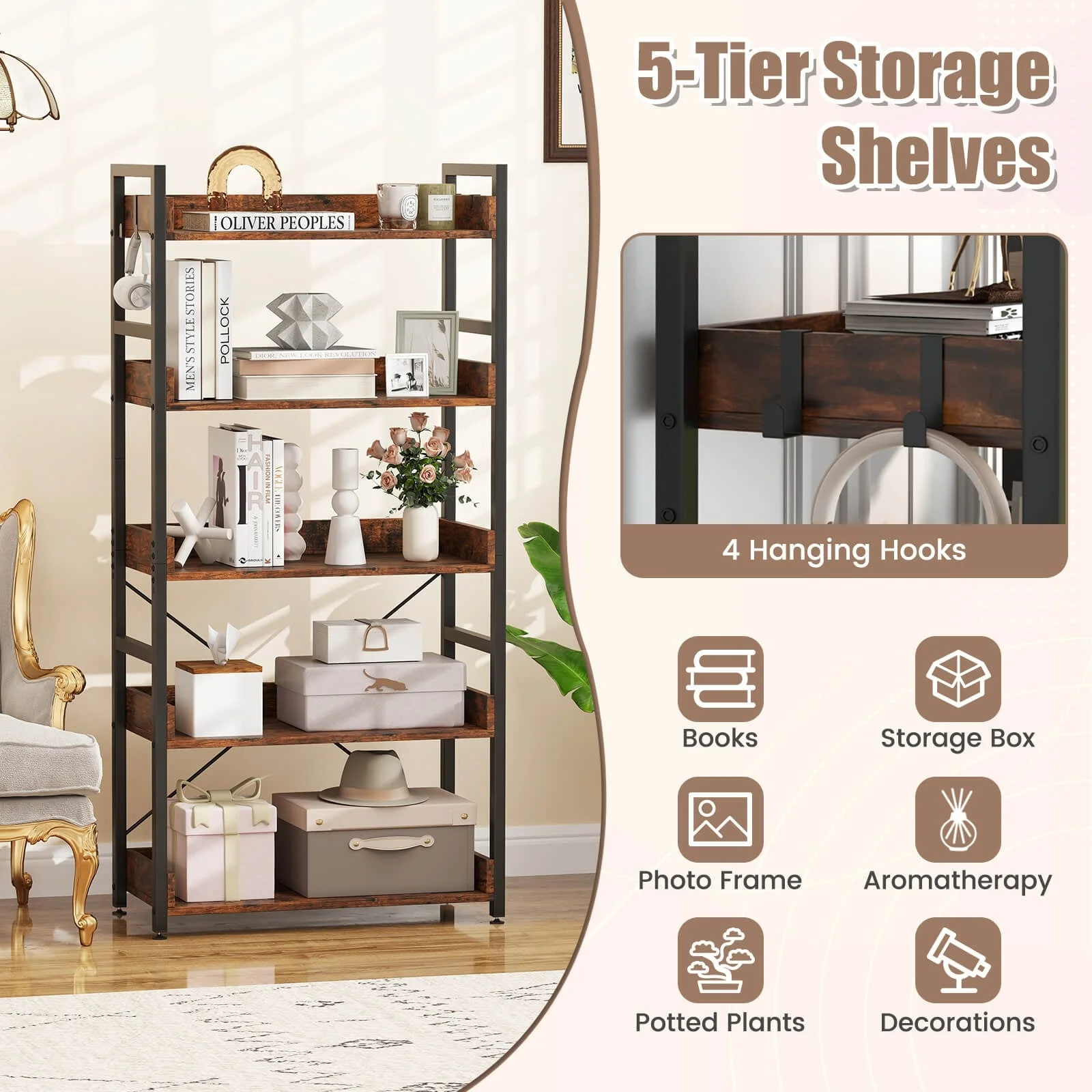• Costway 1/2 PCS 5-Tier Storage Rack with 4 Hooks Open Display Shelves