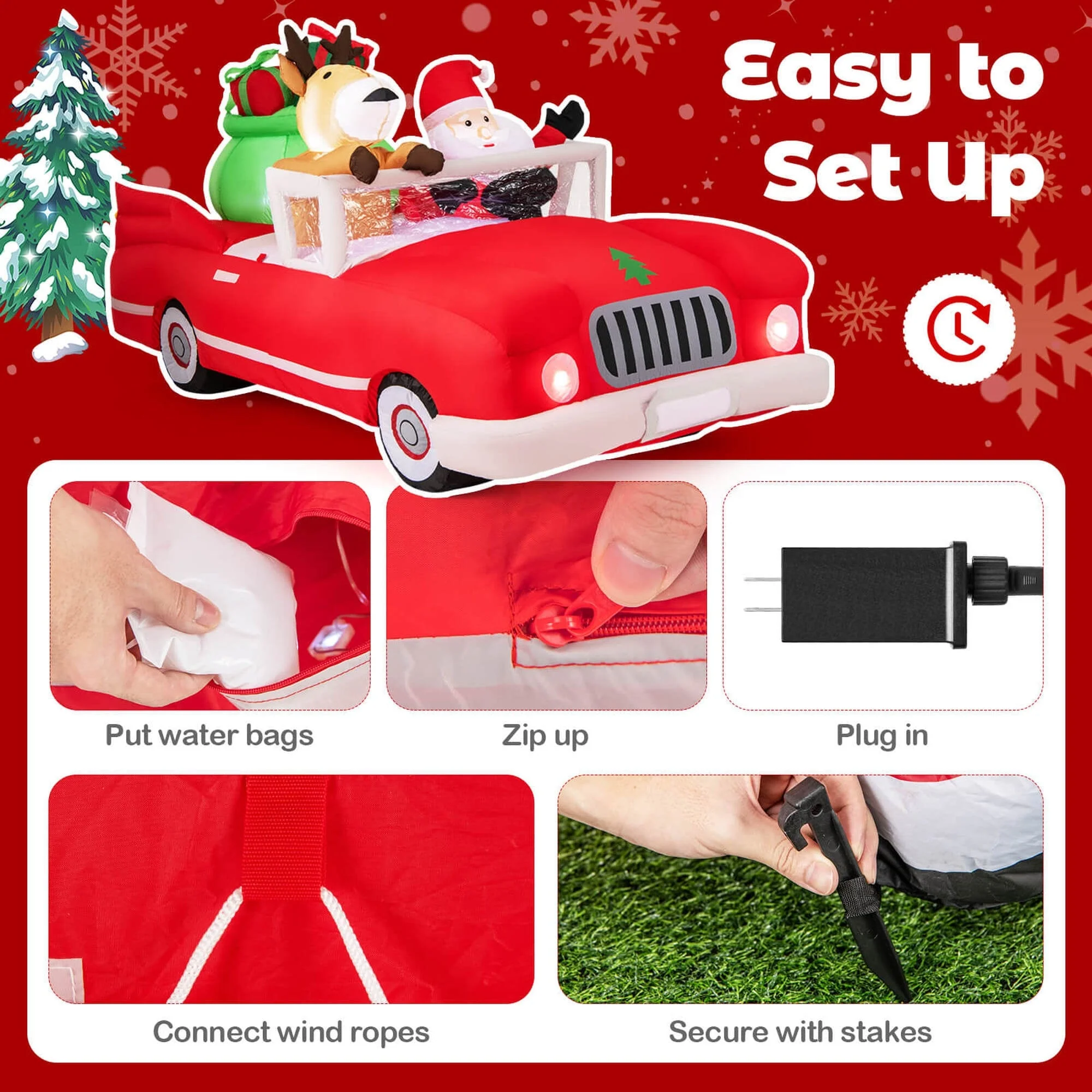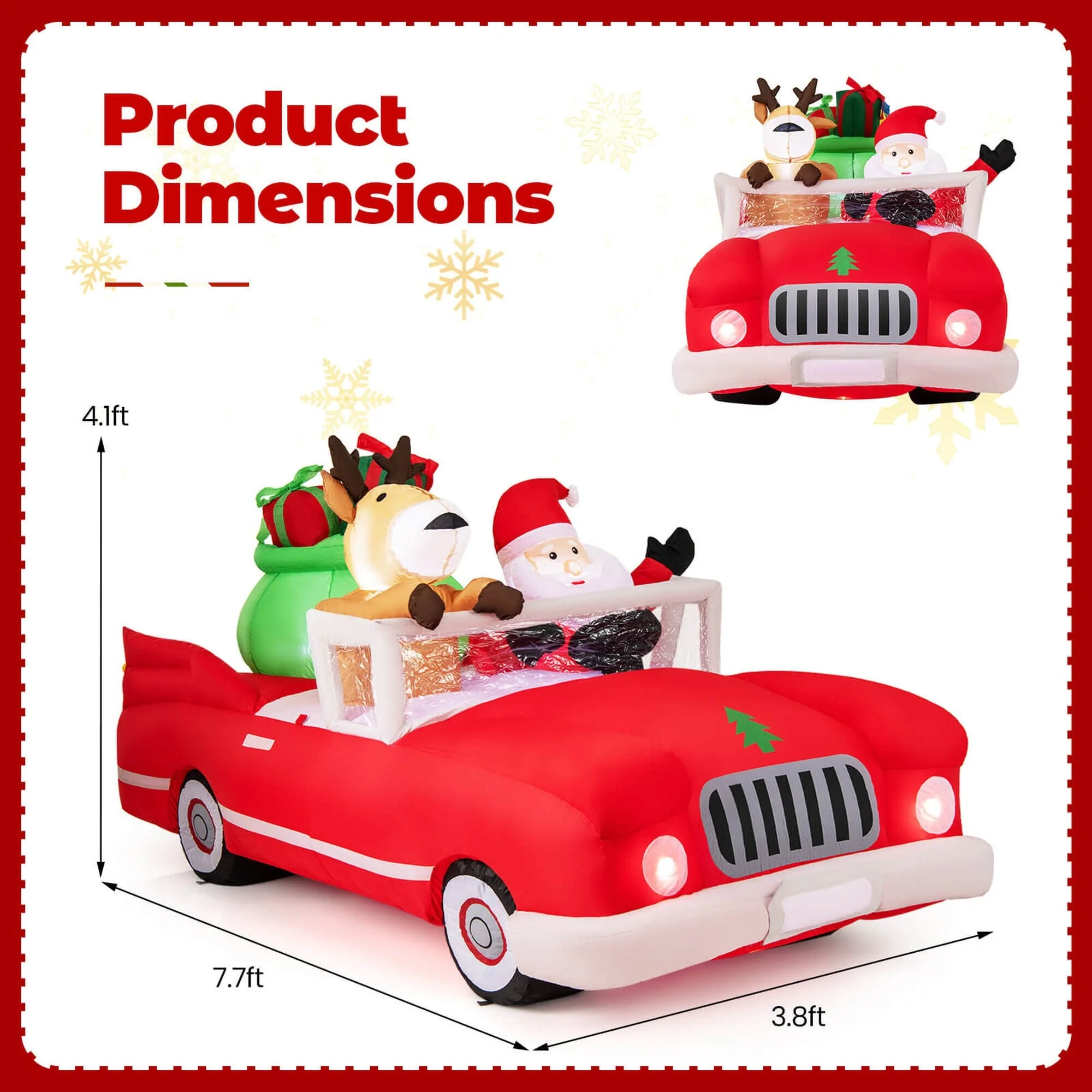Celebrate the festive season with our vibrant Christmas inflatable featuring Santa Claus and his reindeer joyously riding in a red car, complete with festive gift bags.