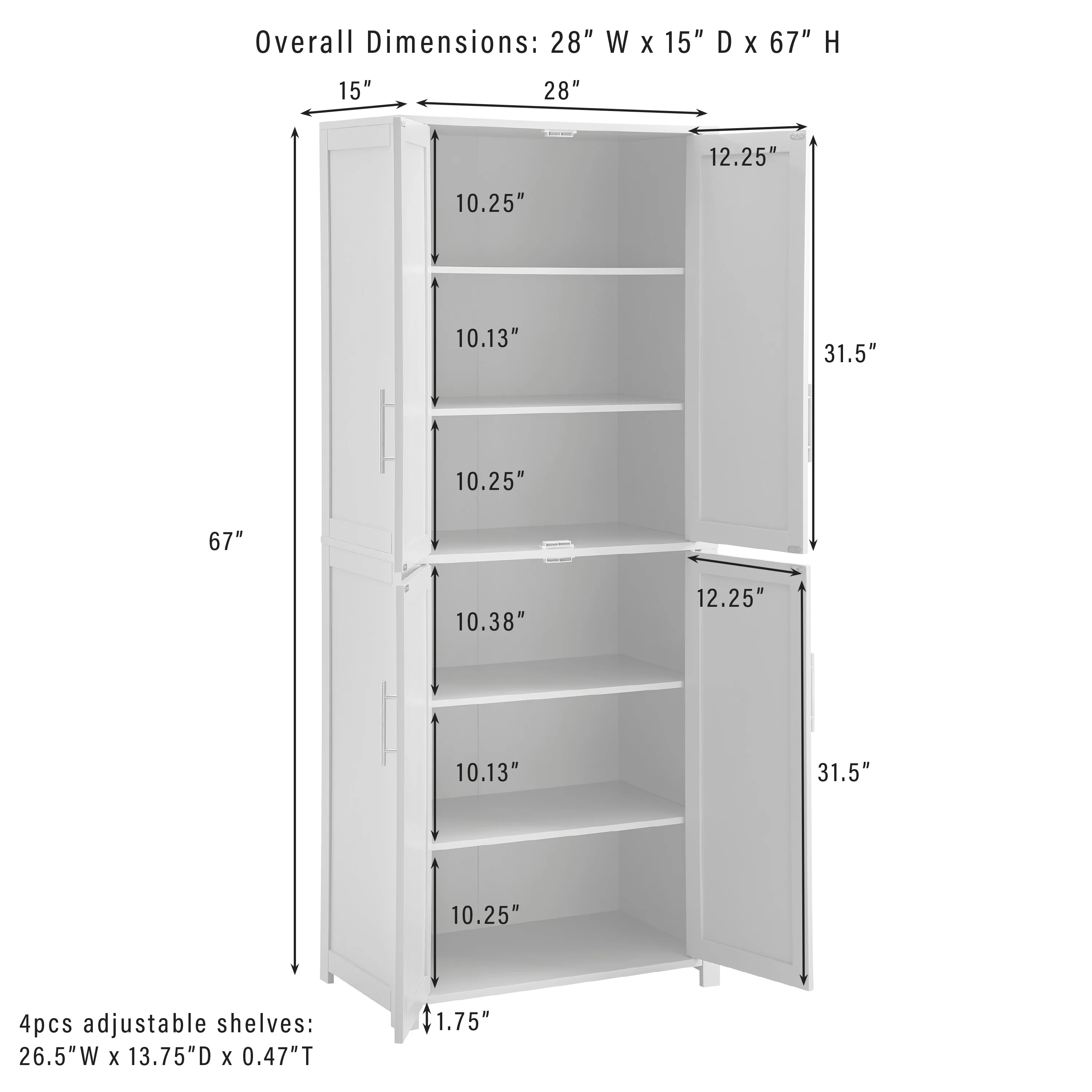 - Each storage cabinet has two adjustable shelves with a 15lb weight limit per shelf