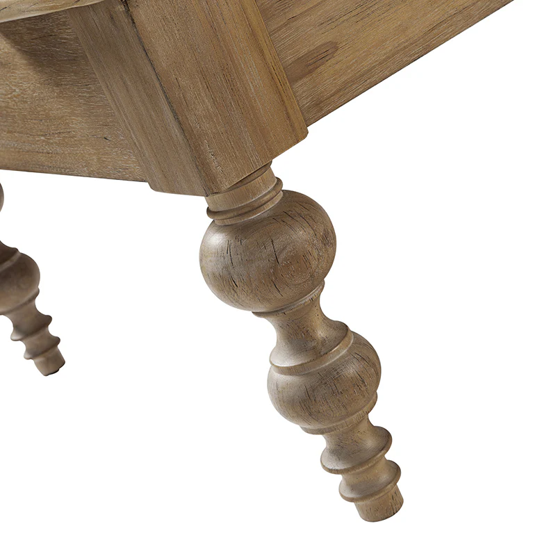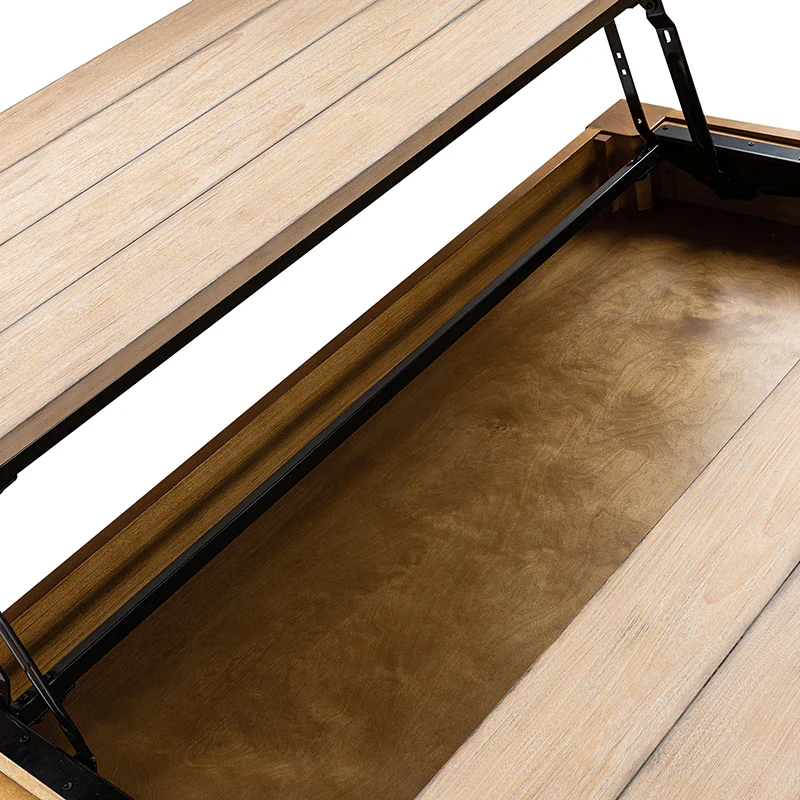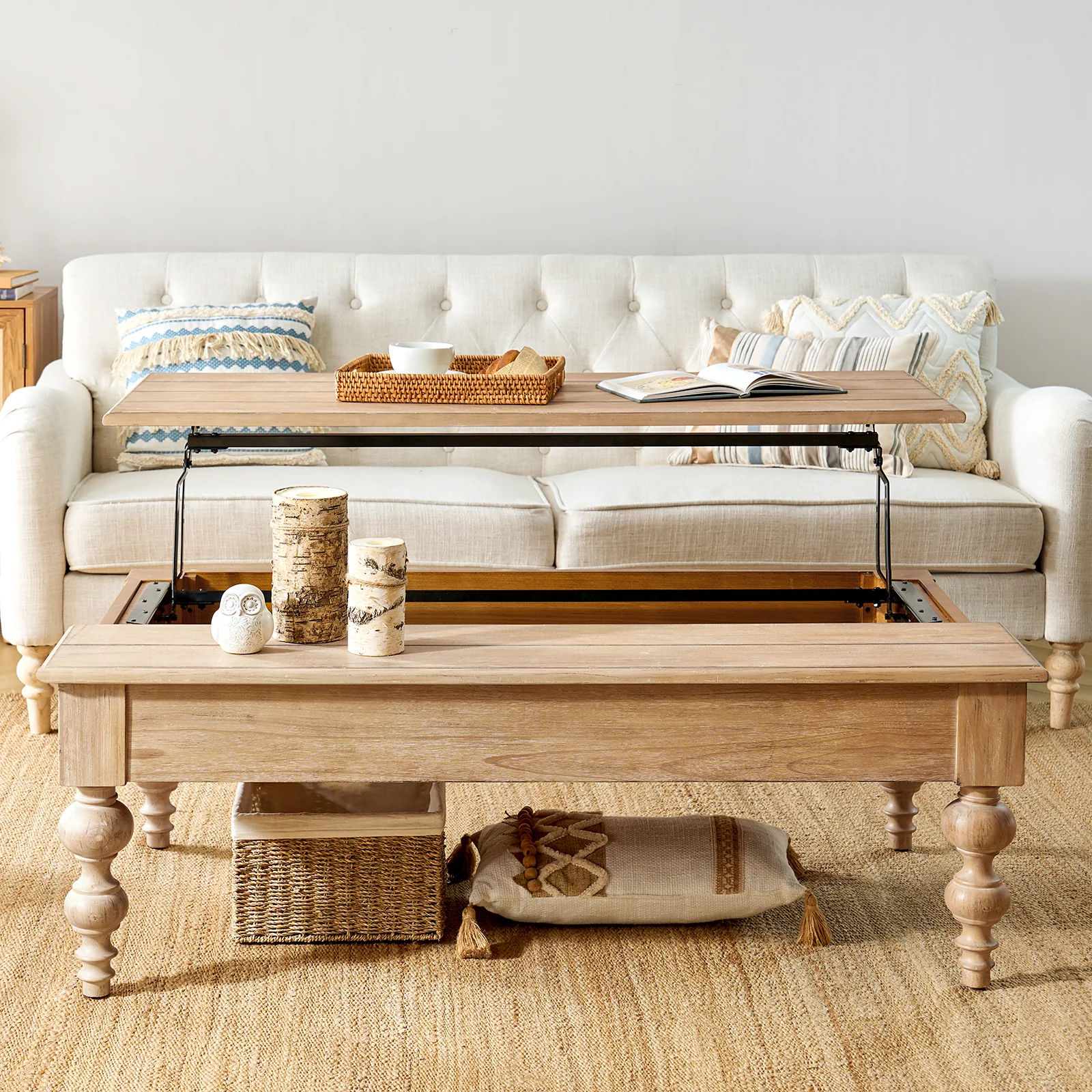 The lift-top coffee table with storage is a versatile and stylish addition to any living space. Handcrafted with attention to detail, this traditional piece combines farmhouse charm with a rustic and distressed finish. Constructed from solid rubber wood and MDF, it offers durability and longevity. Featuring elegant spindle legs, it adds a touch of sophistication to its design. The table's pop-up mechanism allows for easy lifting, revealing ample storage space underneath to keep your living area organized. Its timeless appeal complements a range of interior styles, from coastal and French country to lodge aesthetics. Enjoy the functionality and beauty of this handcrafted coffee table.