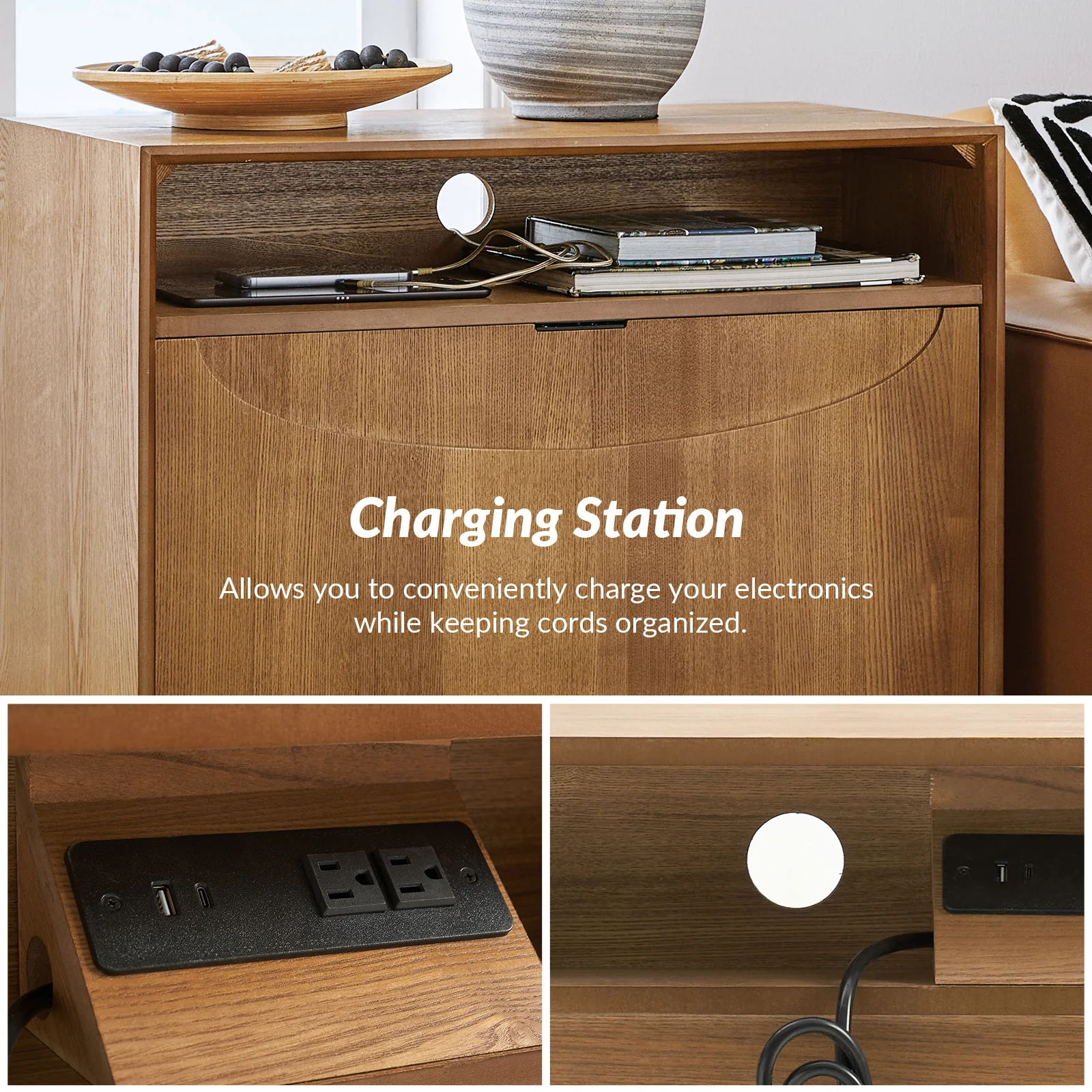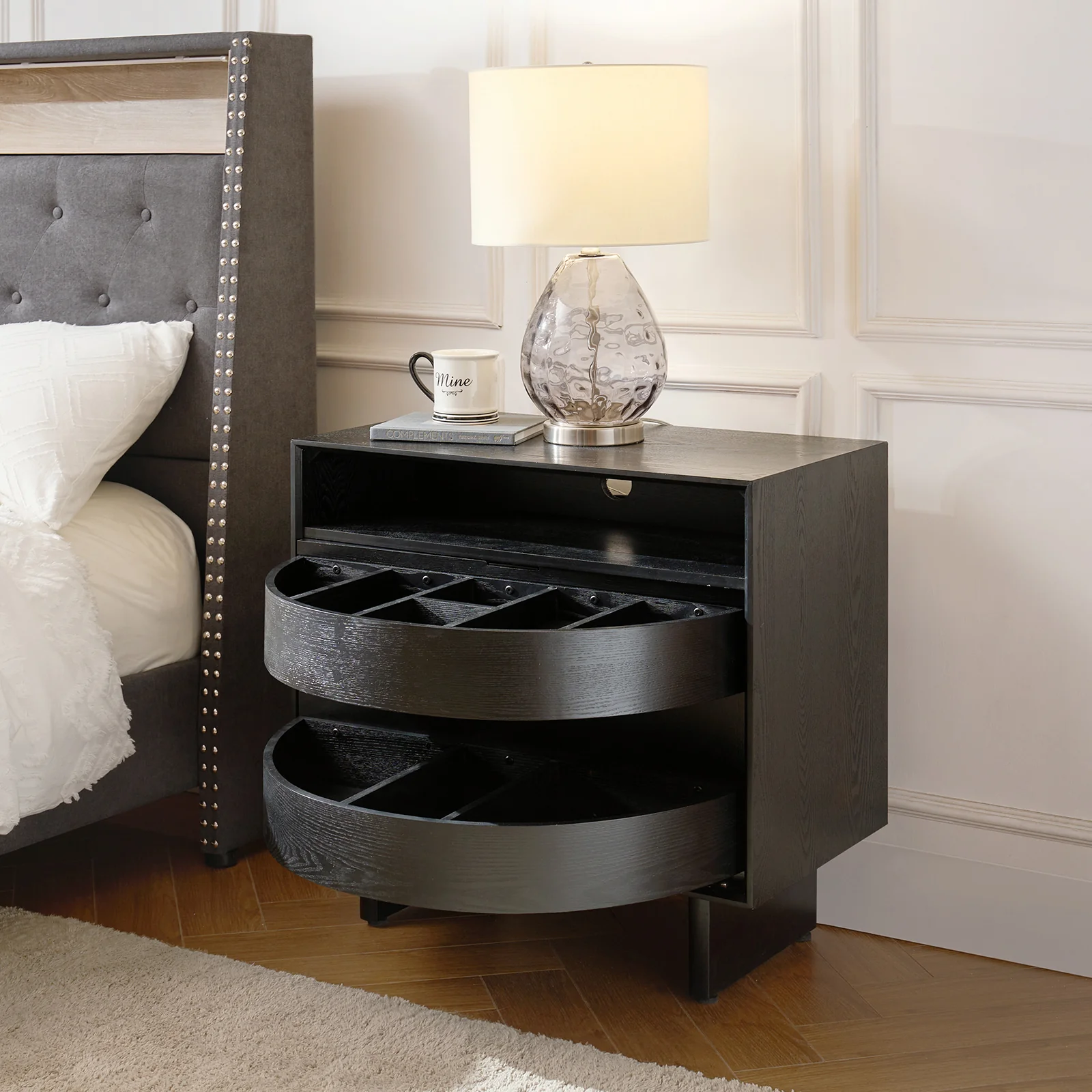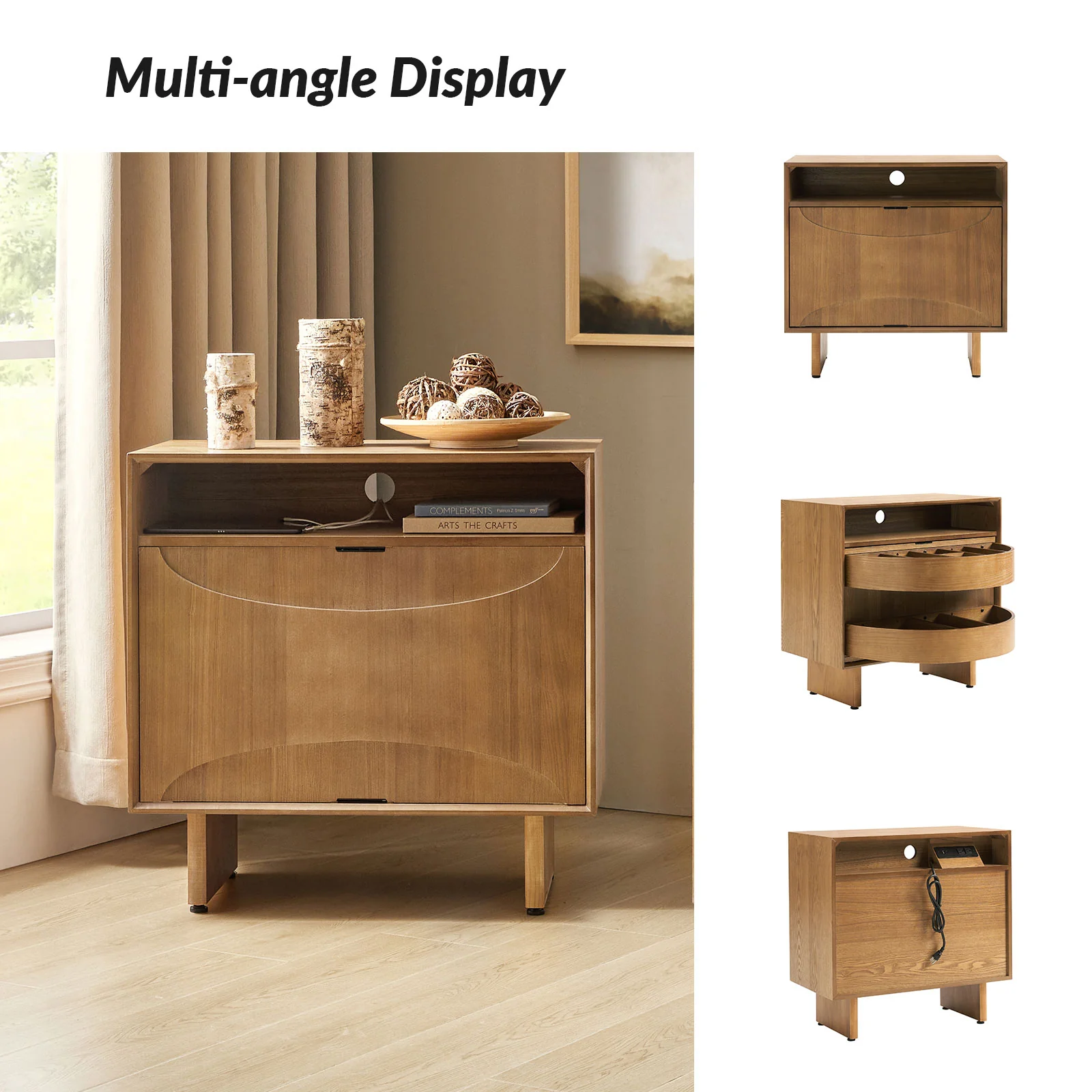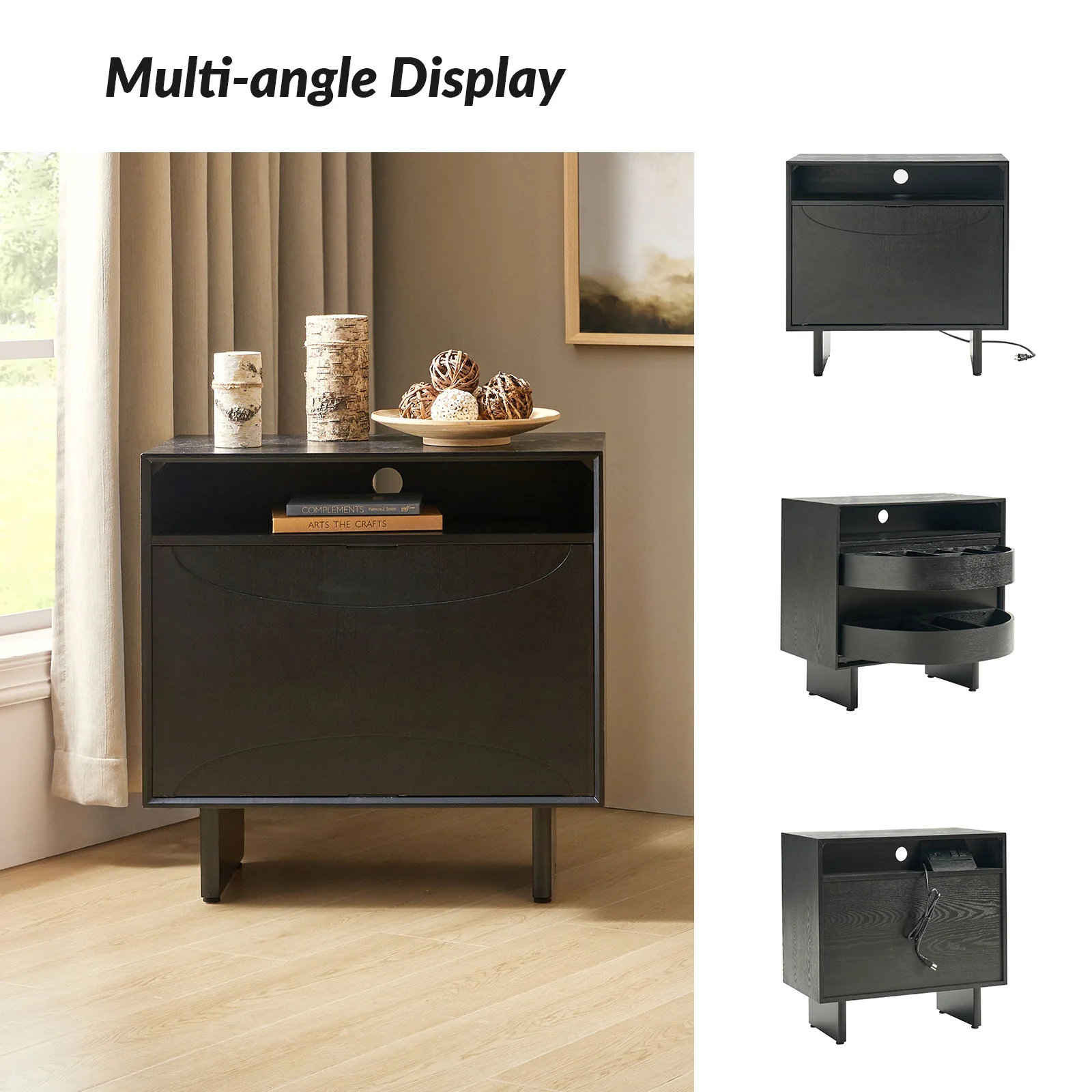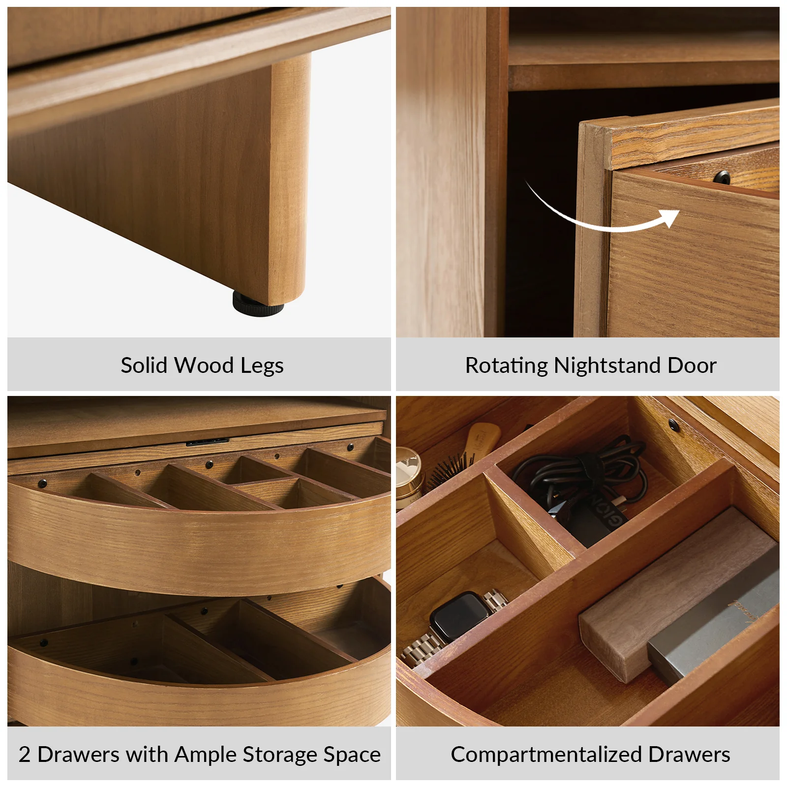 The tall nightstand embodies modern style with its sleek design and practical features. Crafted with solid wood legs, it exudes a sense of durability and sophistication. The rotating nightstand door offers easy access to storage while maintaining a clean aesthetic. Inside, compartmentalized drawers provide organization for various items. Equipped with built-in ports, it conveniently charges devices without cluttering the surface. Wire routing holes ensure tidy cable management, enhancing its functionality. Adjustable feet ensure stability on any surface, allowing for effortless installation. This nightstand seamlessly combines contemporary aesthetics with functional elements, making it a versatile addition to any modern bedroom space.