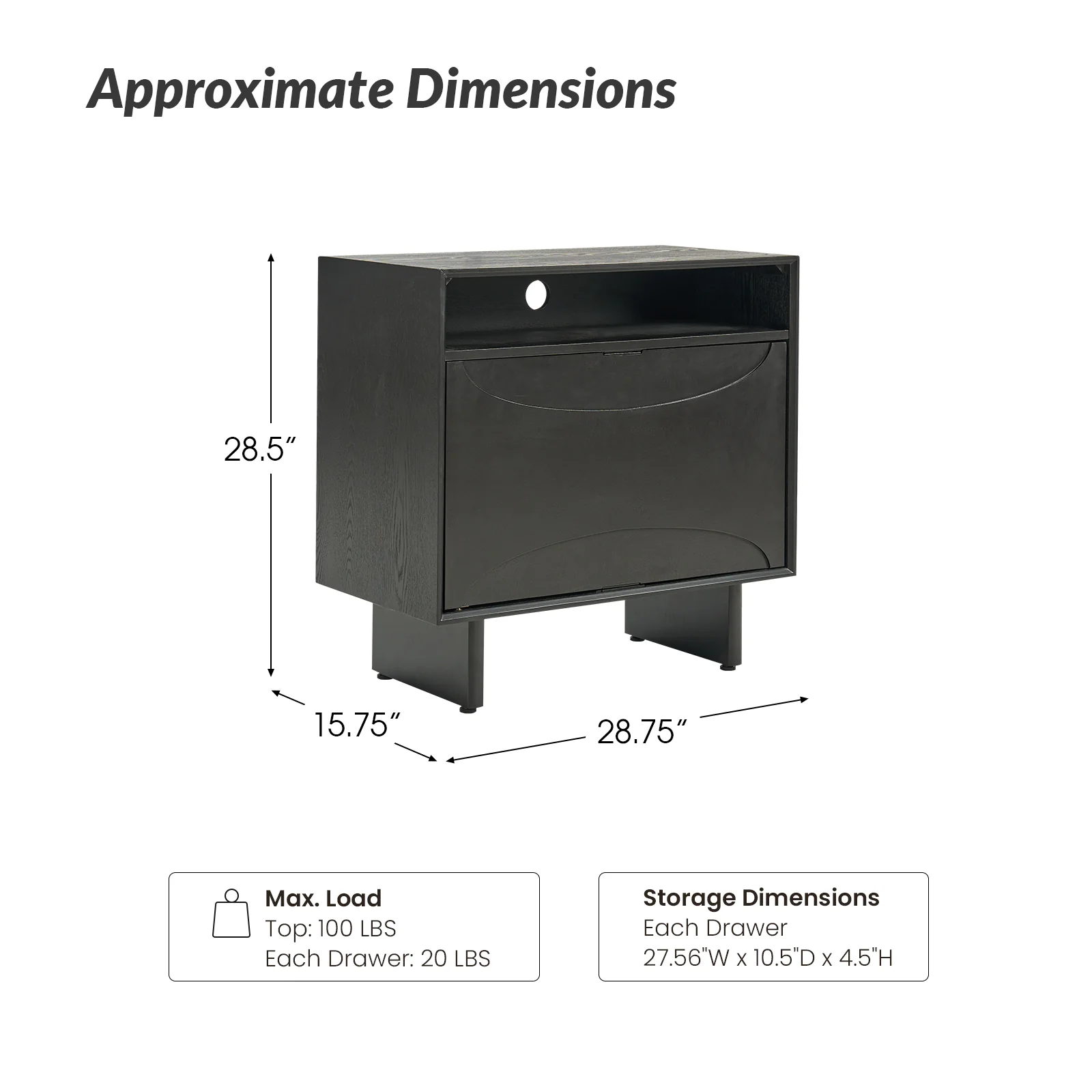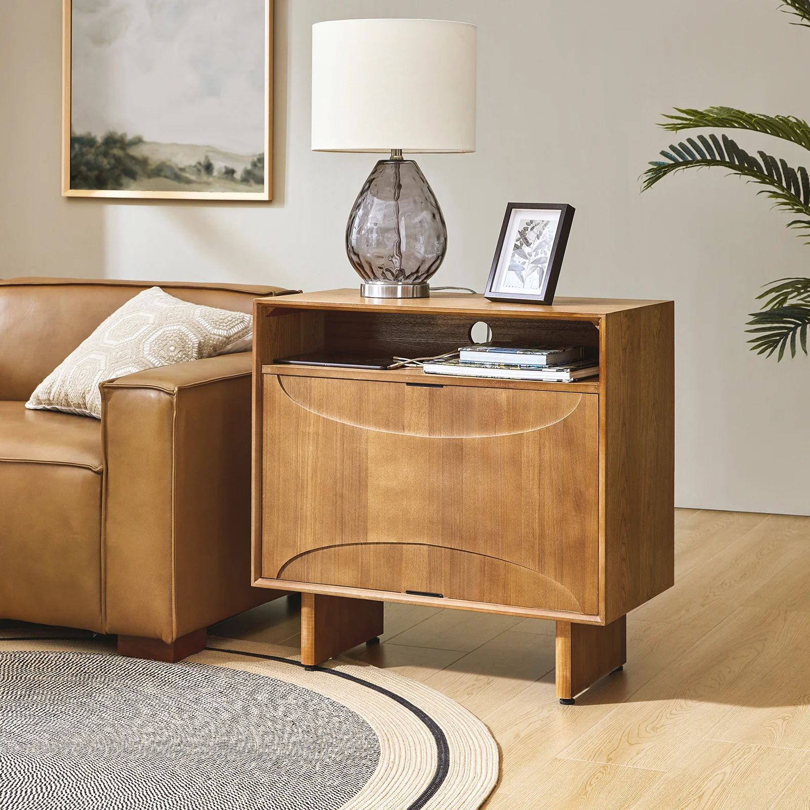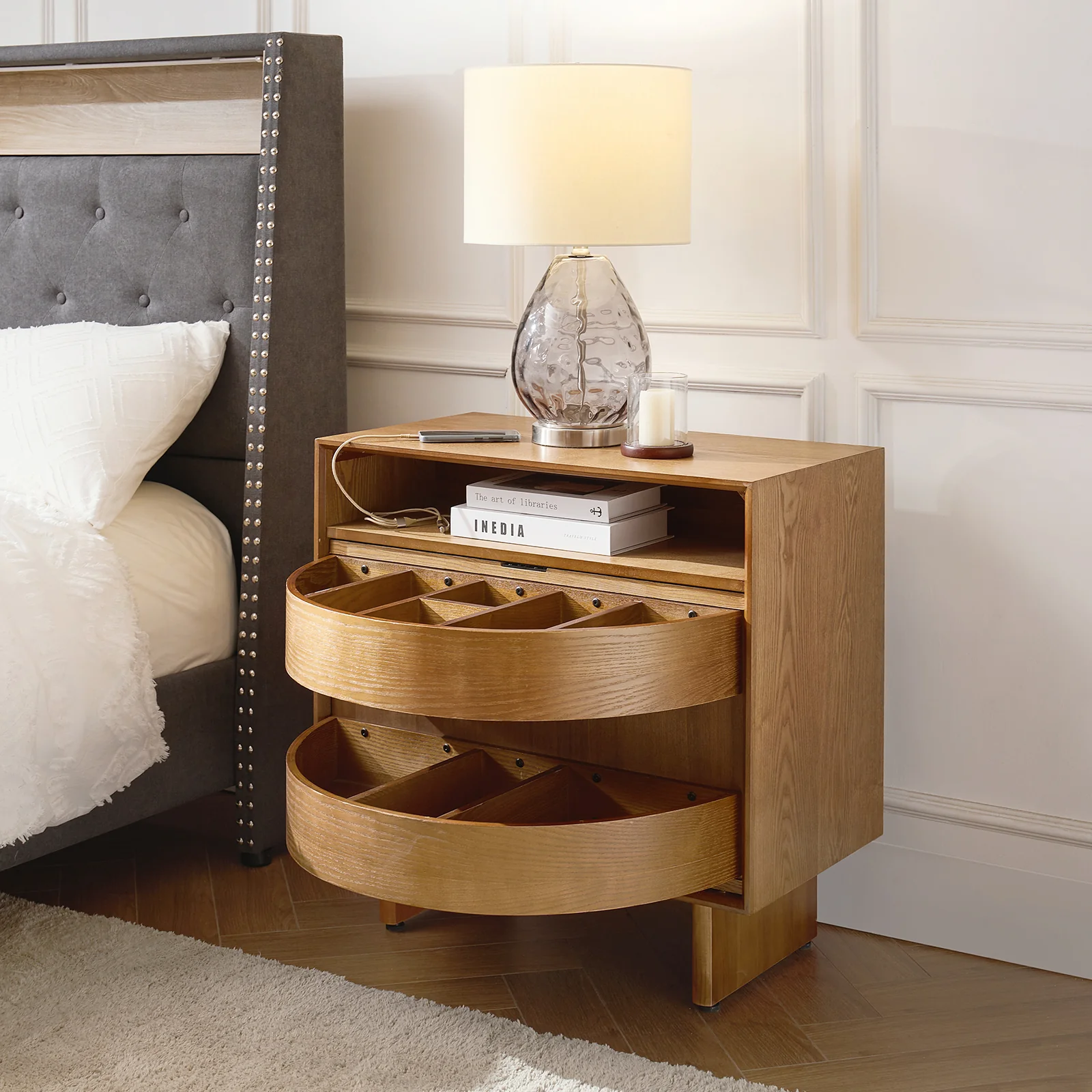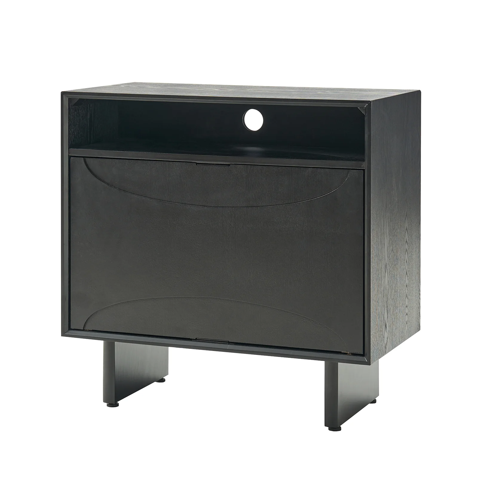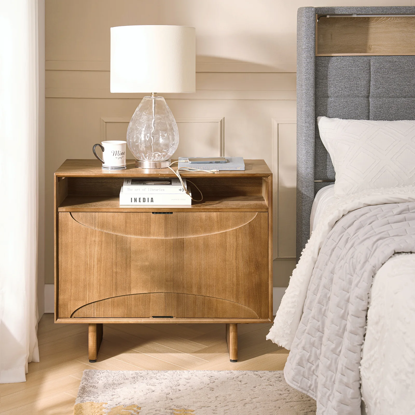 The tall nightstand embodies modern style with its sleek design and practical features. Crafted with solid wood legs, it exudes a sense of durability and sophistication. The rotating nightstand door offers easy access to storage while maintaining a clean aesthetic. Inside, compartmentalized drawers provide organization for various items. Equipped with built-in ports, it conveniently charges devices without cluttering the surface. Wire routing holes ensure tidy cable management, enhancing its functionality. Adjustable feet ensure stability on any surface, allowing for effortless installation. This nightstand seamlessly combines contemporary aesthetics with functional elements, making it a versatile addition to any modern bedroom space.