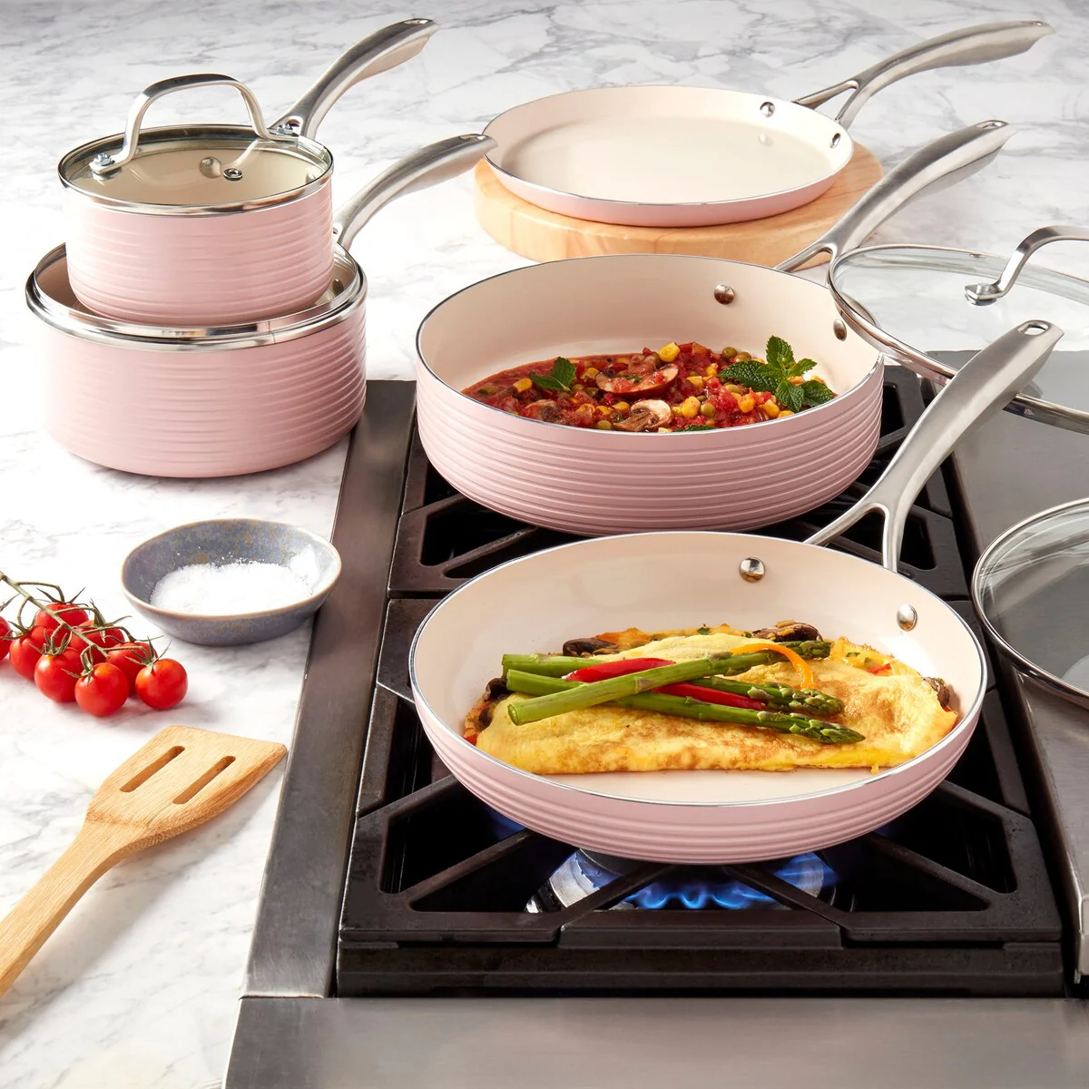 The 10PC non-stick aluminum cookware set from Denmark Tools for Cooks is beautifully designed and has been carefully crafted to uphold the stellar performance expected from high-quality cookware. This set couples superb non-stick coating with a durable aluminum construction that is ideal for daily use in high-traffic kitchens. The 10PC set includes everything necessary for a complete cookware collection. PFOA-Free non-stick coating provides incredible food release while easy to clean interior and exterior. Ergonomically designed handles provide a comfortable grip; tempered glass lids allow you to monitor the food without disturbing the cooking process.