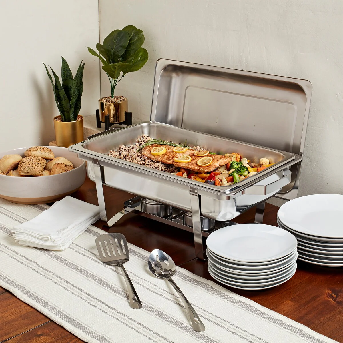 Denmark Tools For Cooks proudly introduces our high-quality chafing dishes and catering products designed to fulfill your entertaining needs, whether it's a small family gathering or a professional event. The 9.5 Quart Stainless Steel Rectangular Chafing Dish Set offers exceptional performance and elegant style, with superior heat distribution and heat retention guaranteed to keep food warm for hours. This set features a large, rectangular body that is perfectly suited for a variety of dishes and a hydraulic soft close lid for effortless serving.