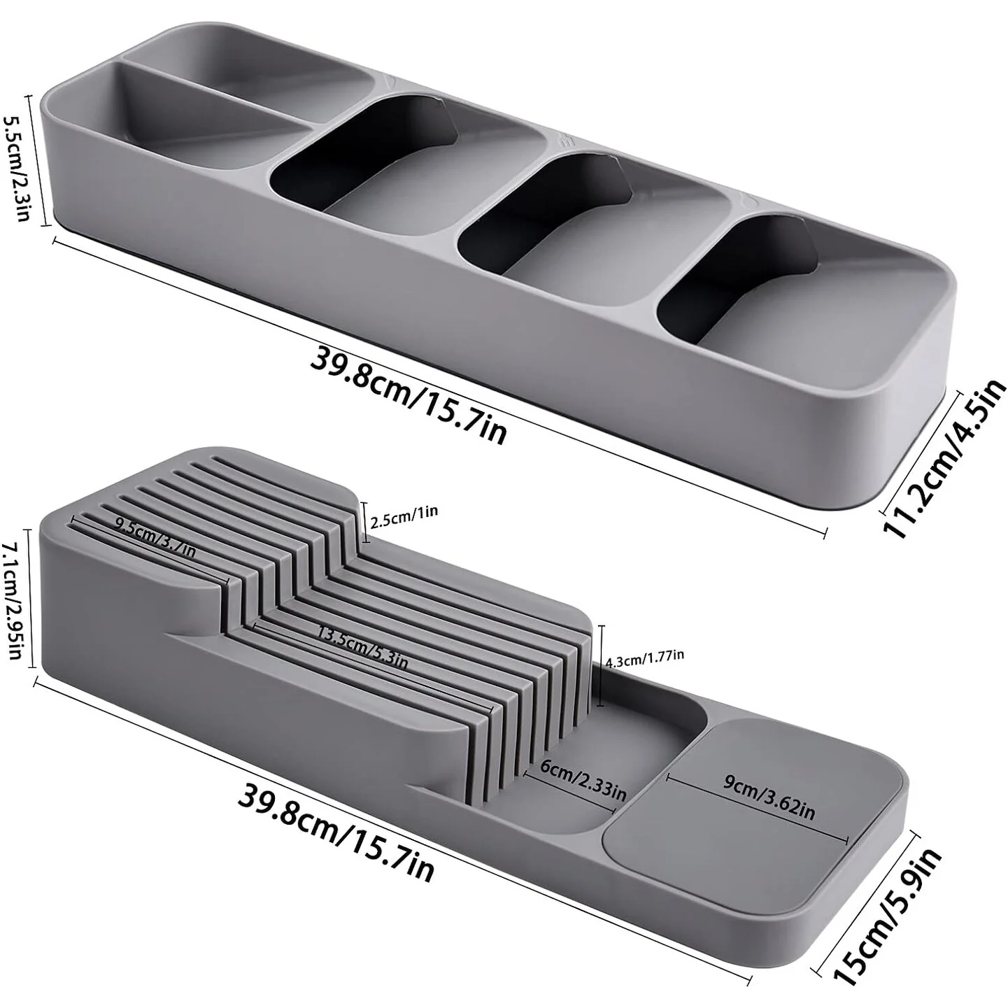 DIMENSION - Cutlery Organizer and Knife Organizer.The size of the Knife Organizer: length 15.7" x width 5.9" x height 2.95", and the size of the cutlery organizer is: length 15.7" x width 4.5" x height 2.3".