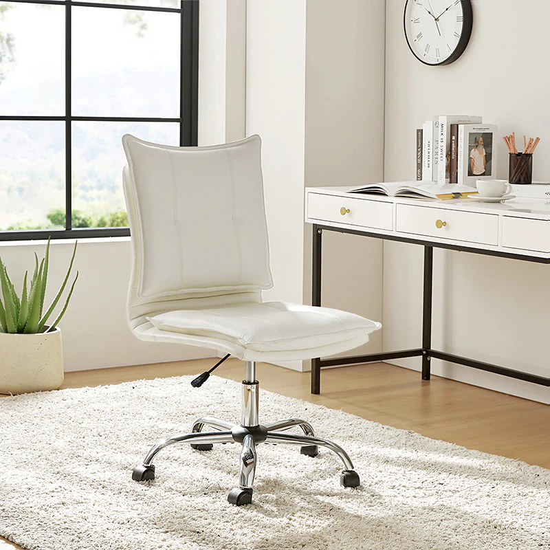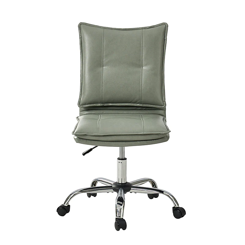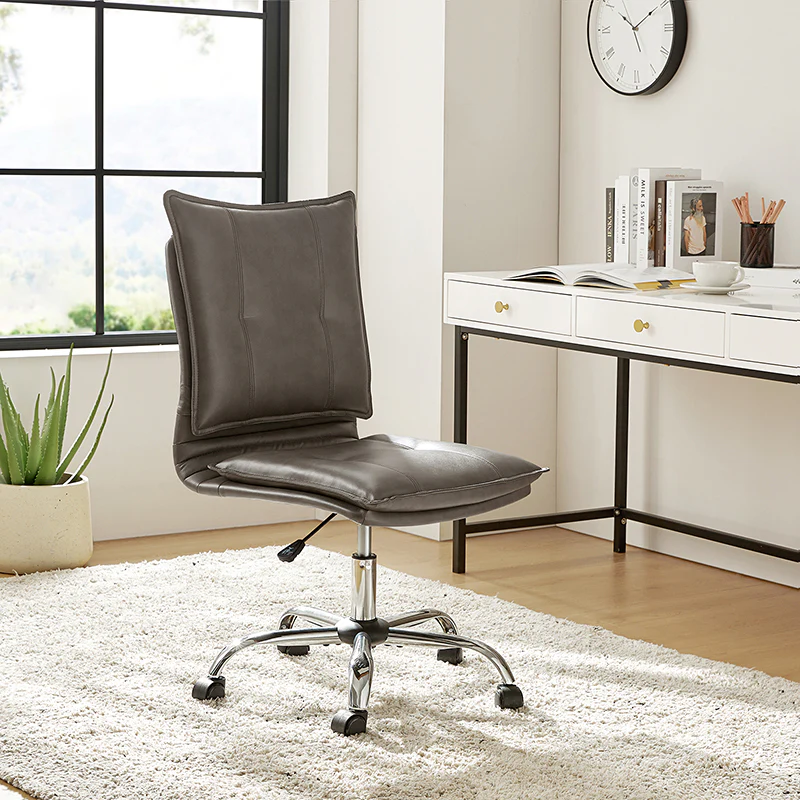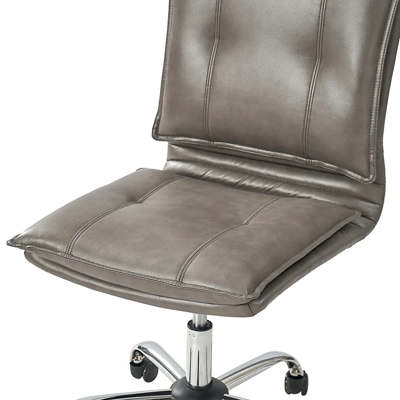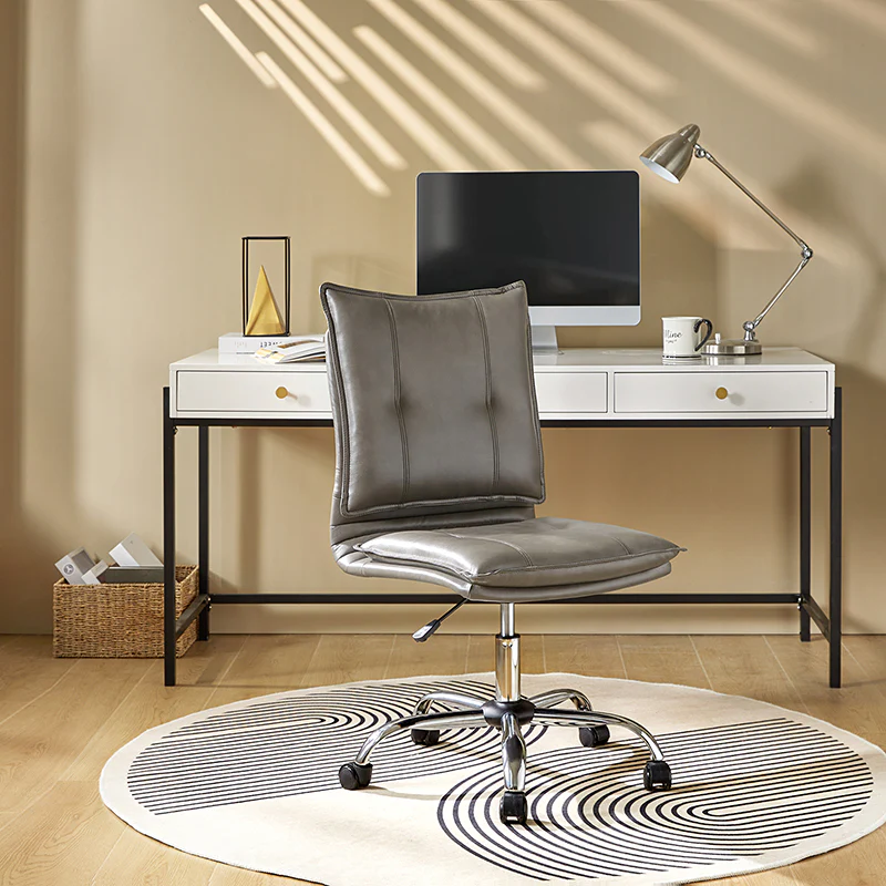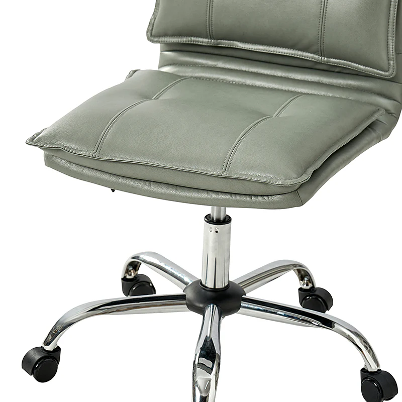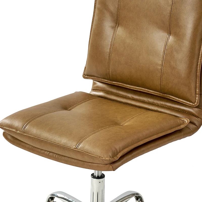Experience modern comfort with this contemporary office chair. Upholstered in luxurious faux leather, it exudes a sleek and sophisticated vibe. The metal base ensures durability and stability, while the comfy tufted backrest adds a touch of elegance to your workspace. Enjoy flexibility with its swivel seat and easily adjust the seat height to your preference. The chair is equipped with an SGS International Certified Stainless Steel Gas Spring, providing three levels of reliable adjustment. Elevate your office aesthetics and comfort with this stylish and functional piece that seamlessly blends modern design with ergonomic features.