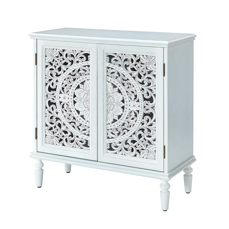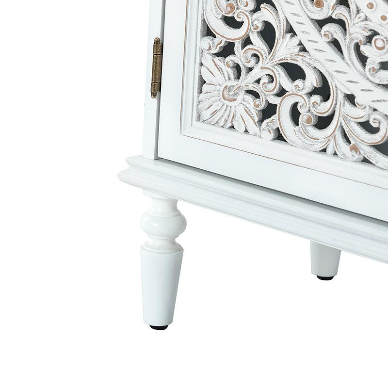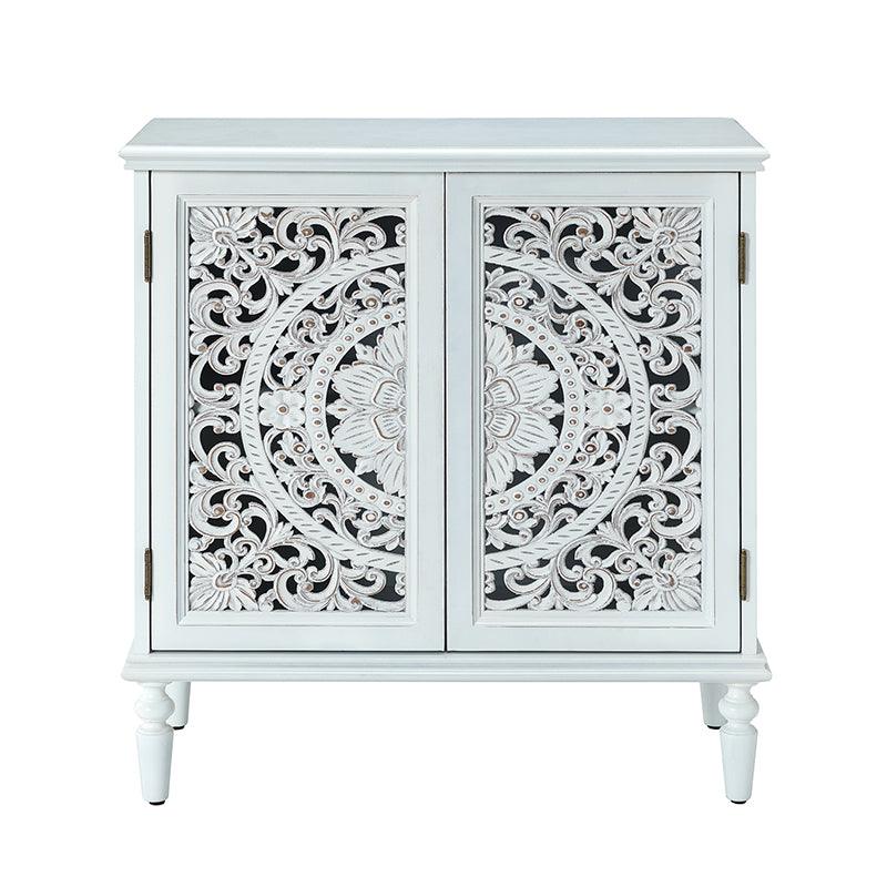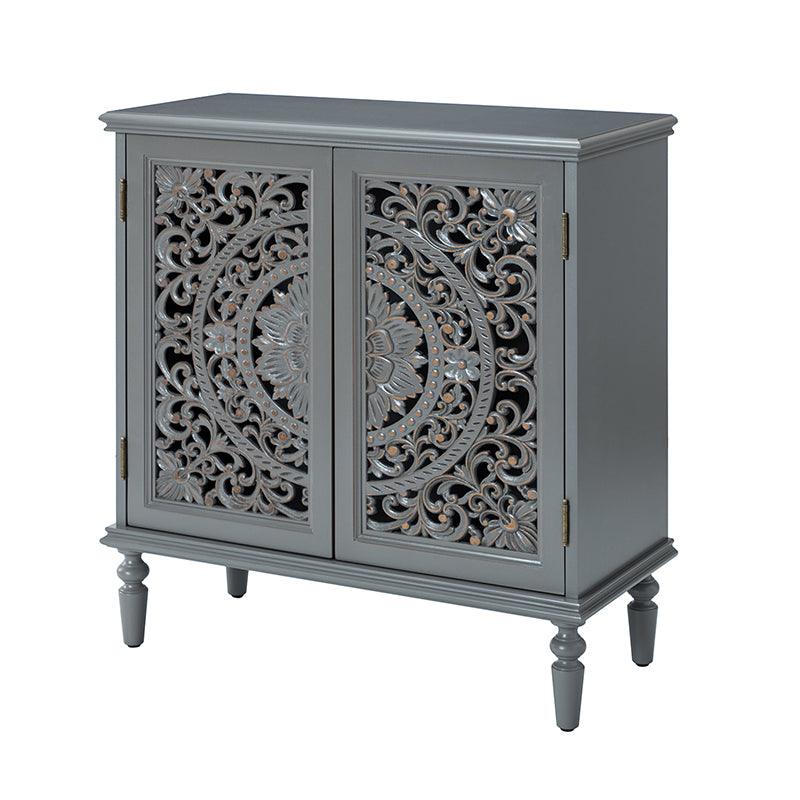 A sleek addition to your bedroom or living space, this transitional cabinet sports an elegant look that's fit for any aesthetic. The two cabinet doors have a carved floral design to add a touch of flair to your drab living space. The interior of the cabinet has a fixed shelf that divides the interior space into two sections to provide space for what you need. Four turned legs firmly support the whole cabinet, so you don't have to worry about his weight-bearing problem when you put a lot of things. Meanwhile, the flat top surface is the perfect area to put potted plants, books and other things. The streamlined design makes it a versatile piece that ideal in smaller spaces, whether in a sitting area or next to a bed.