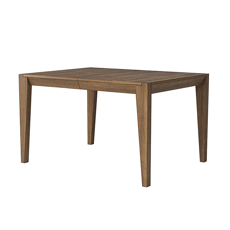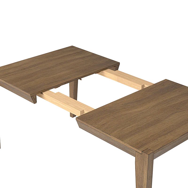 With a crisp silhouette, the dining table combines natural and man-made elements for a striking composition. Crafted with a solid wood frame, this table exudes the durability and natural beauty of timber. The table is equipped with solid wood rails, providing reliable support and stability for all your dining experiences. The piece features an ingenious design, including a single PC middle leaf, allowing you to effortlessly extend the table to accommodate extra guests. Whether planning a cozy dinner for two or a grand gathering, this mid-century modern expandable table adapts to your needs with grace and style. Enhance your dining area with a harmonious fusion of design and use, creating a captivating place for memorable meals and gatherings.