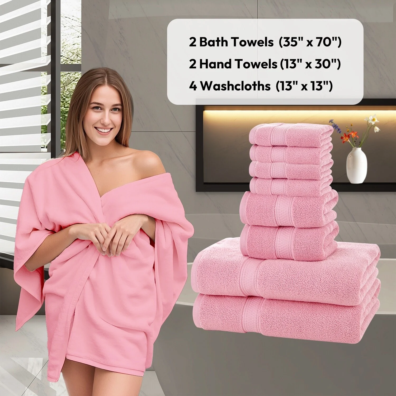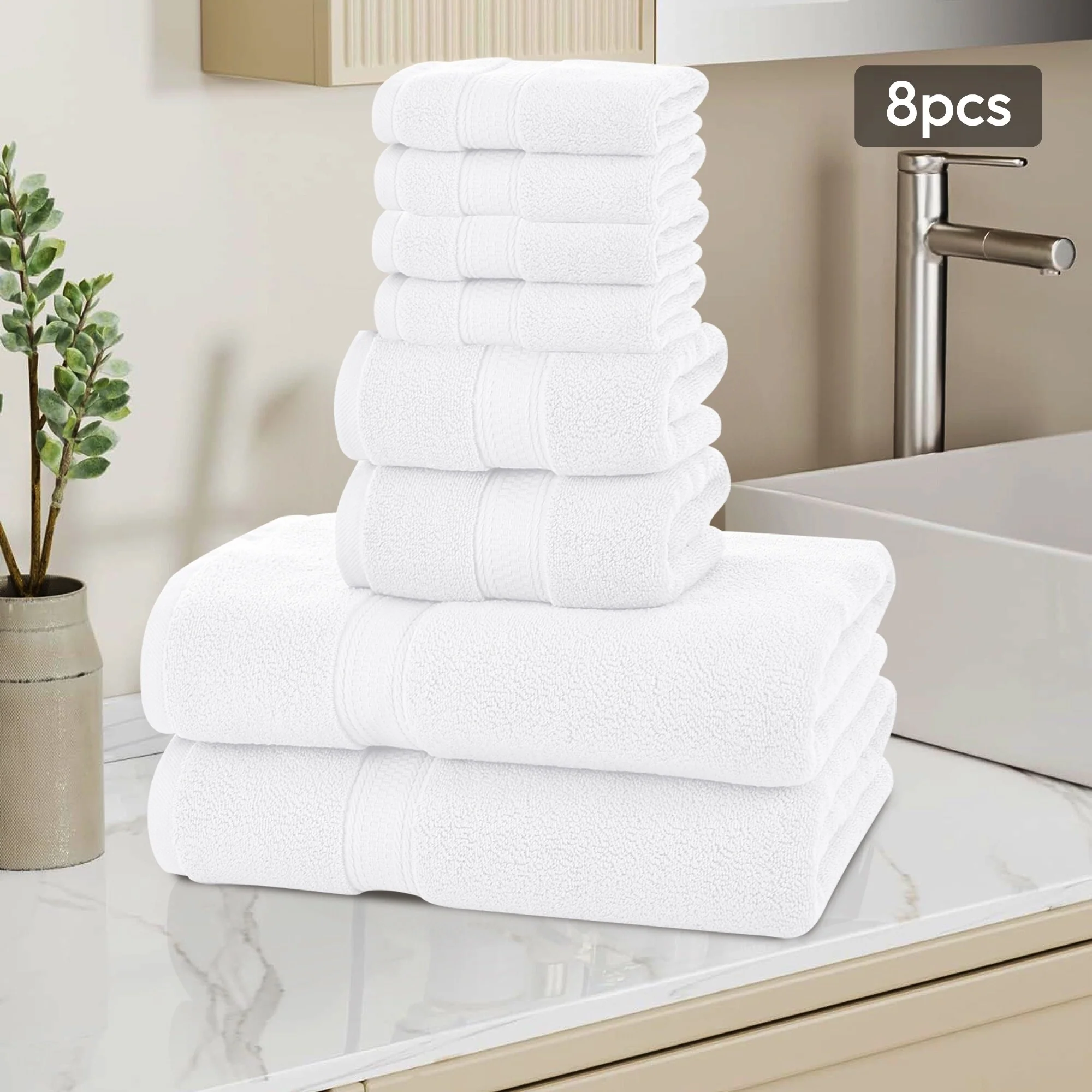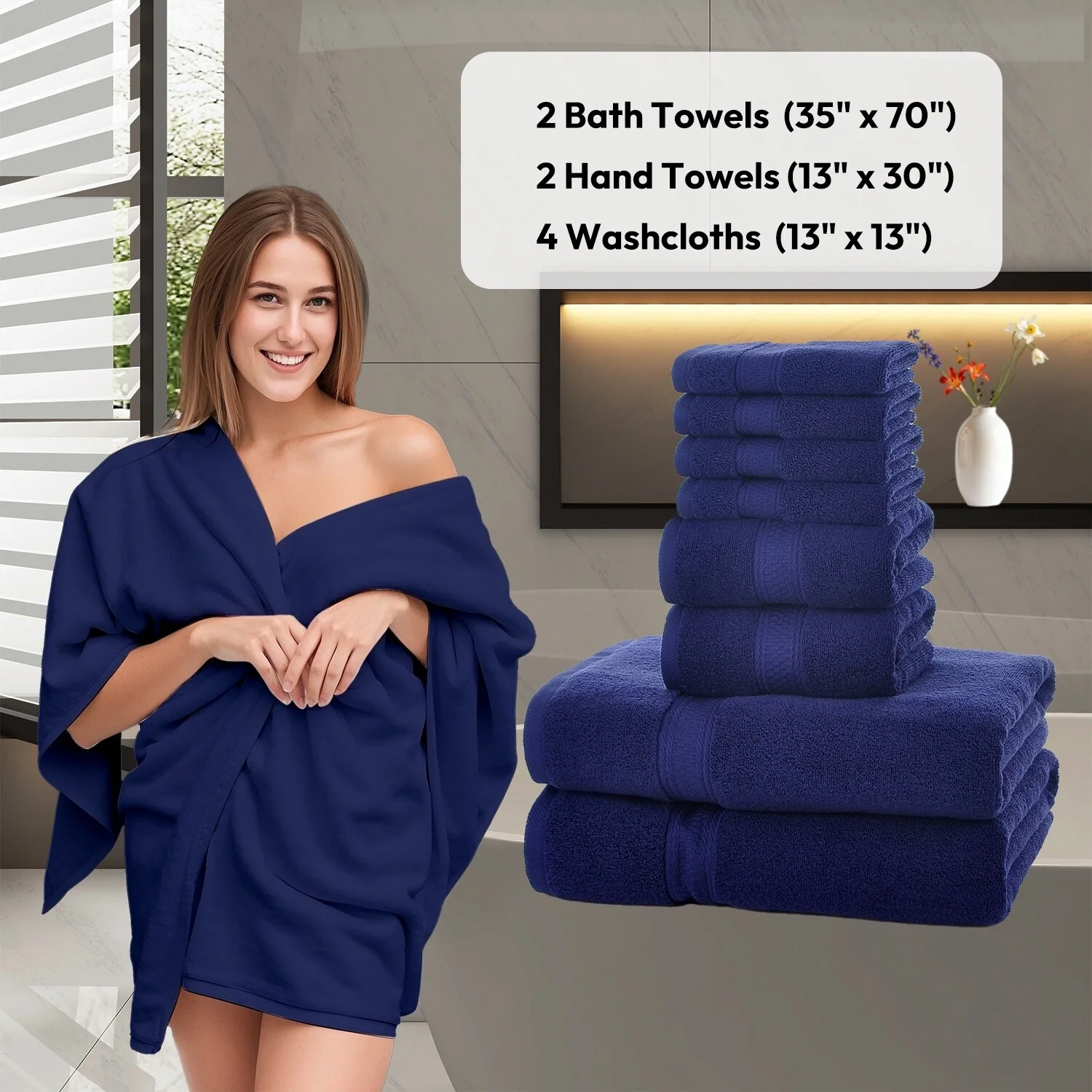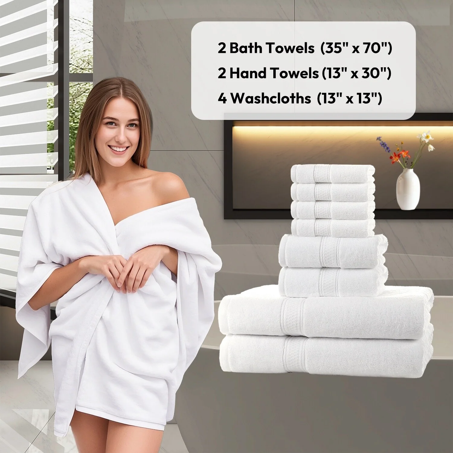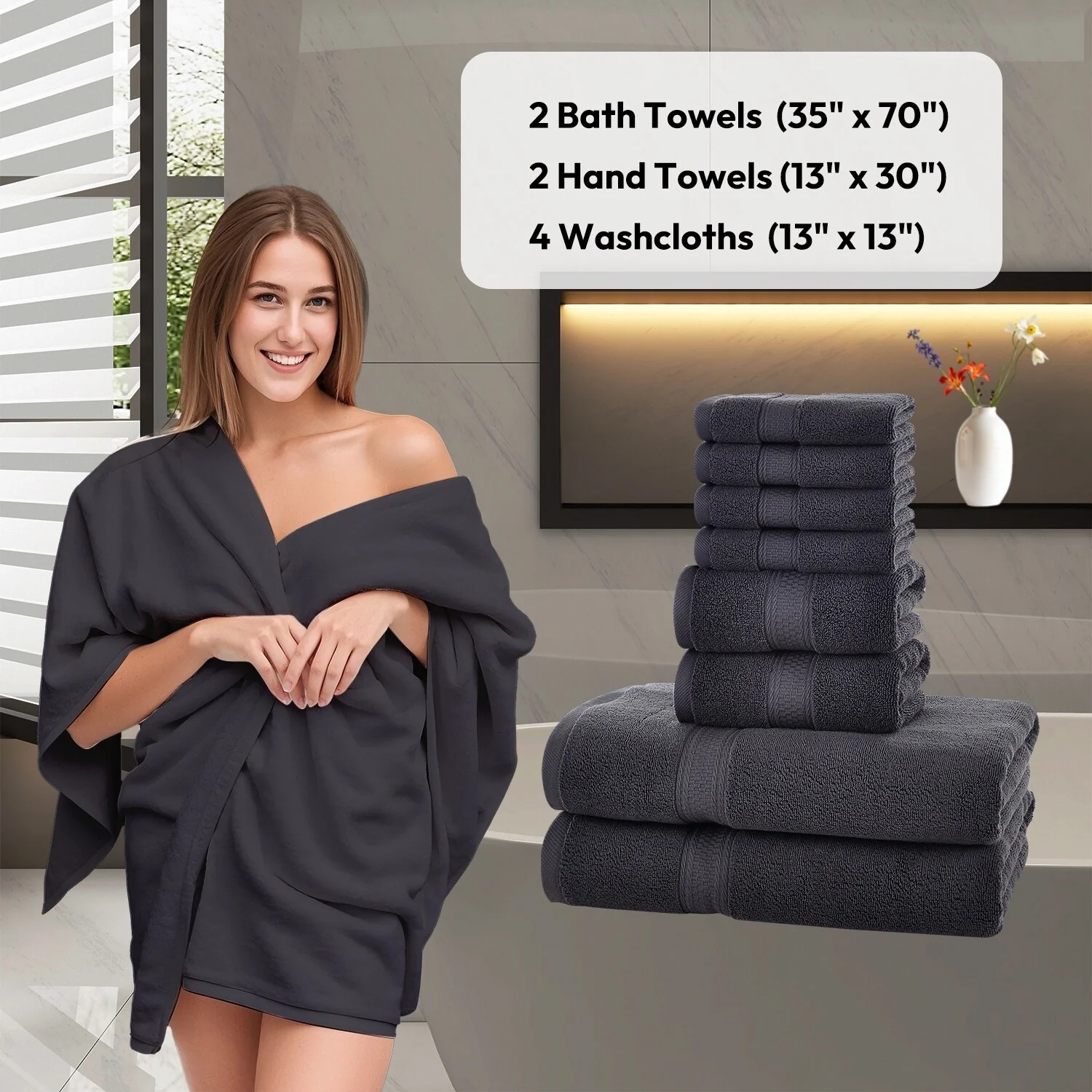 Hotel Collection - 8-Piece bathroom towel set contains 2 EXTRA LARGE bathroom towels (35 x 70 inches), 2 hand towels (13 x 30 inches), and 4 washcloths (13 x 13 inches); Each towel is spun from 100% cotton - durable, quick-dry, and wonderfully absorbent.