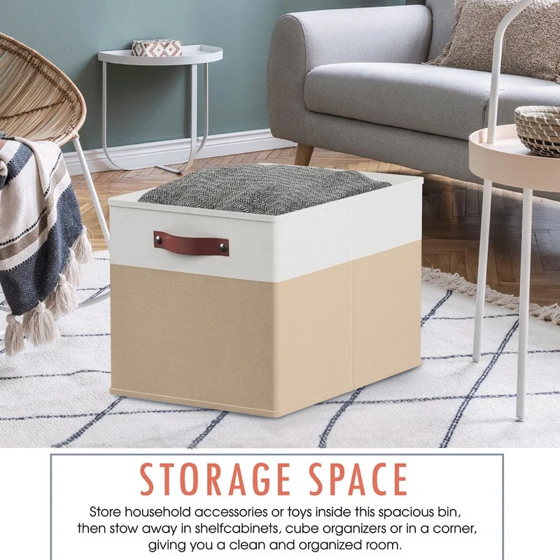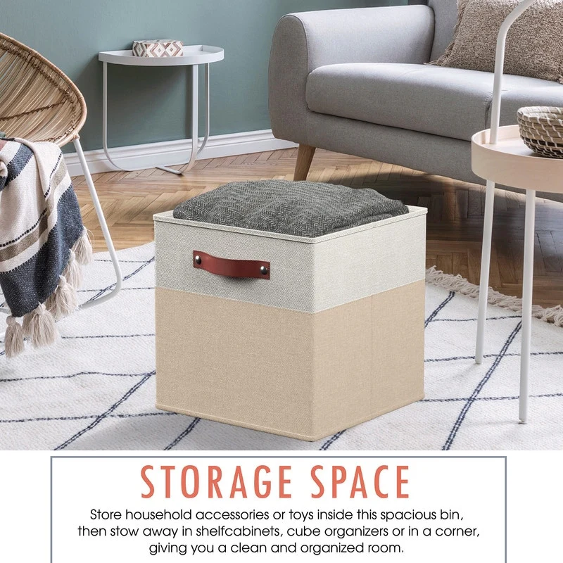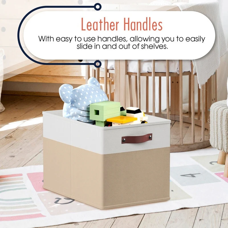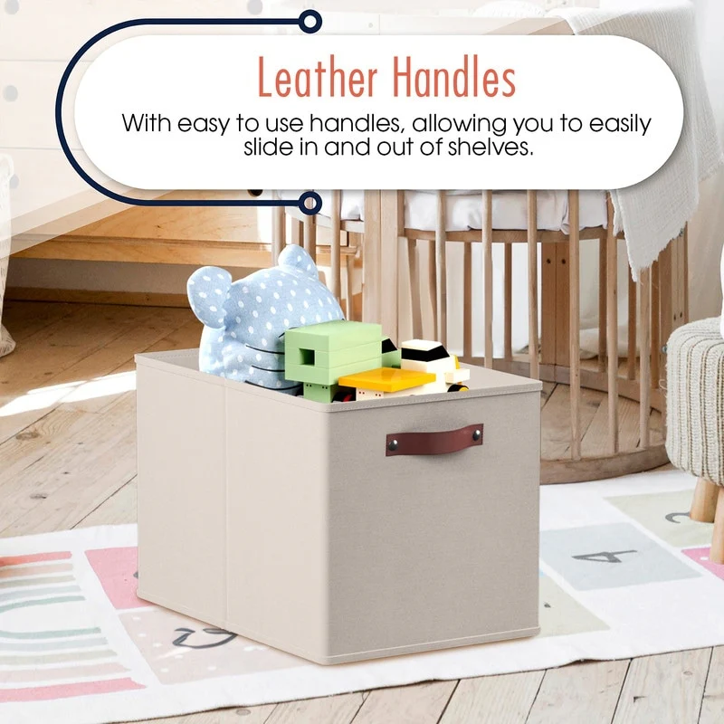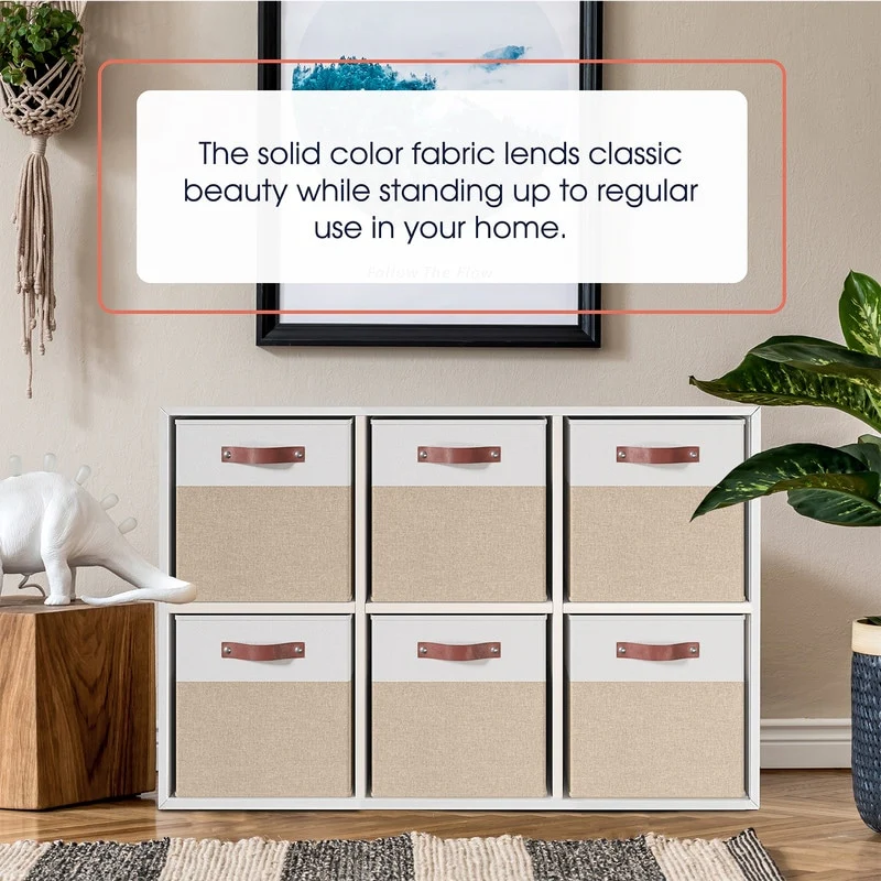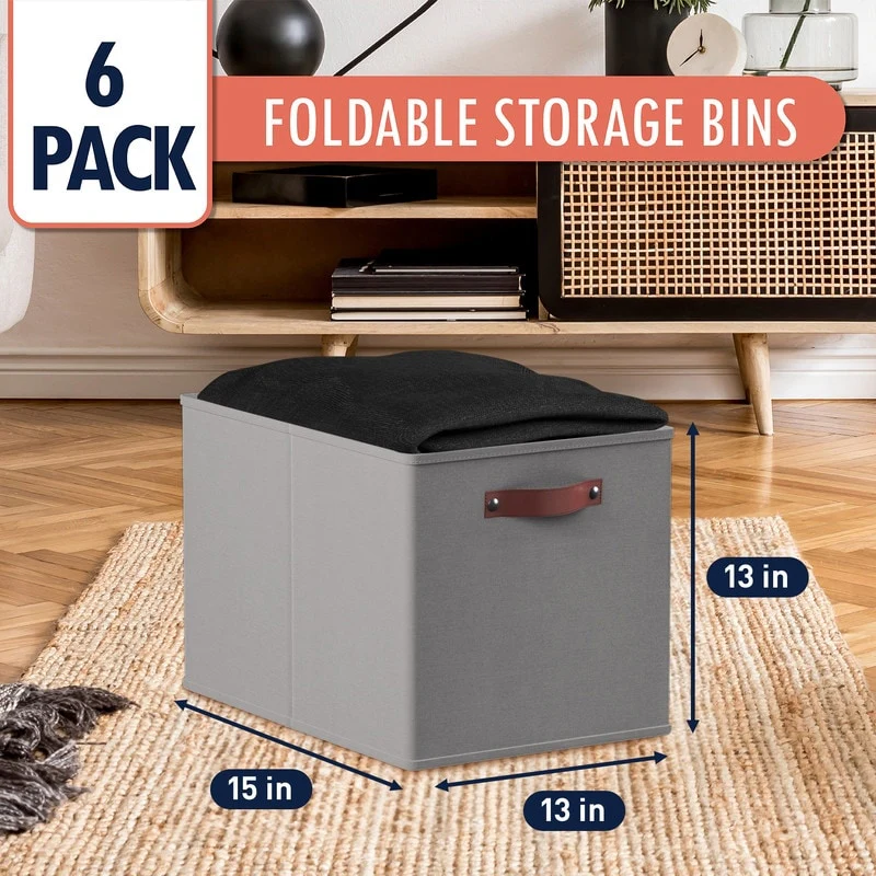 • Foldable Collapsible Storage Box Bins Linen Fabric Shelf Basket Cube Organizer with Leather Handles - Set of 6