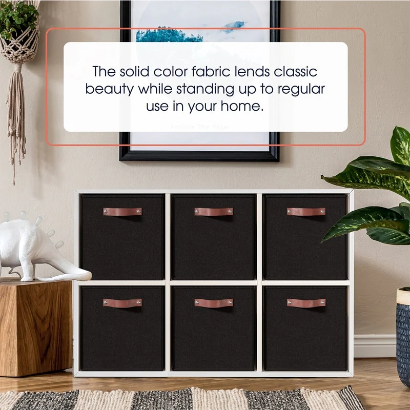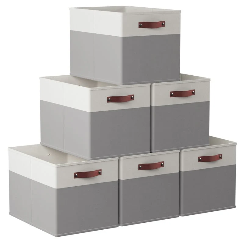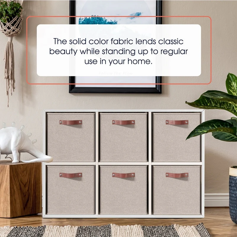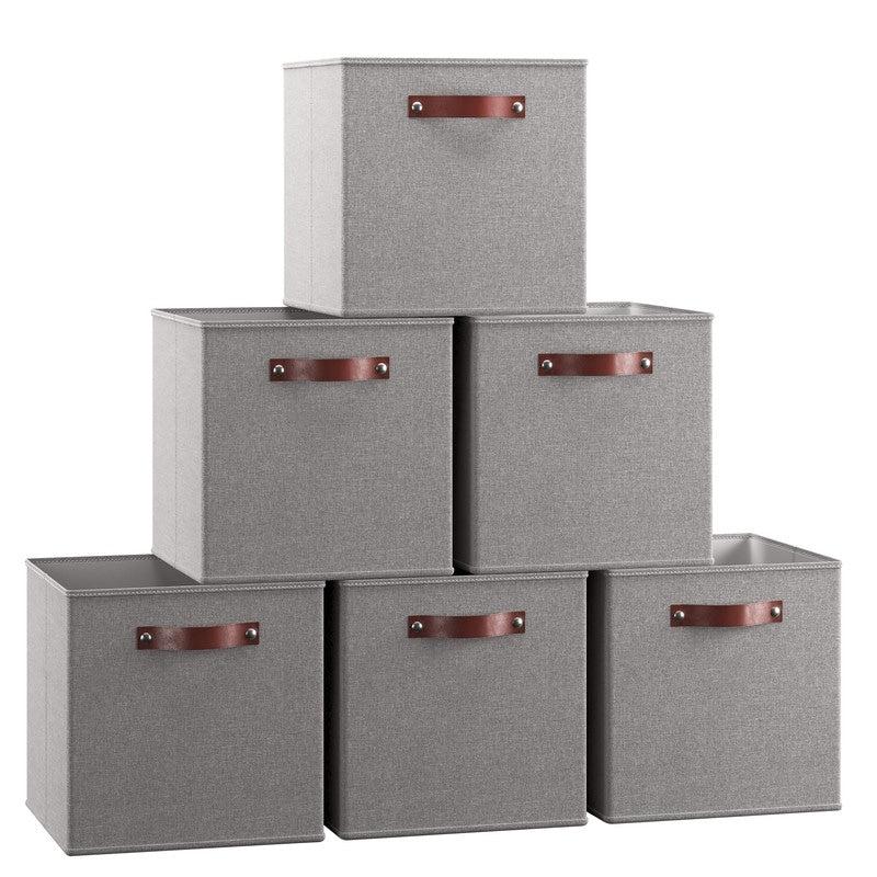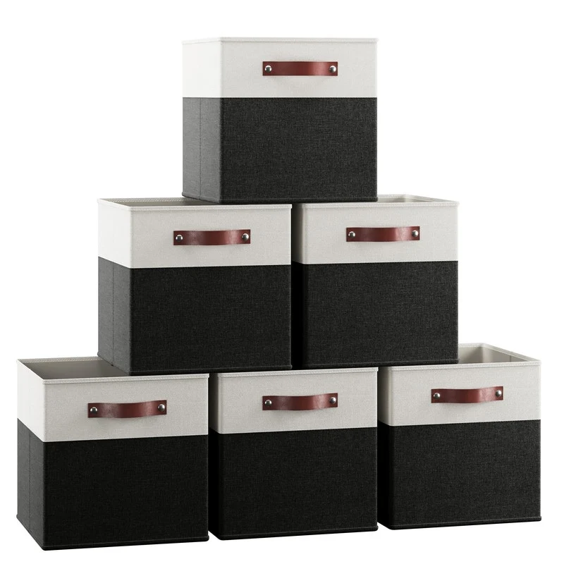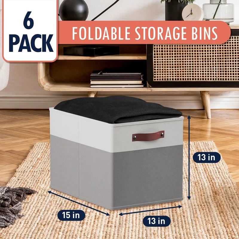 Foldable Collapsible Storage Box Bins Linen Fabric Shelf Basket Cube Organizer with Leather Handles - Set of 6