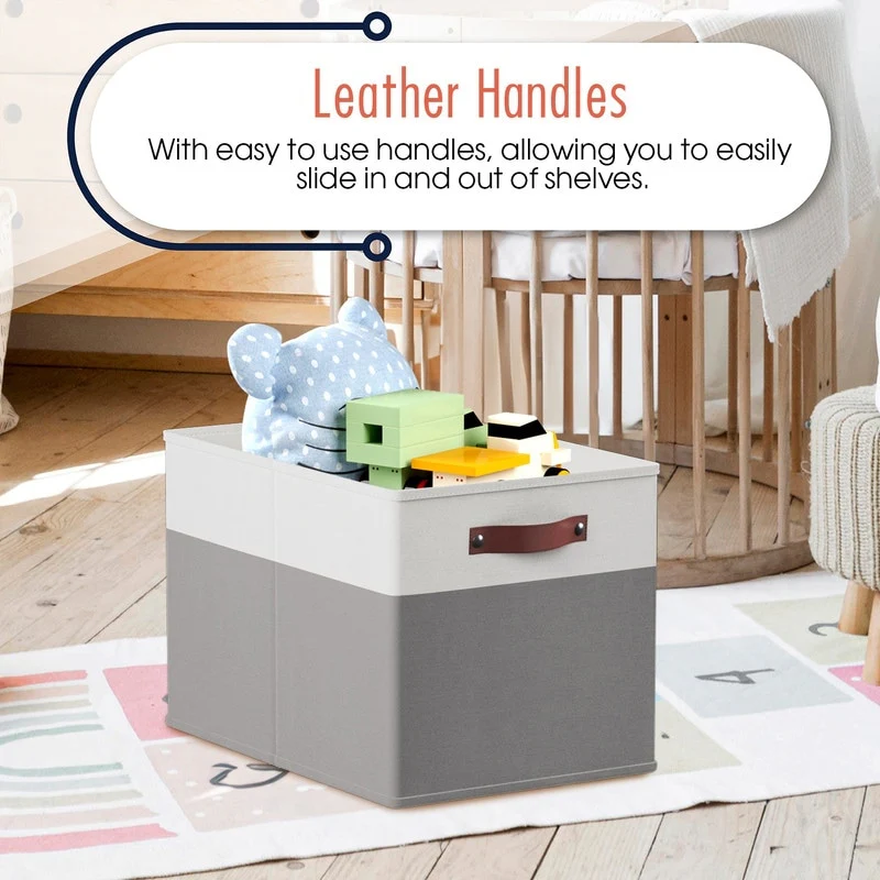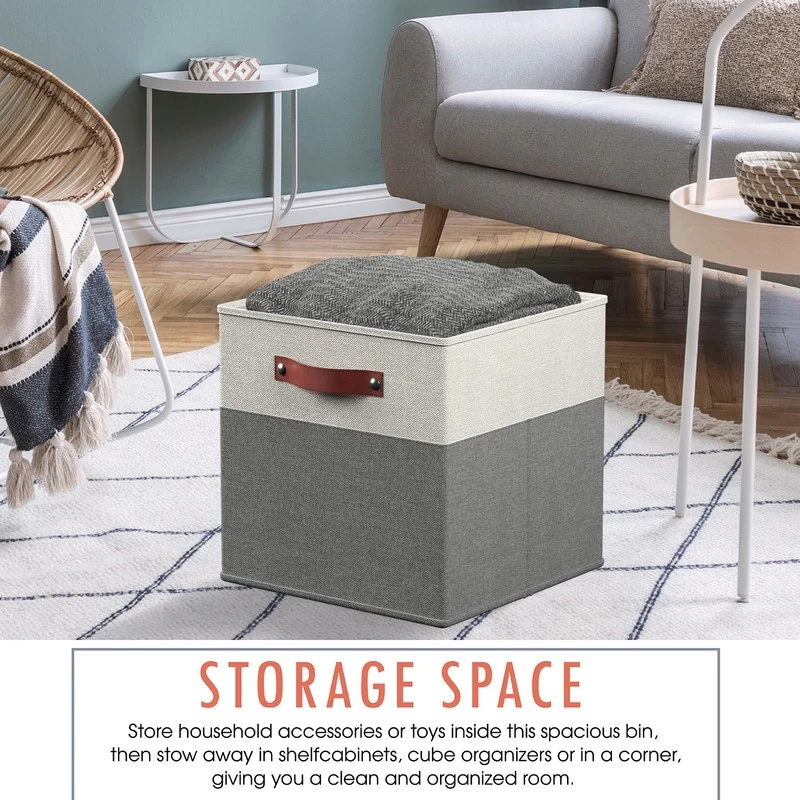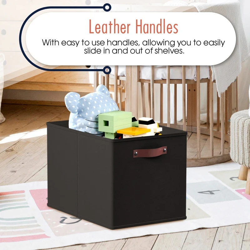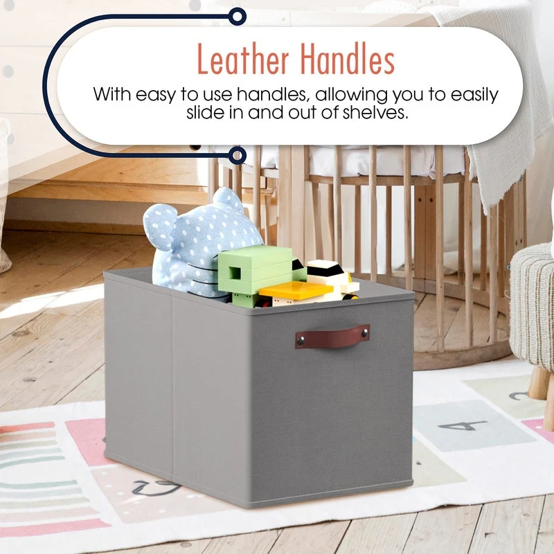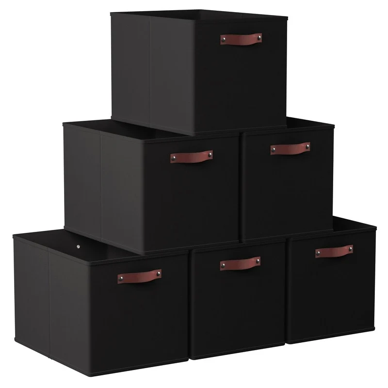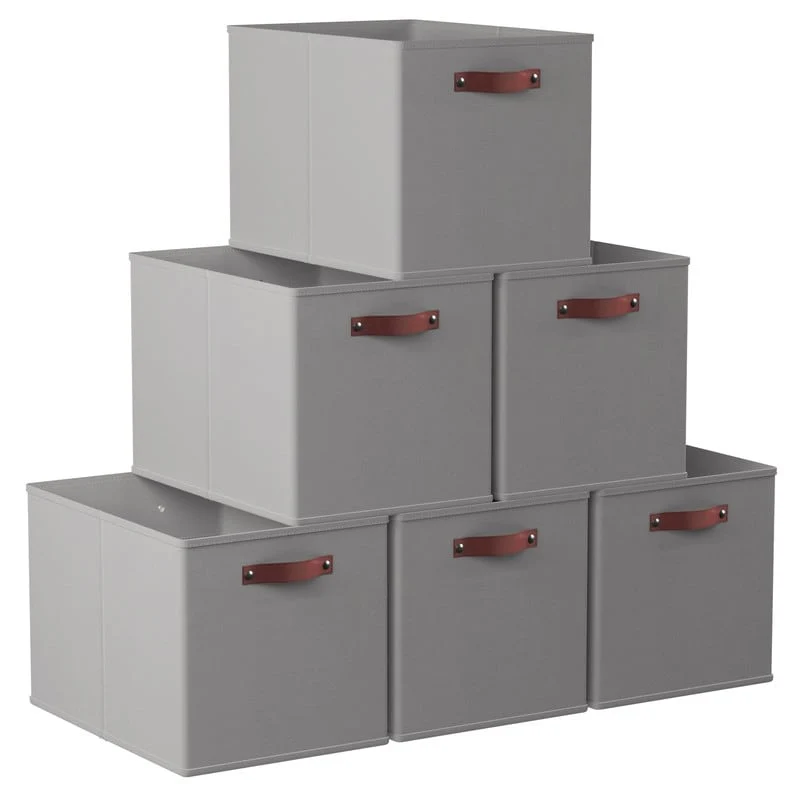 Foldable Collapsible Storage Box Bins Linen Fabric Shelf Basket Cube Organizer with Leather Handles - Set of 6
