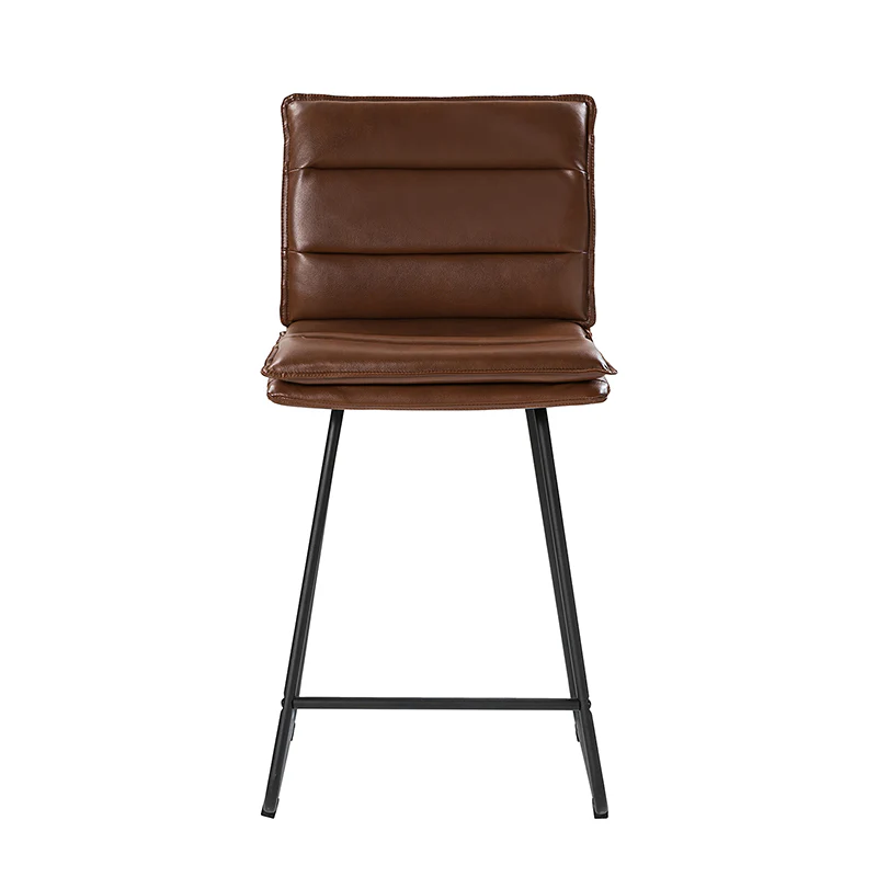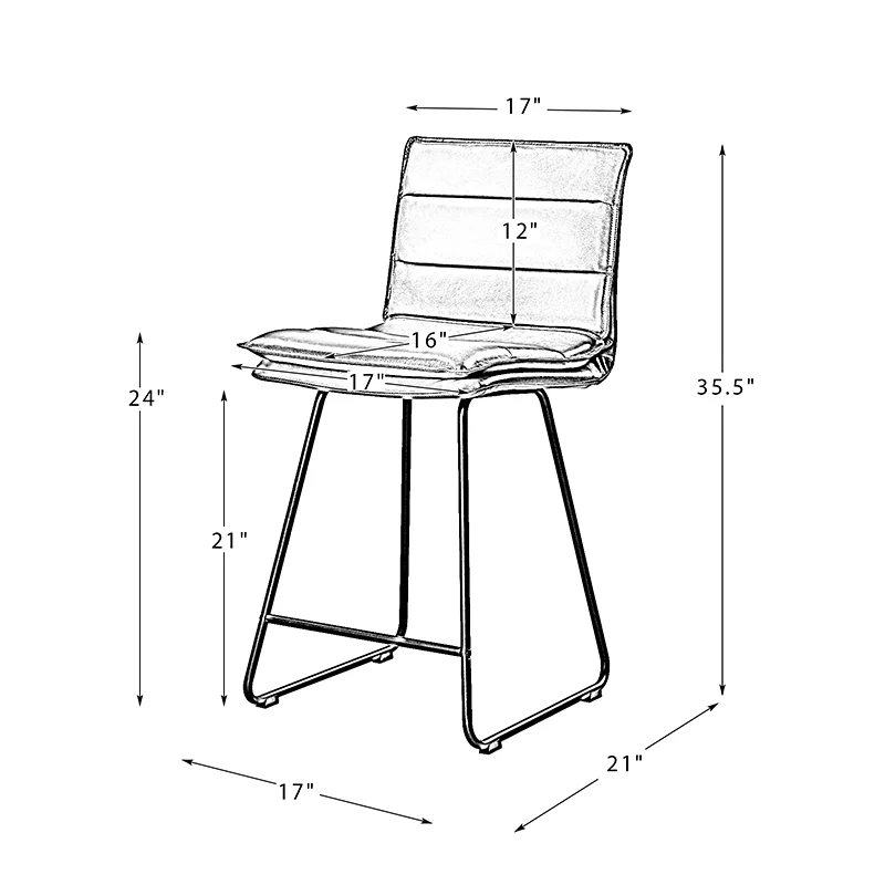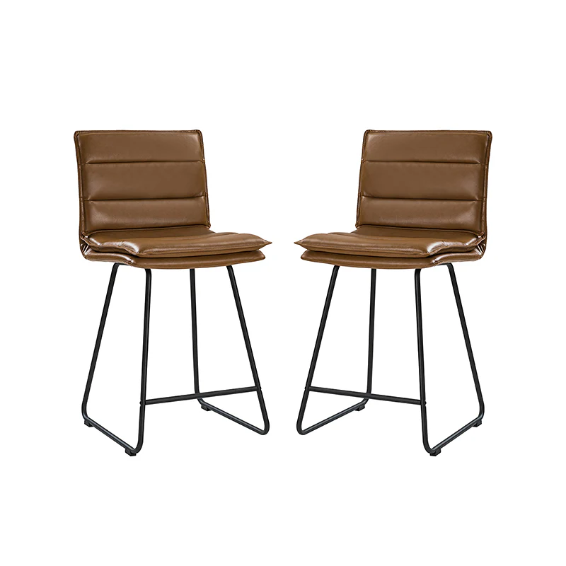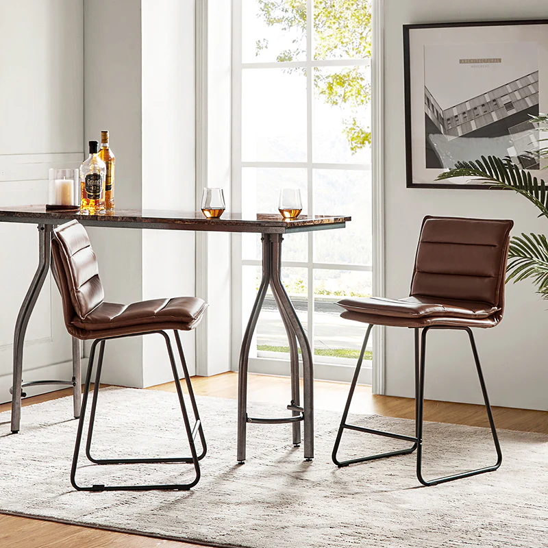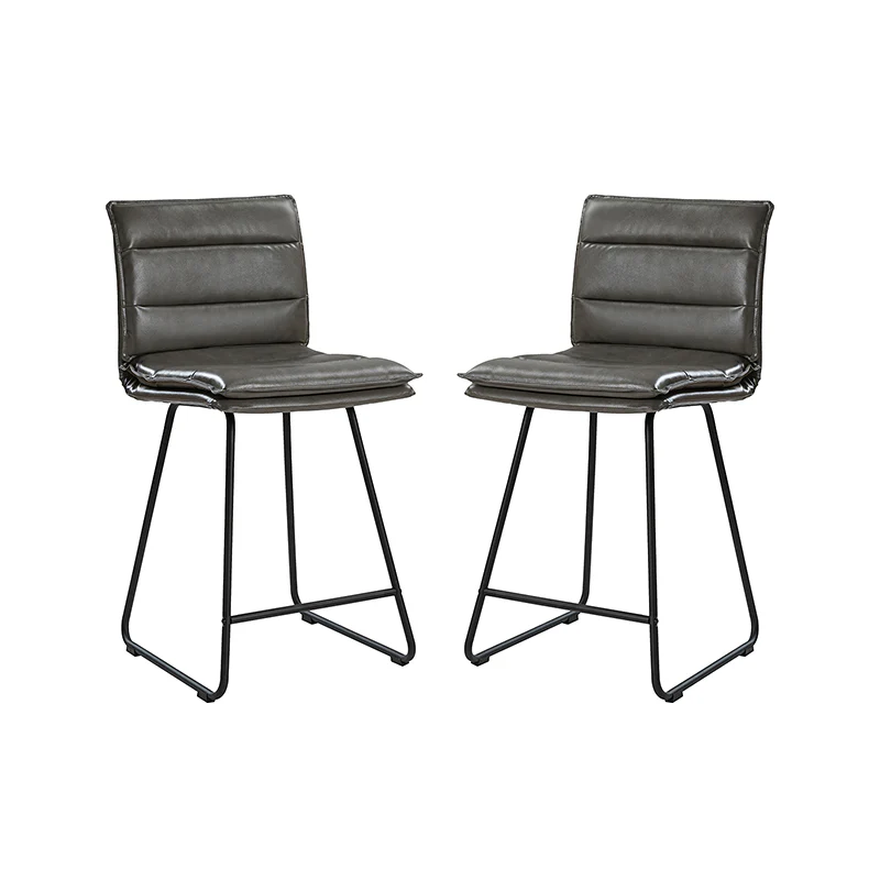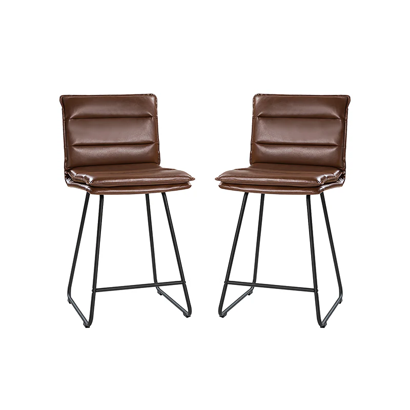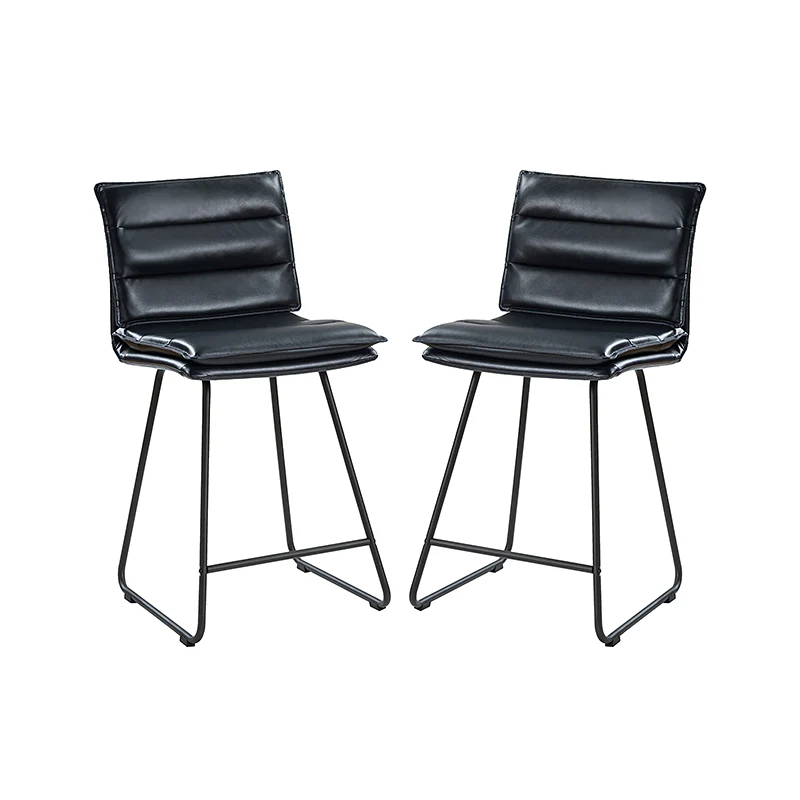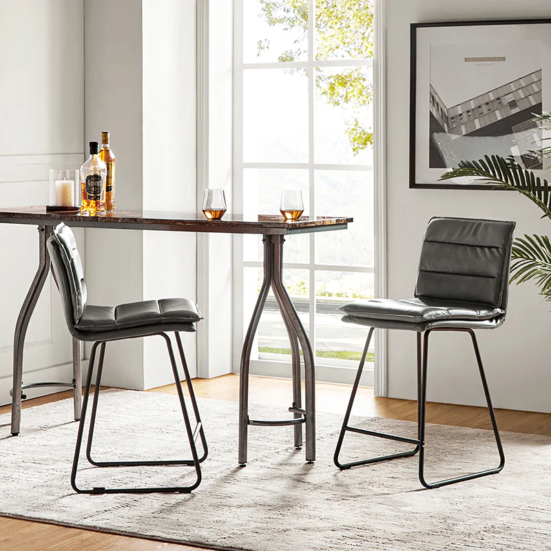Elevate your bar area with this stylish set of 2 industrial-inspired counter stools. These stools boast a sturdy metal frame and sleek vegan leather upholstery, creating a contemporary and edgy appearance. The backrest and seat cushion are skillfully upholstered in quality 3-proof fabric, ensuring both comfort and durability. The unique design detail of the double quilted design on the backrest and seat cushion enhances the industrial aesthetic and adds a touch of sophistication. Additionally, the footrest design allows users to comfortably place their feet, offering extra support and relaxation. The counter stools complement various styles, including modern, casual, transitional, and contemporary. Whether you're entertaining guests or enjoying casual meals, these pieces are the perfect addition to your bar or kitchen island, offering a trendy seating option.