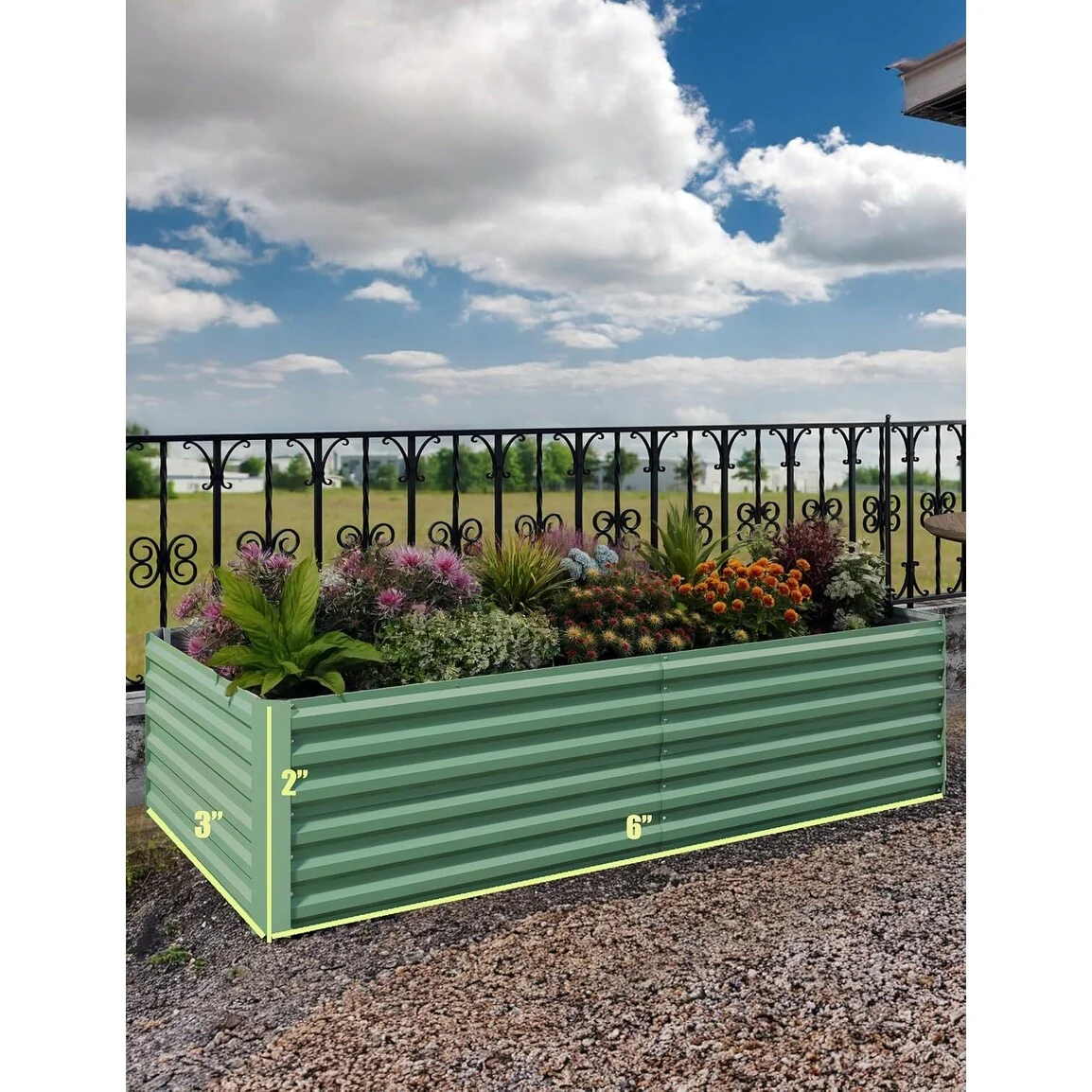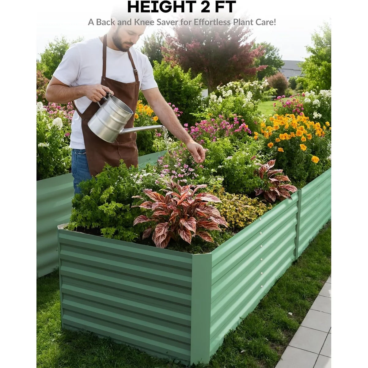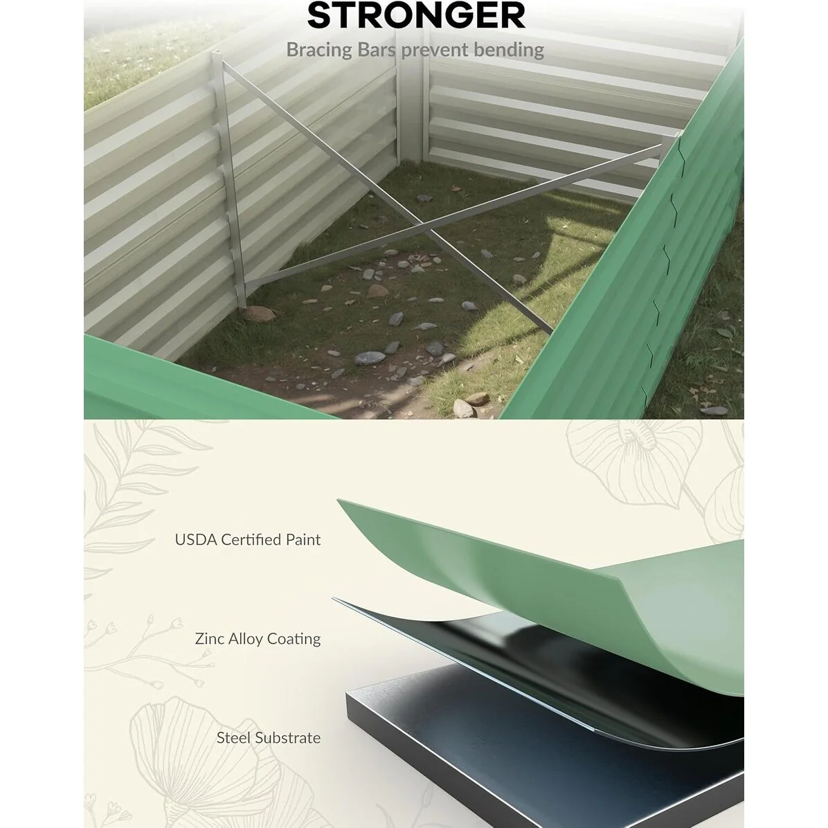 Triple Strength: Crafted with 0.6mm thick metal panels, this garden bed ensures exceptional durability for up to 20 years outdoors. The inclusion of an X-shaped crossbar provides essential structural support, preventing deformation when filled with soil. The eco-friendly galvanized coating enhances longevity while protecting the environment.