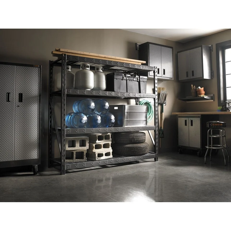 Neatly organize your space with this Gladiator GarageWorks heavy duty shelves. Crafted with a welded steel frame with four metal shelves that each hold up to 2000 pounds, this shelf is an ideal choice for your garage, basement, or workshop. The unit assembles quickly and without tools, and features a dual slot profile that allows for additional supports and shelves.