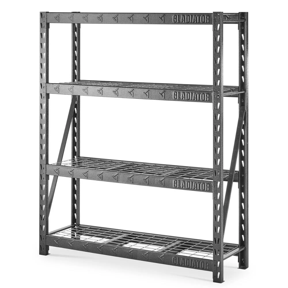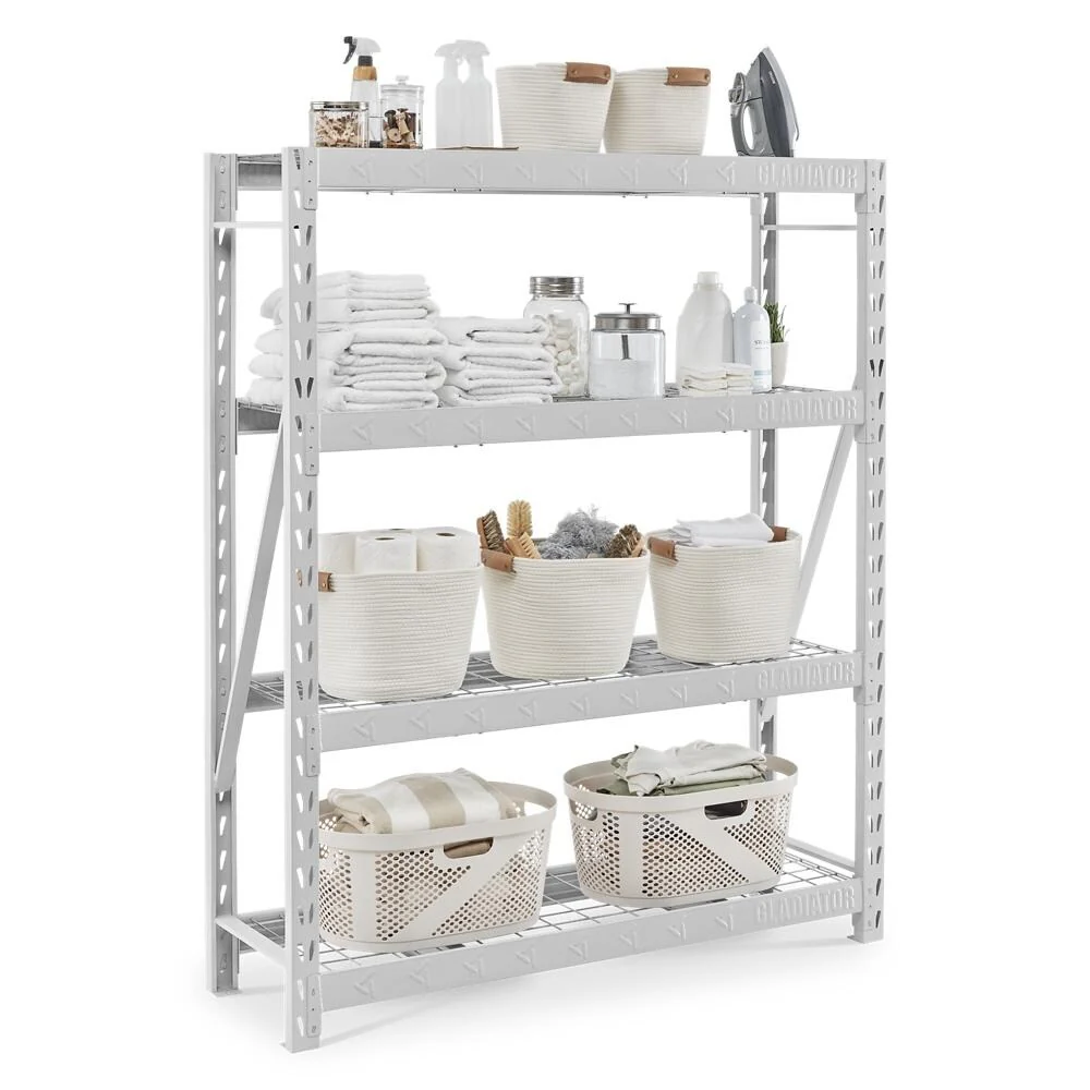 Constructed of welded steel, the sturdy Gladiator shelving unit offers unprecedented durability. Each of the four metal shelves can support up to 1,800 pounds, making this piece ideal for heavy tools, camping gear, or outdoor accessories. The dual-slot profile allows for additional shelves and supports to be added on to suit your storage needs