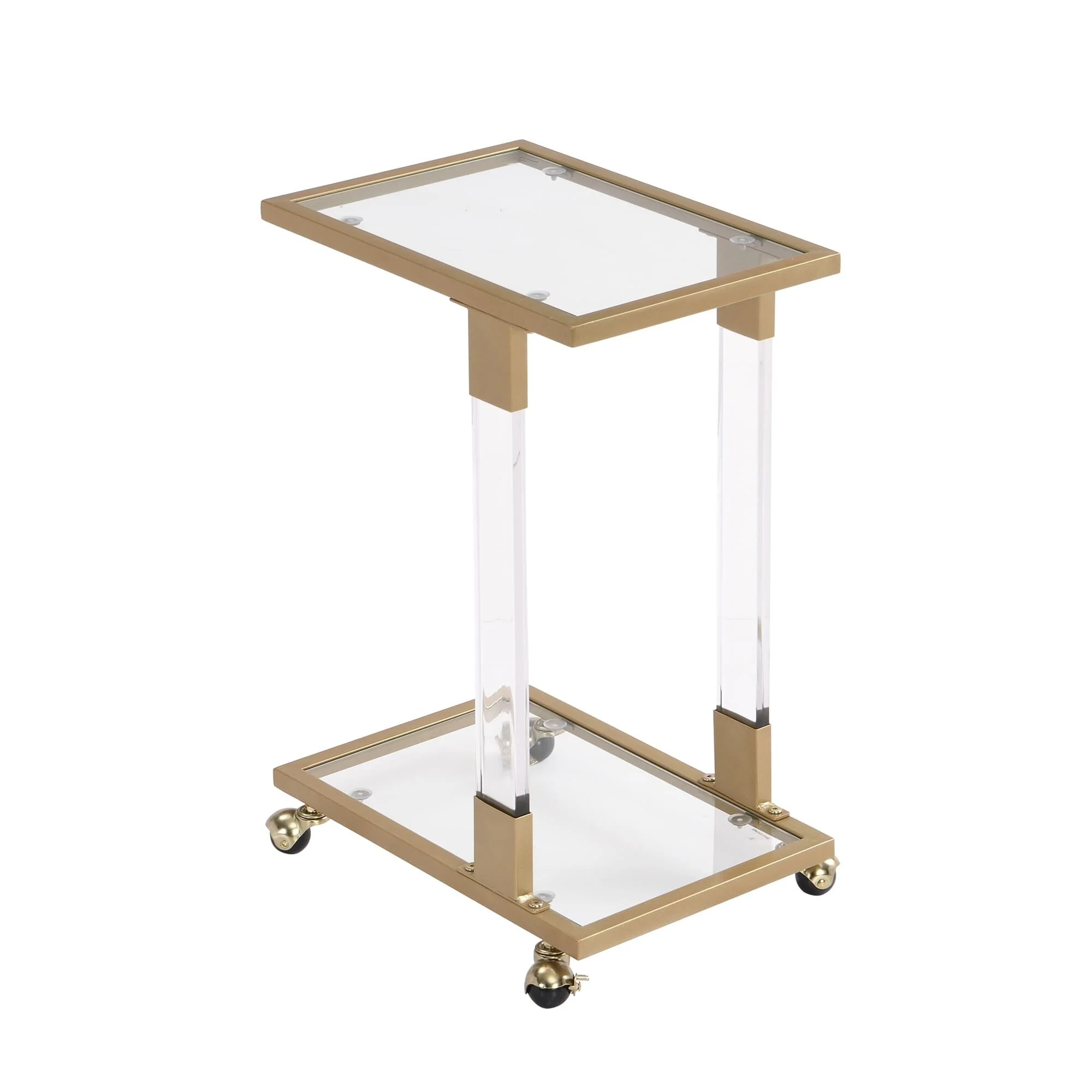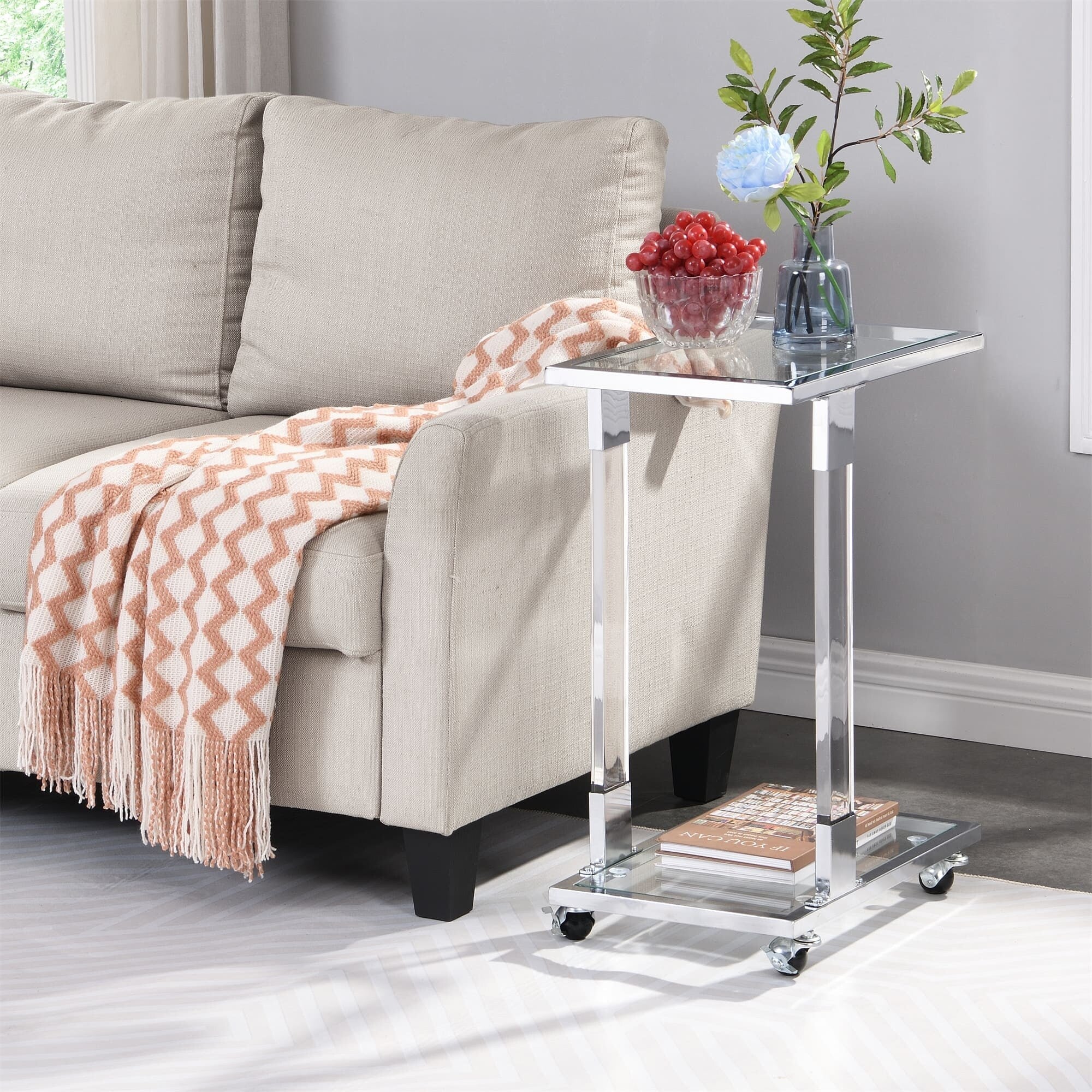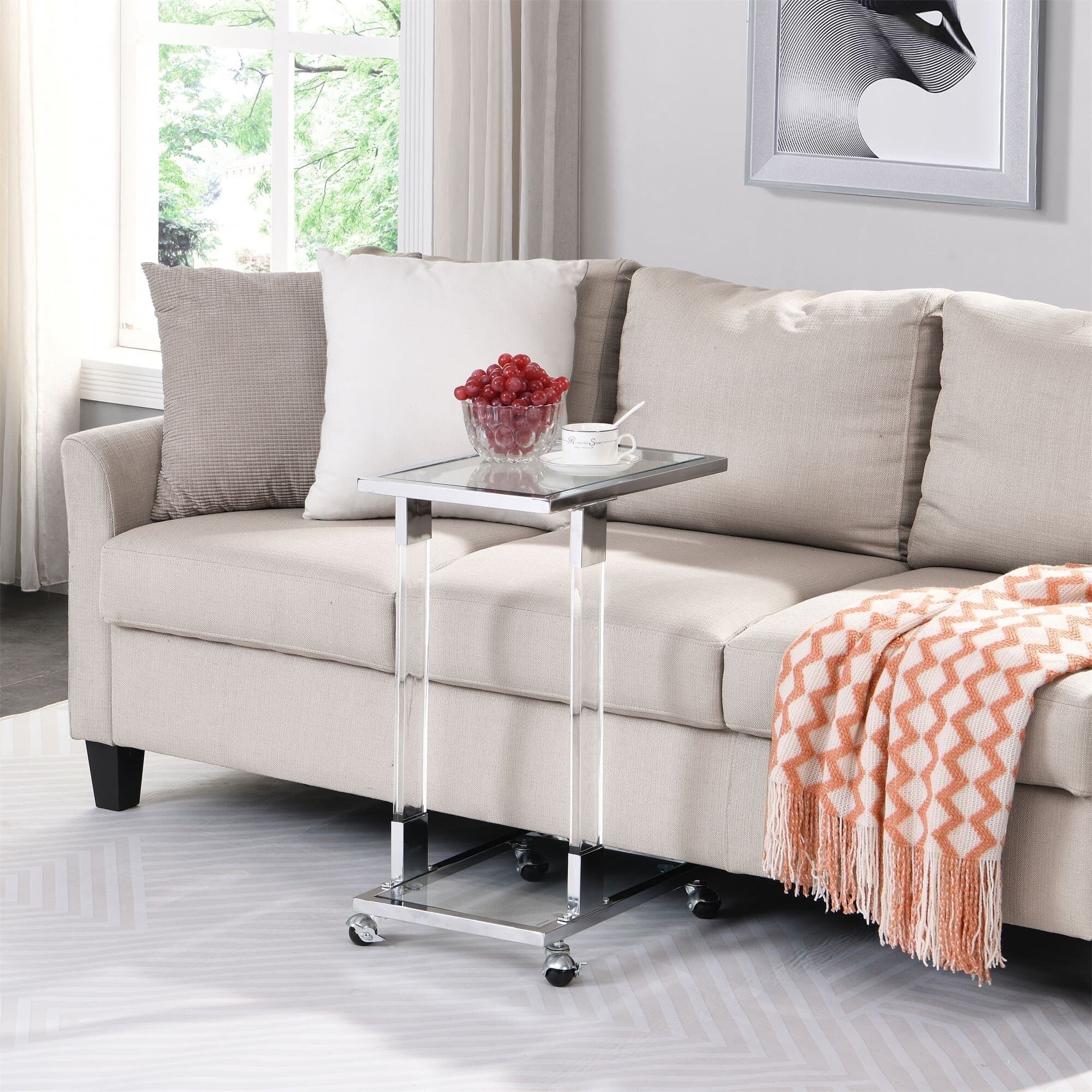 【Rolling Design】The mobile C-shaped coffee table which have 4 smooth wheels can also make table move wherever you want (two of wheels are lockable). Everything can be in reach when you get the acrylic glass side table.