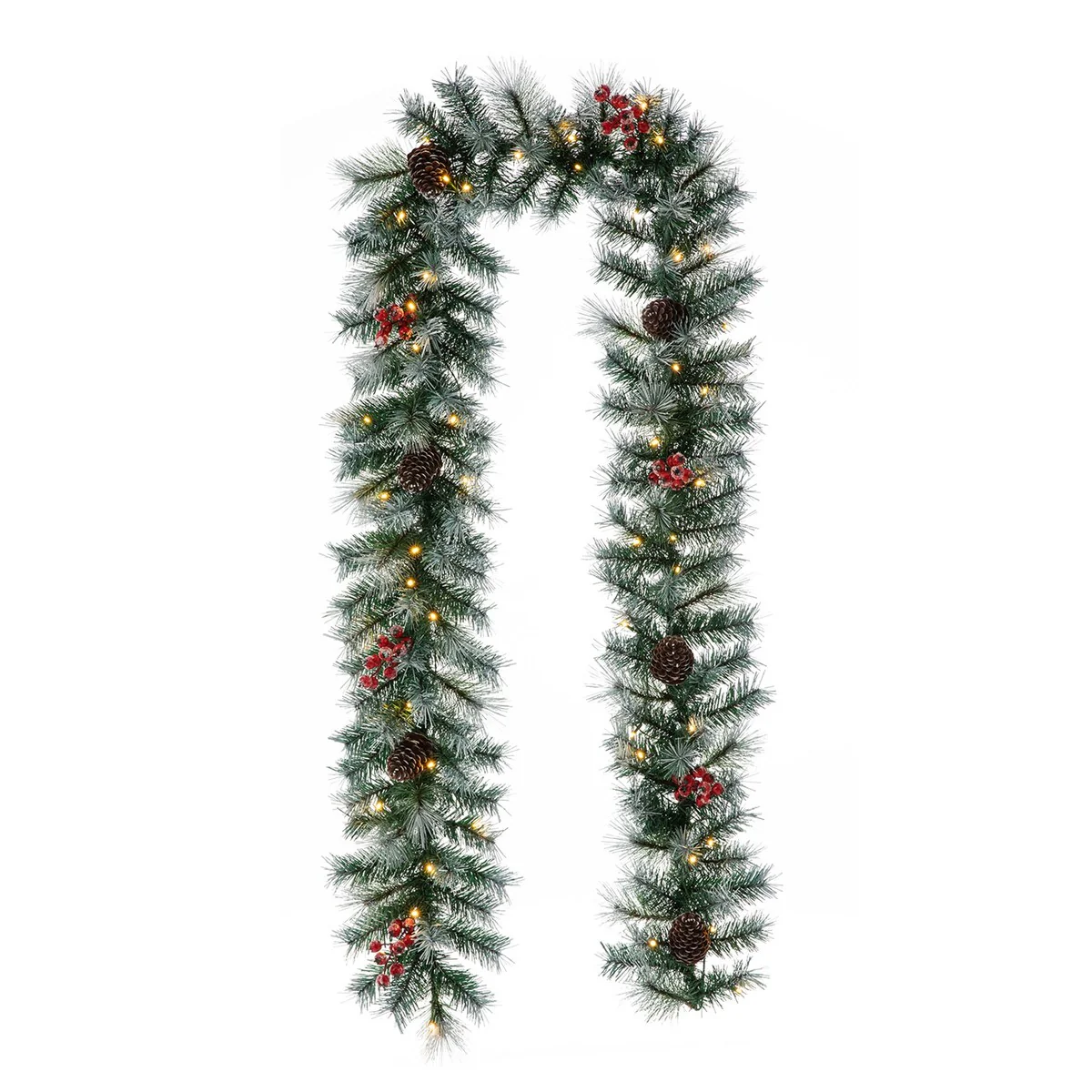 The 9ft Frosted mixed tips Pine garland provides ample length to easily adorn doors, mantles or banisters, making this versatile decoration ideal for any situation. Each of the 150 tips is modeled on a pine tree while the frosted design creates a winter wonderland around your home. Red berries and pinecones among the needles add an extra holiday touch to this garland. It creates the perfect holiday touch for your home. Product may ship compressed -You can adjust all the branches with an elegant look like the images.