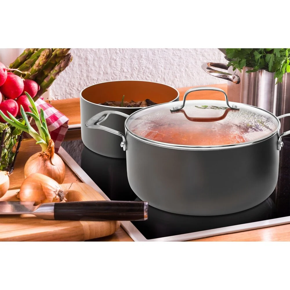 Load up on these non-stick stockpots and saucepans if you want an easy way to cook healthy food without using butter or oil. These heavy-duty stockpots and sauce pans let you cook healthier food-no butter needed! Set includes 2qt pot wit lid, 3qt sauce pan with lid, 5qt stock pot with lid, 7qt stock pot with lid.