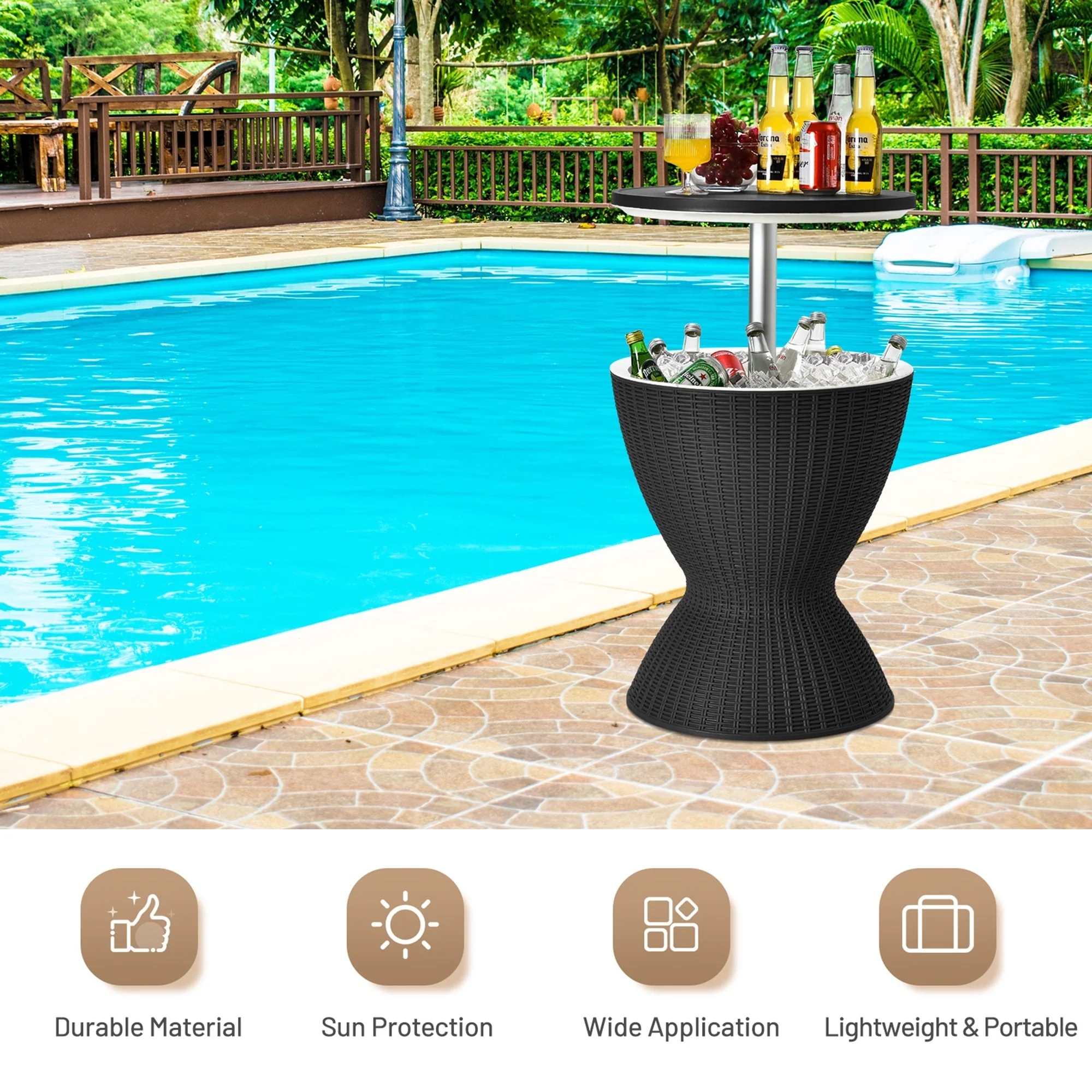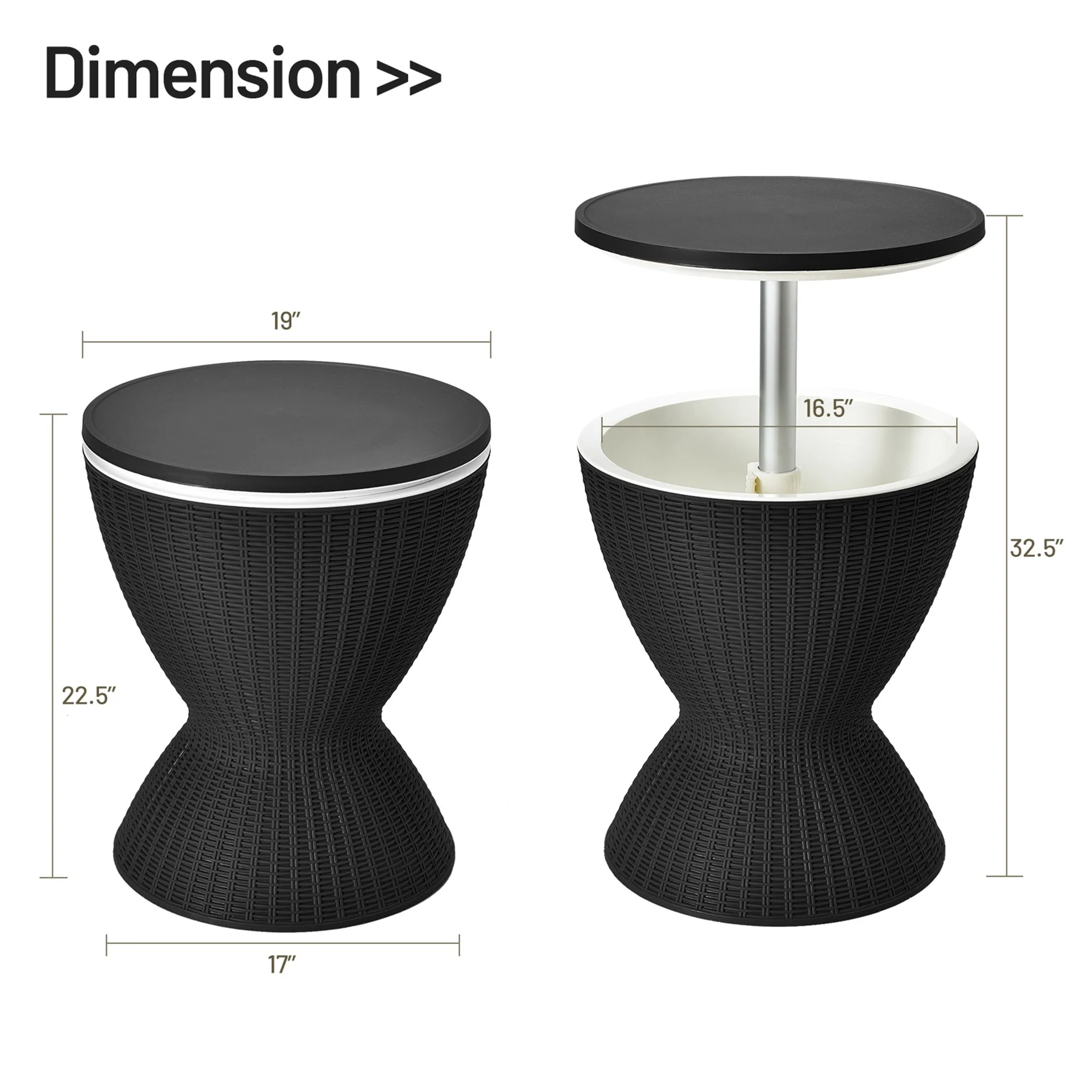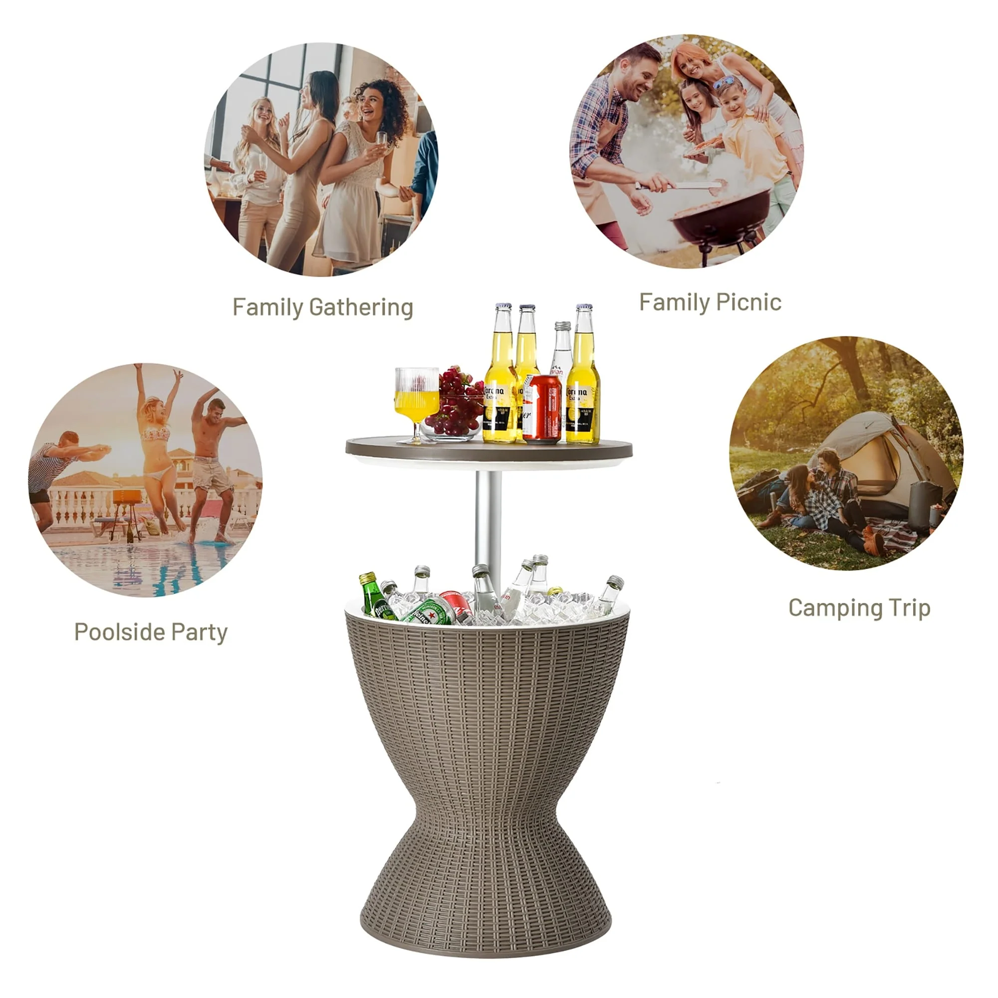 Our 8-gallon ice cooler is ideal for outdoor patio party or family picnic use. It can maintain your drinks fresh and cool for several hours when filled with ice. Featuring two adjustable heights of 22.5'' and 32.5'', it can not only work as an ice bucket, but also use as a side table, perfectly meeting your different needs. And it is equipped with a lifting table lock to prevent it from falling. Besides, the drain at the bottom makes easy water draining and the drain plug design makes it easy to clean, which greatly saves your efforts. If you like it, don't hesitate to buy one!