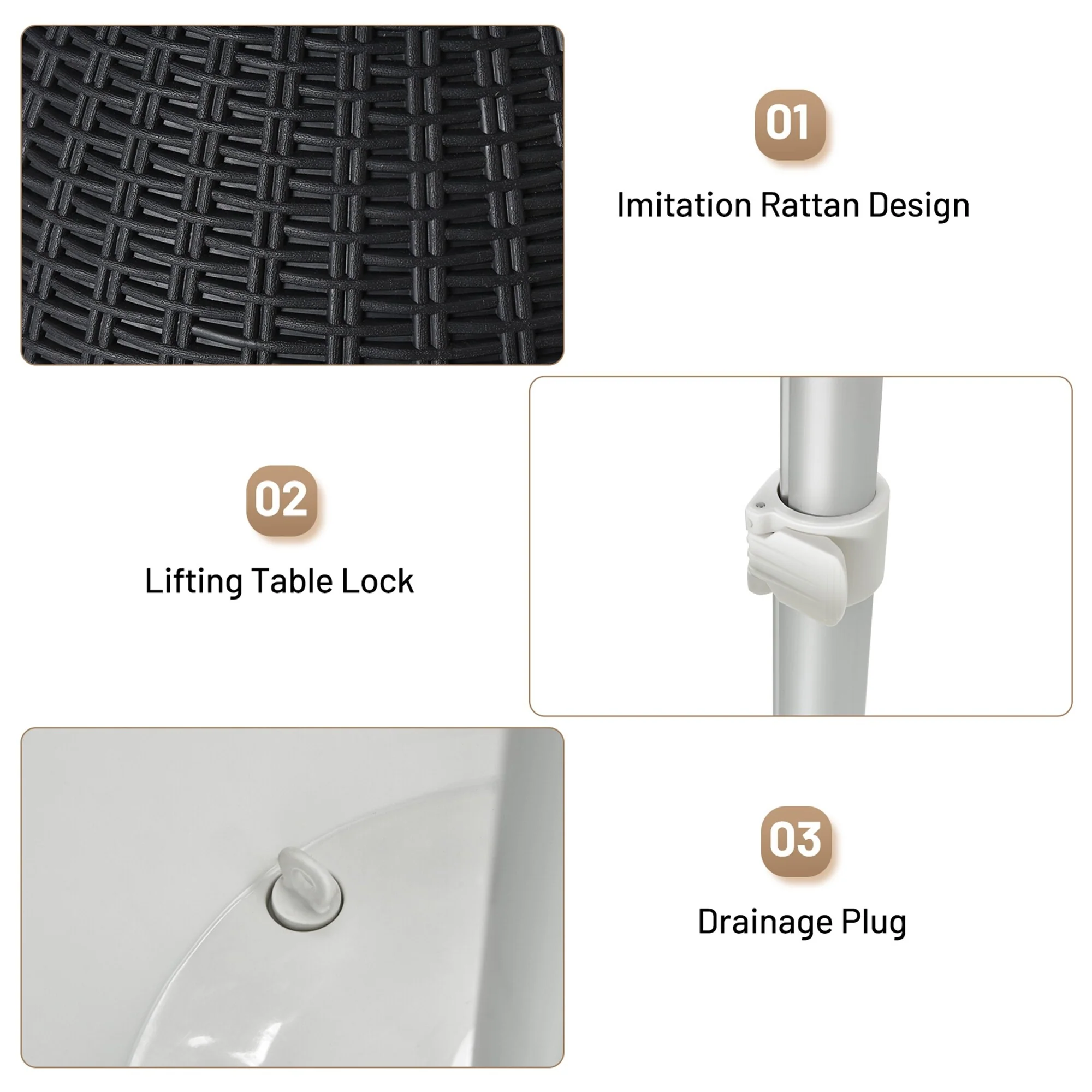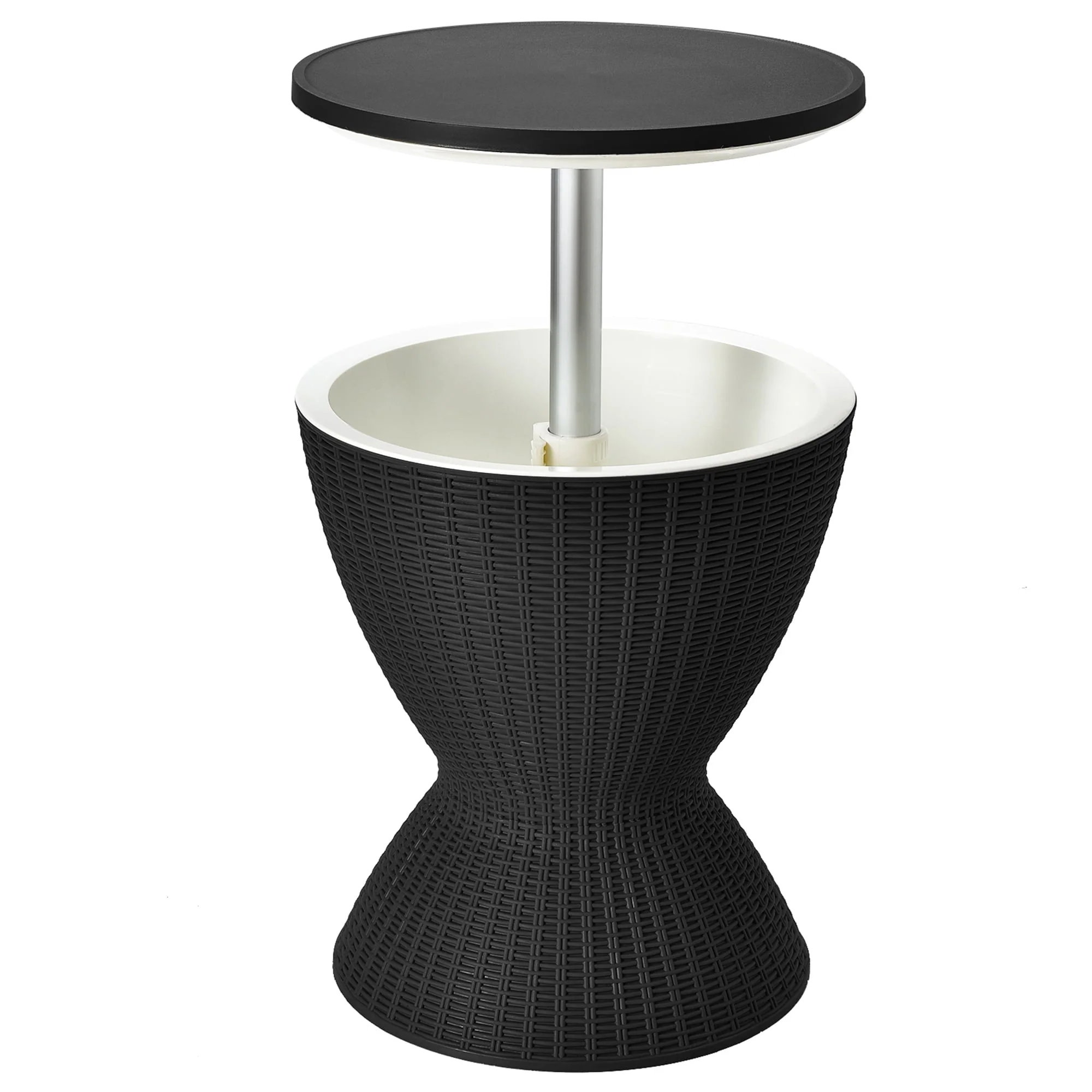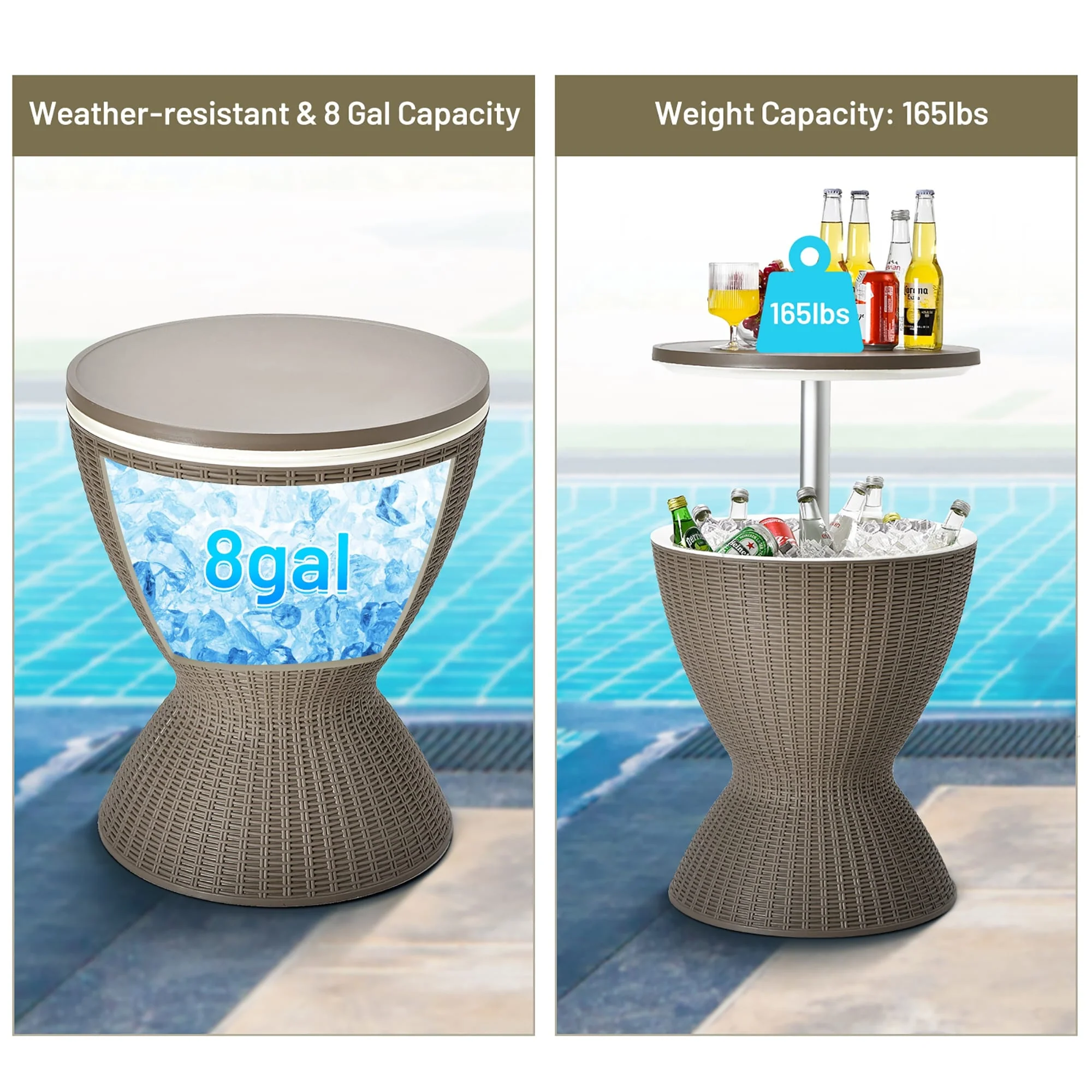 Our 8-gallon ice cooler is ideal for outdoor patio party or family picnic use. It can maintain your drinks fresh and cool for several hours when filled with ice. Featuring two adjustable heights of 22.5'' and 32.5'', it can not only work as an ice bucket, but also use as a side table, perfectly meeting your different needs. And it is equipped with a lifting table lock to prevent it from falling. Besides, the drain at the bottom makes easy water draining and the drain plug design makes it easy to clean, which greatly saves your efforts. If you like it, don't hesitate to buy one!