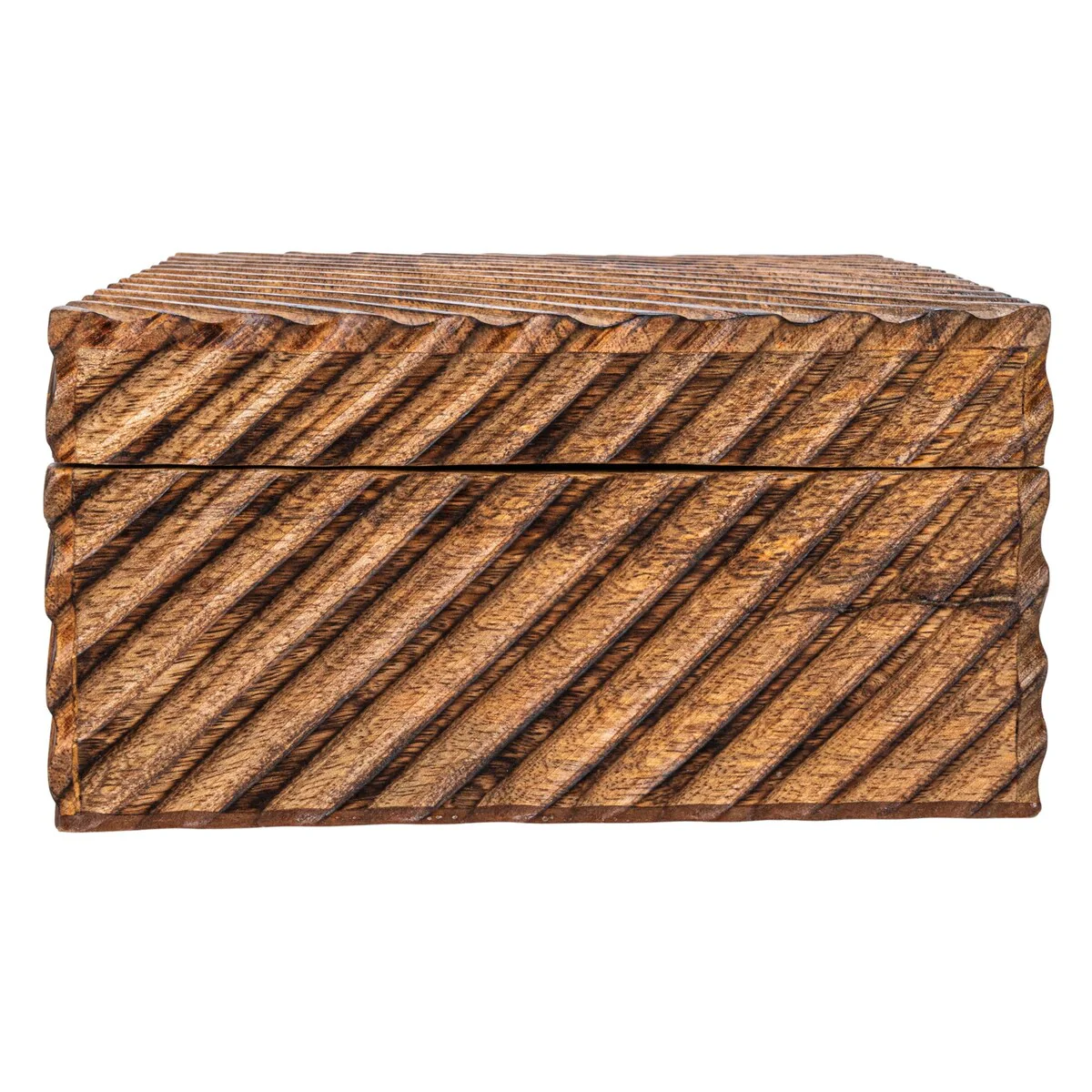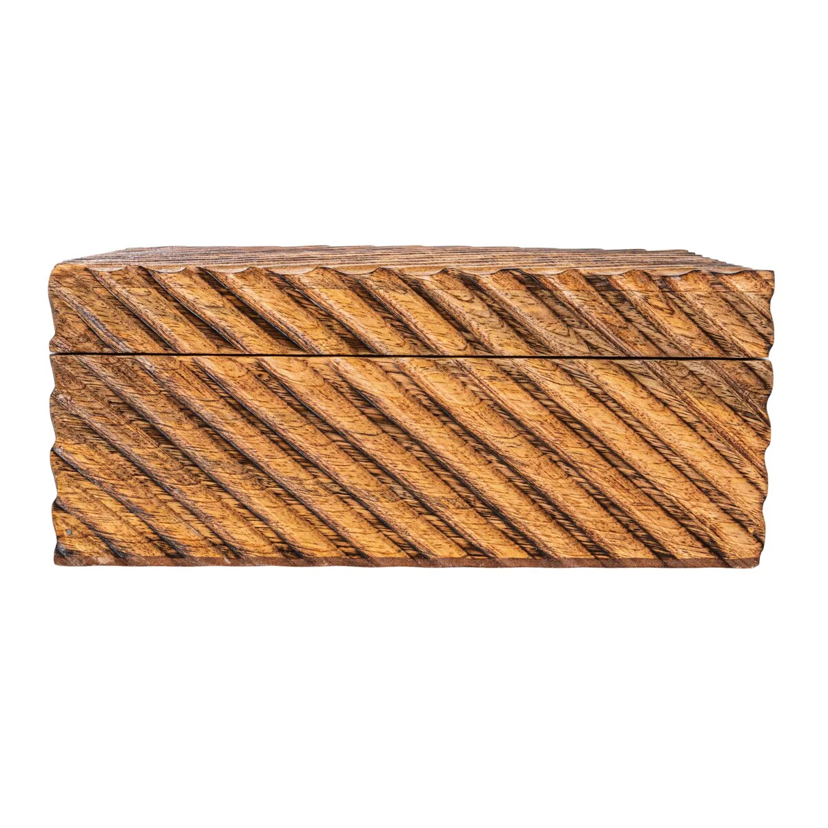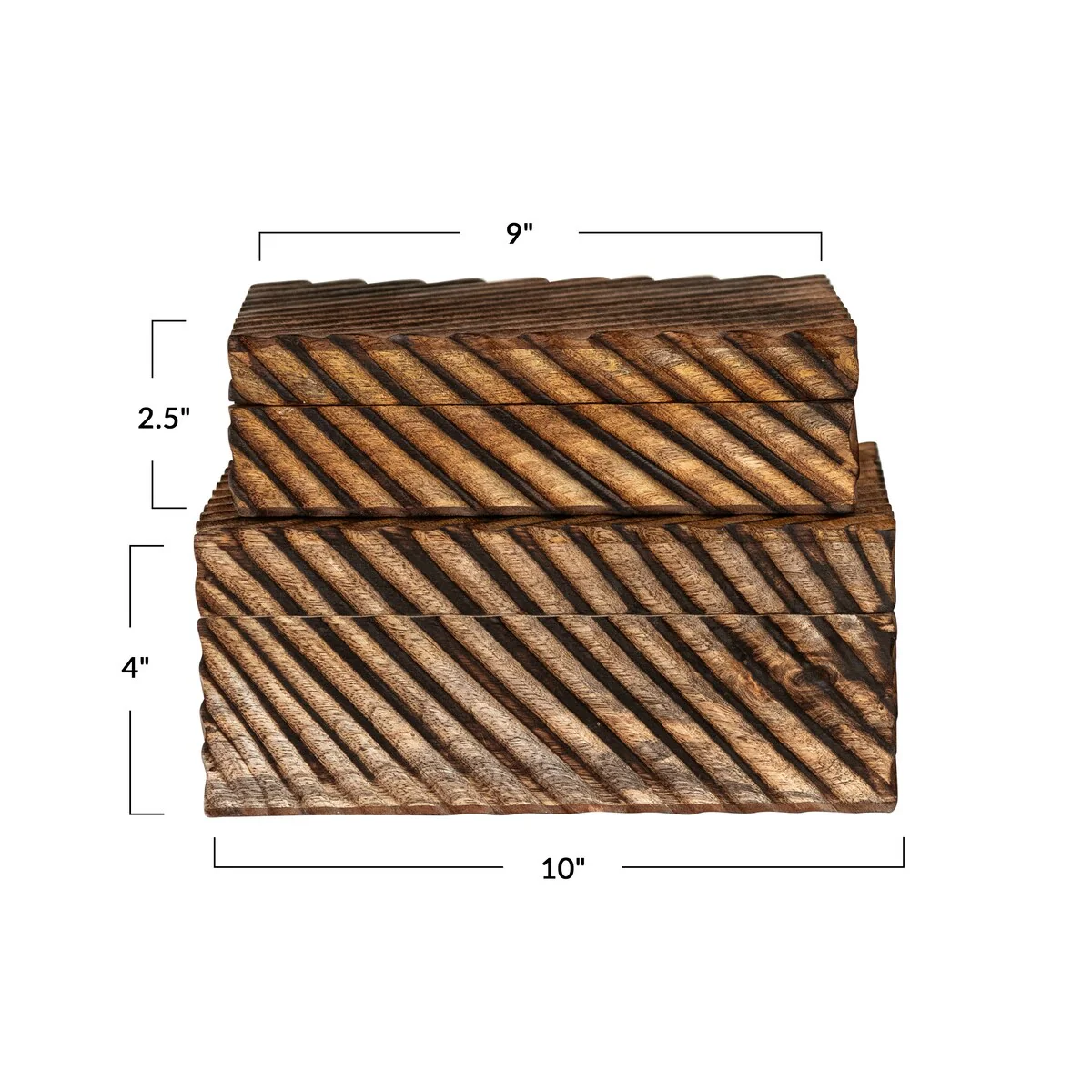 This set of two hand-carved mango wood nesting boxes, burnt finish is a beautiful and practical piece for any home. It consists of two nesting boxes of different sizes that feature a hand-carved design and a burnt finish. The hand-carved design creates a unique and intricate effect that makes each box different and special. The burnt finish adds a touch of warmth and sophistication to these boxes. They are perfect for storing and organizing books, magazines, photos, or other items in the living room, bedroom, or office. They can also be used as decorative accents on a shelf, table, or mantel. These boxes are made of mango wood, a durable and eco-friendly material that adds texture and character. They are easy to clean and maintain, and they will last for a long time. They measure 10 inches in length, 8 inches in width and 4 inches in height and 9 inches in length, 7 inches in width and 2.5 inches in height, making them suitable for any space. This set of two hand-carved mango wood nesting boxes, burnt finish is a must-have for anyone who loves style and functionality
