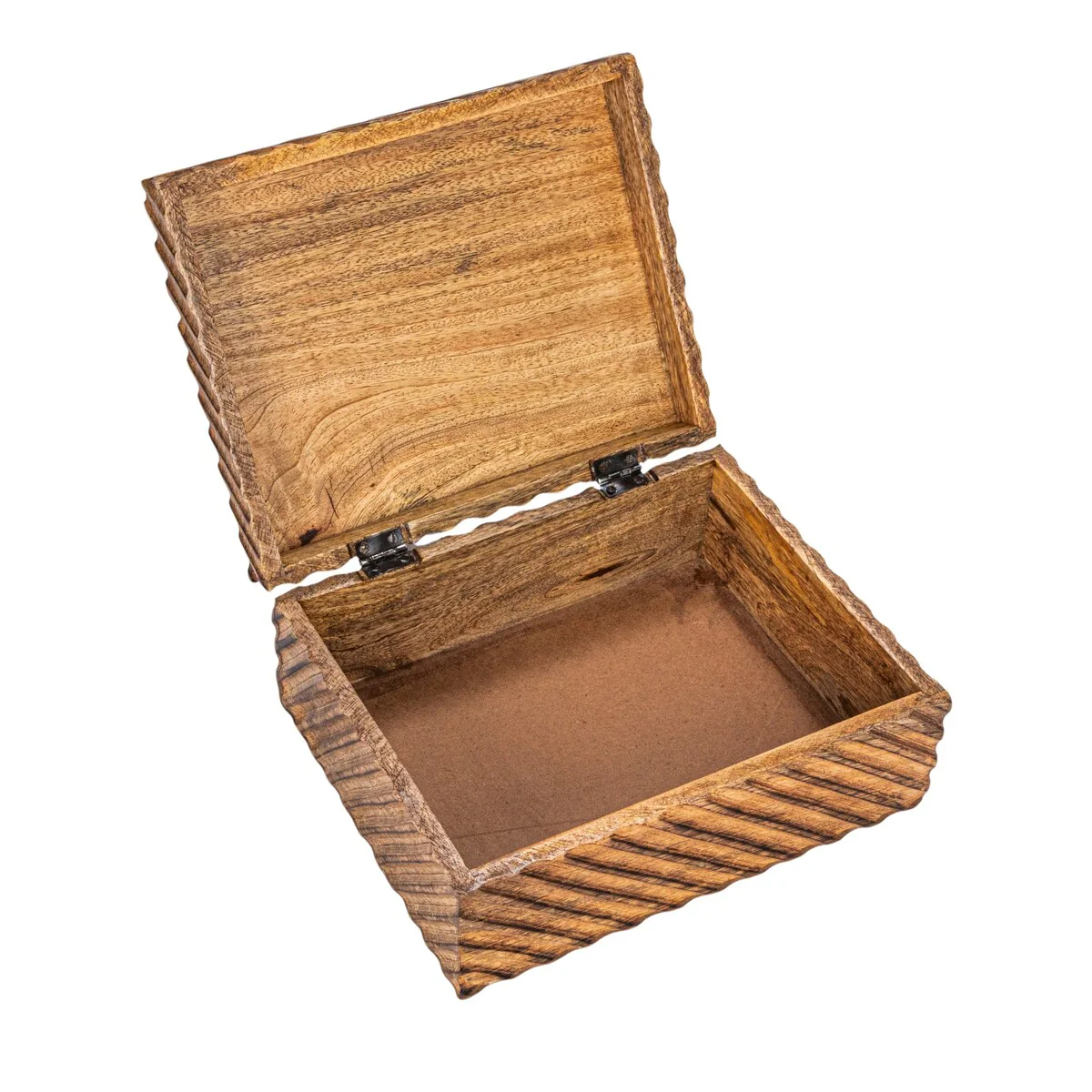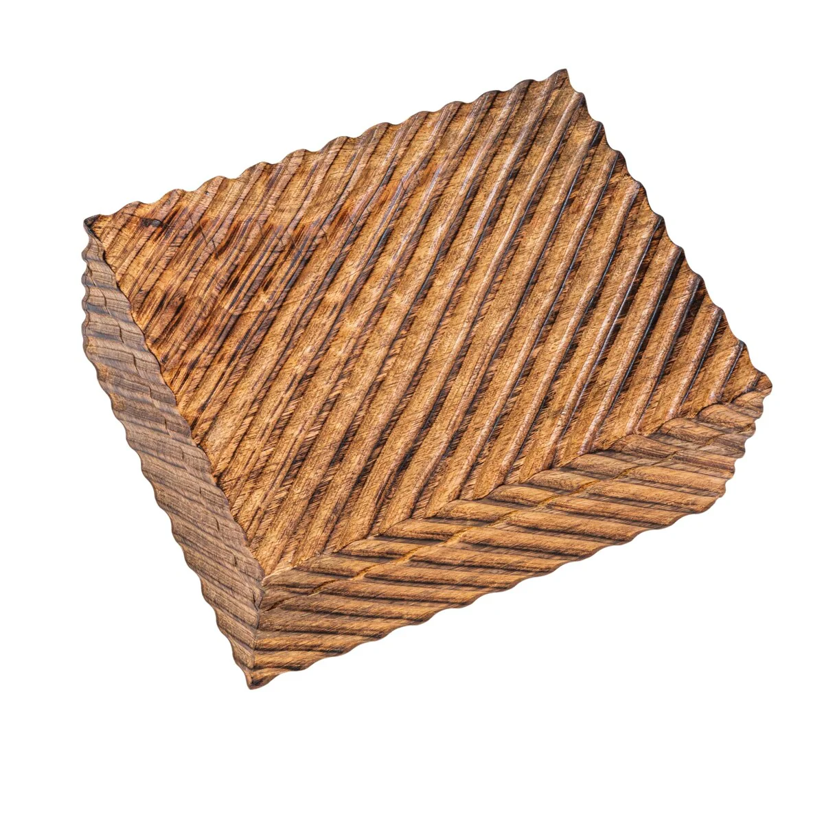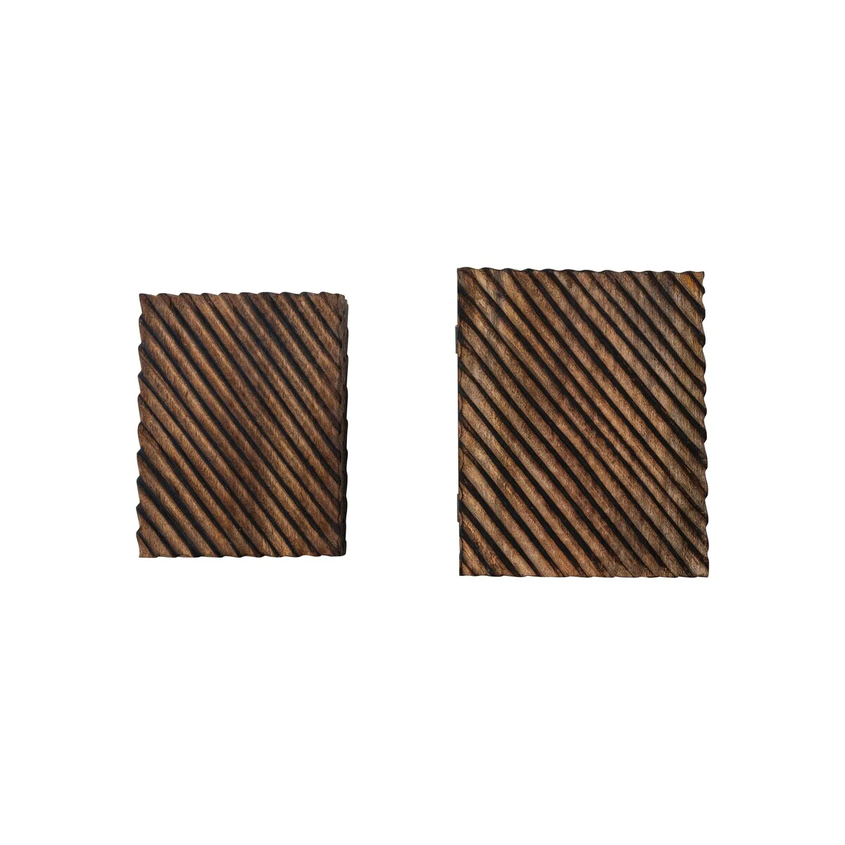 - A rustic and functional set of two nesting boxes that feature a hand-carved design and a burnt finish