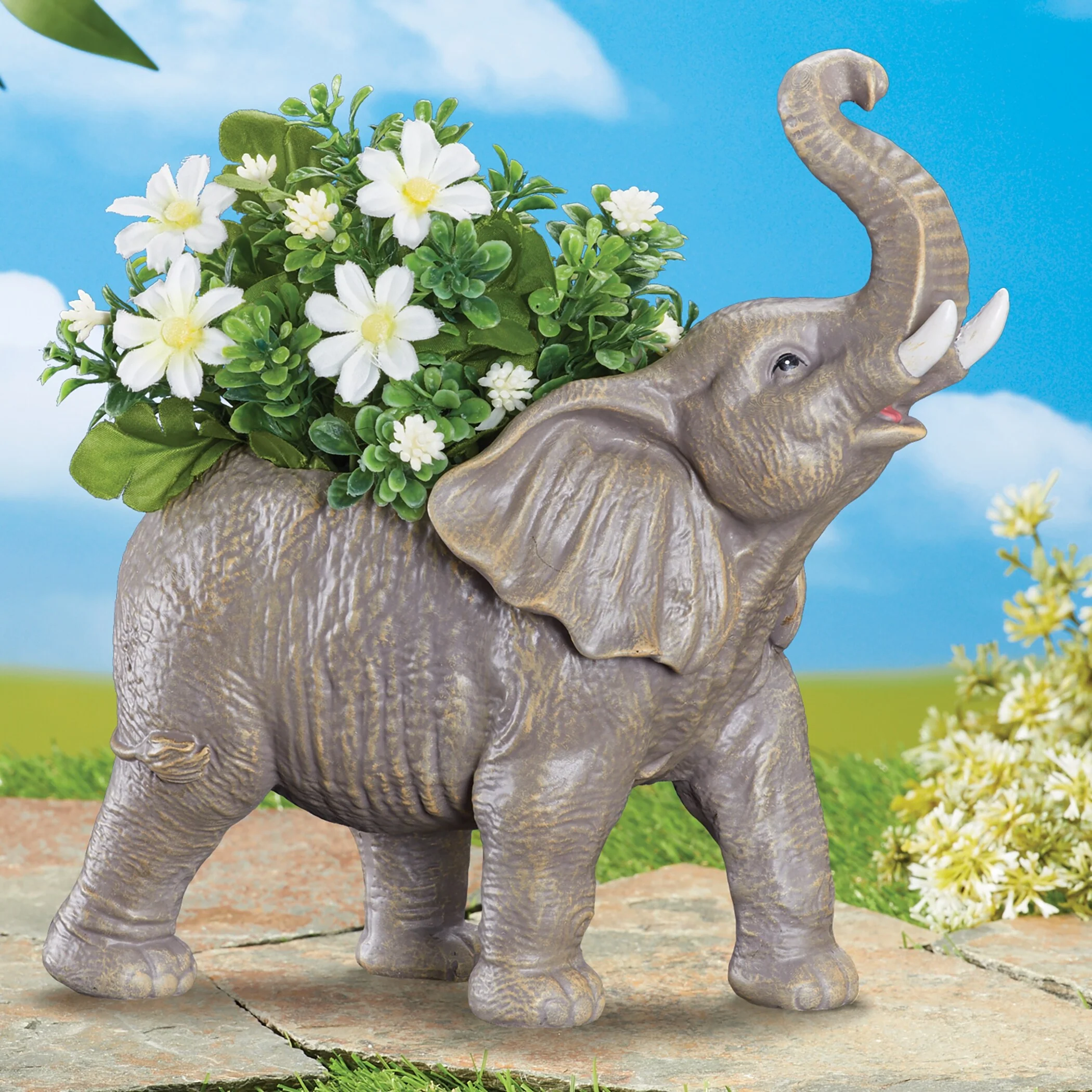 This unique elephant planter is hand-painted with intricate textures and details. The majestic elephant stands with its trunk in the air, and the planting area is approx. 4 1/4"L x 3 1/4"W x 4" deep. Drainage hole on the bottom. Resin. Planter is 9 1/2"L x 5 3/8"W x 9 5/8"H.