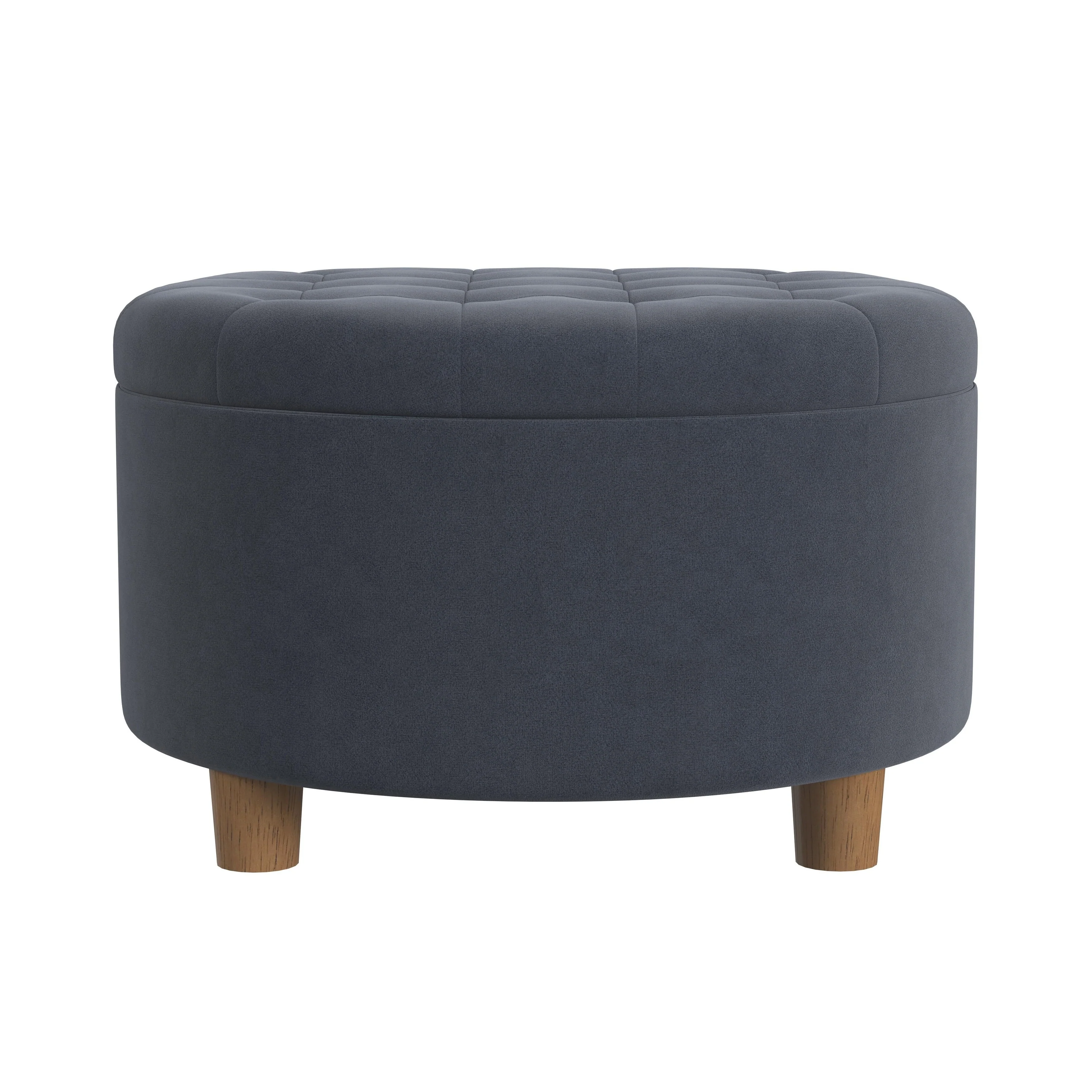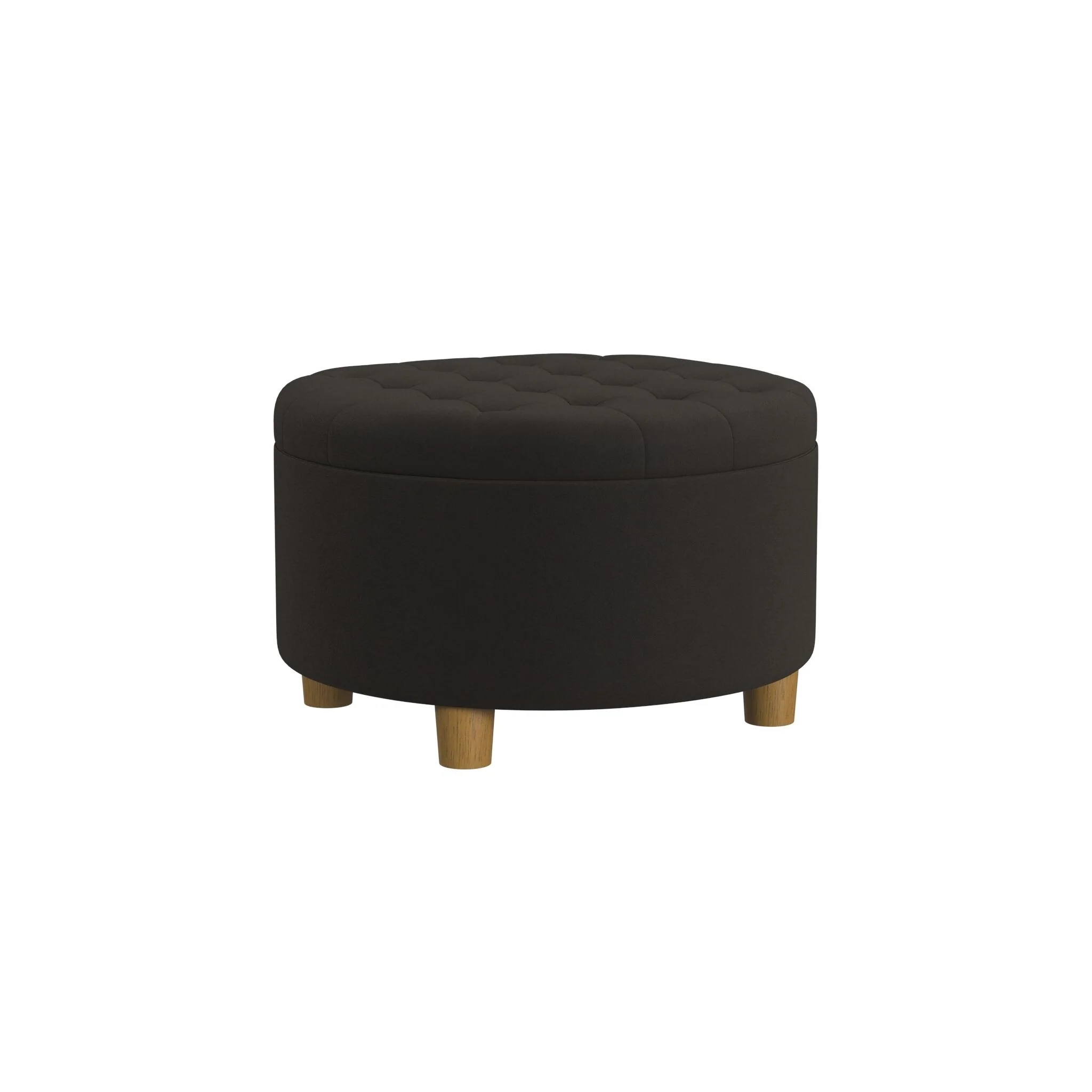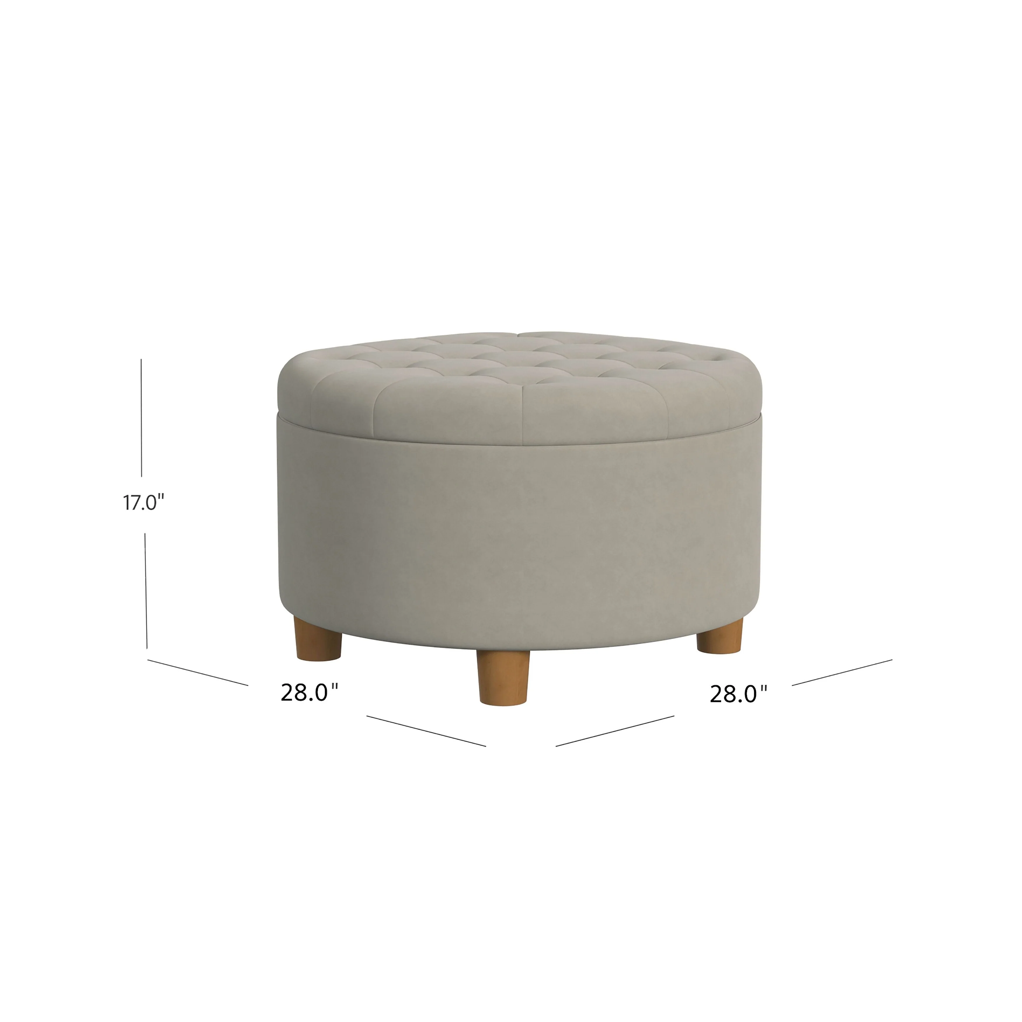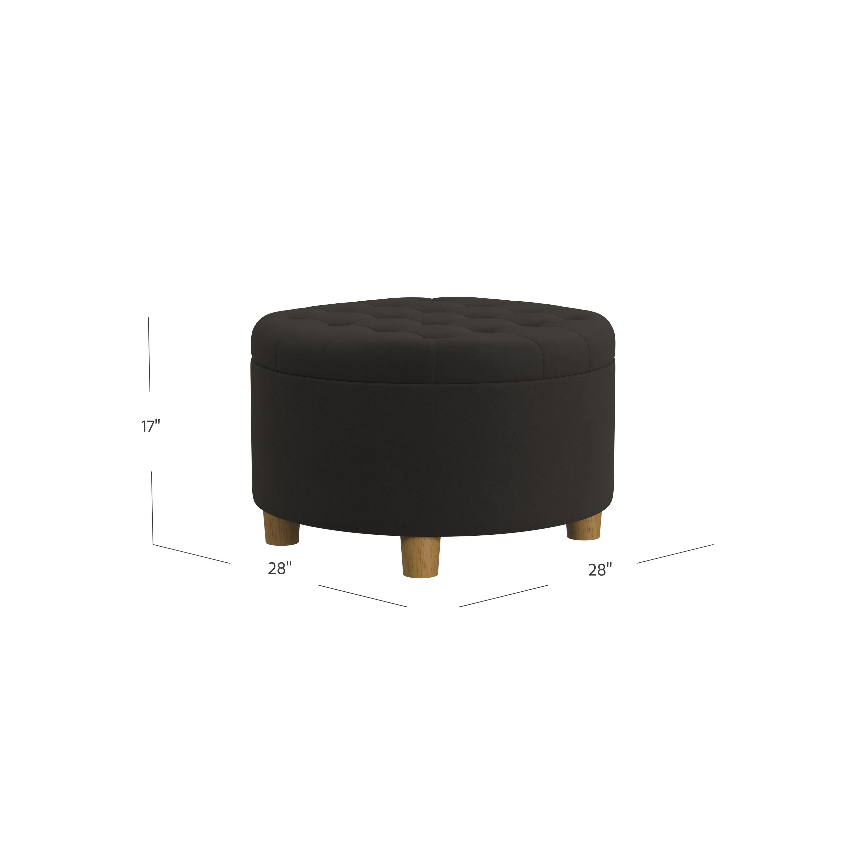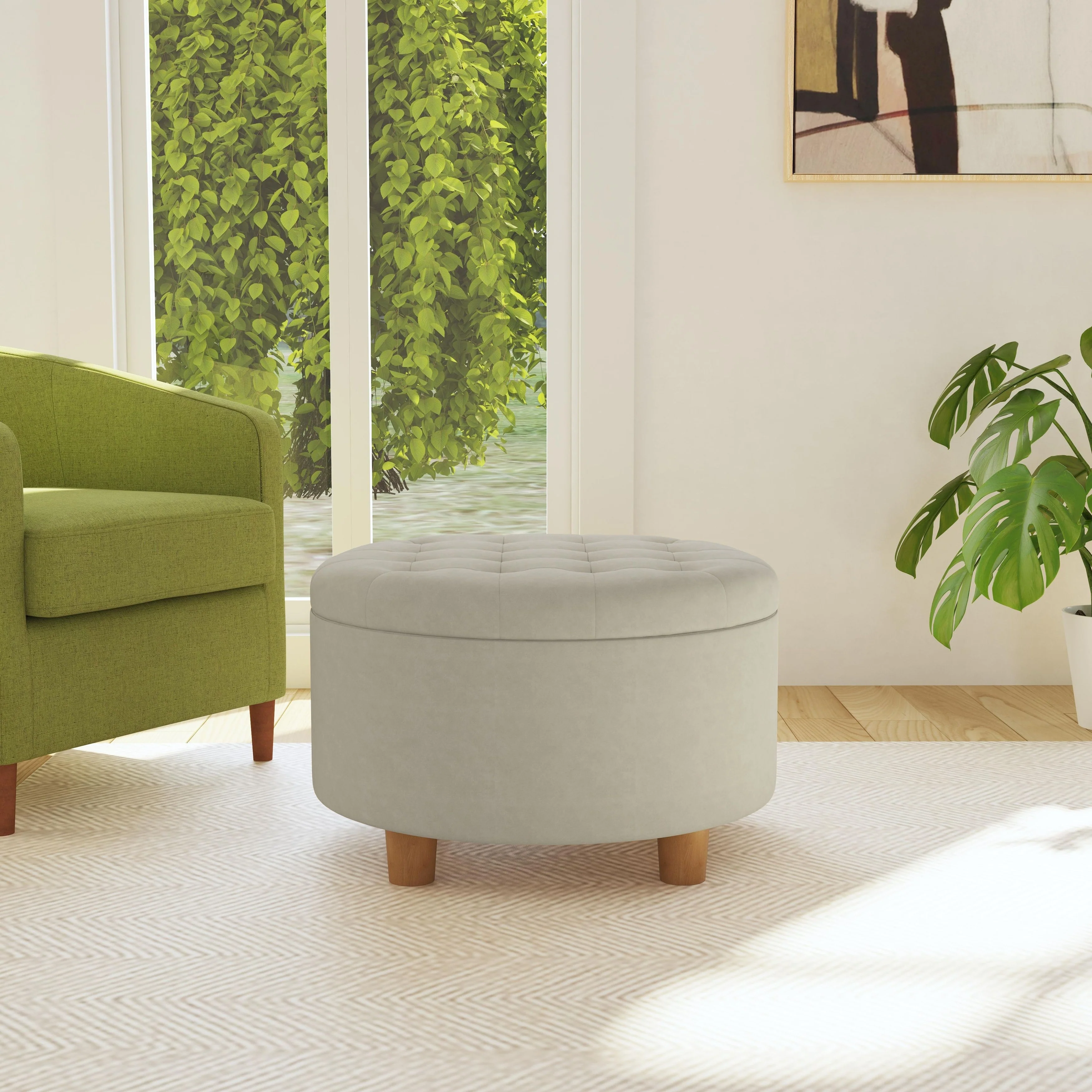 Our large round ottoman offers interest, seating and a stylish storage solution for everything from blankets to toys. With a button tufted lift off lid this modern ottoman has a relaxed feel. Enjoy in your living room as a pair or in front of an accent chair for a comfortable seating arrangement. This storage ottoman with a lift off top and honey oak finished legs is easy to assemble and maintain.