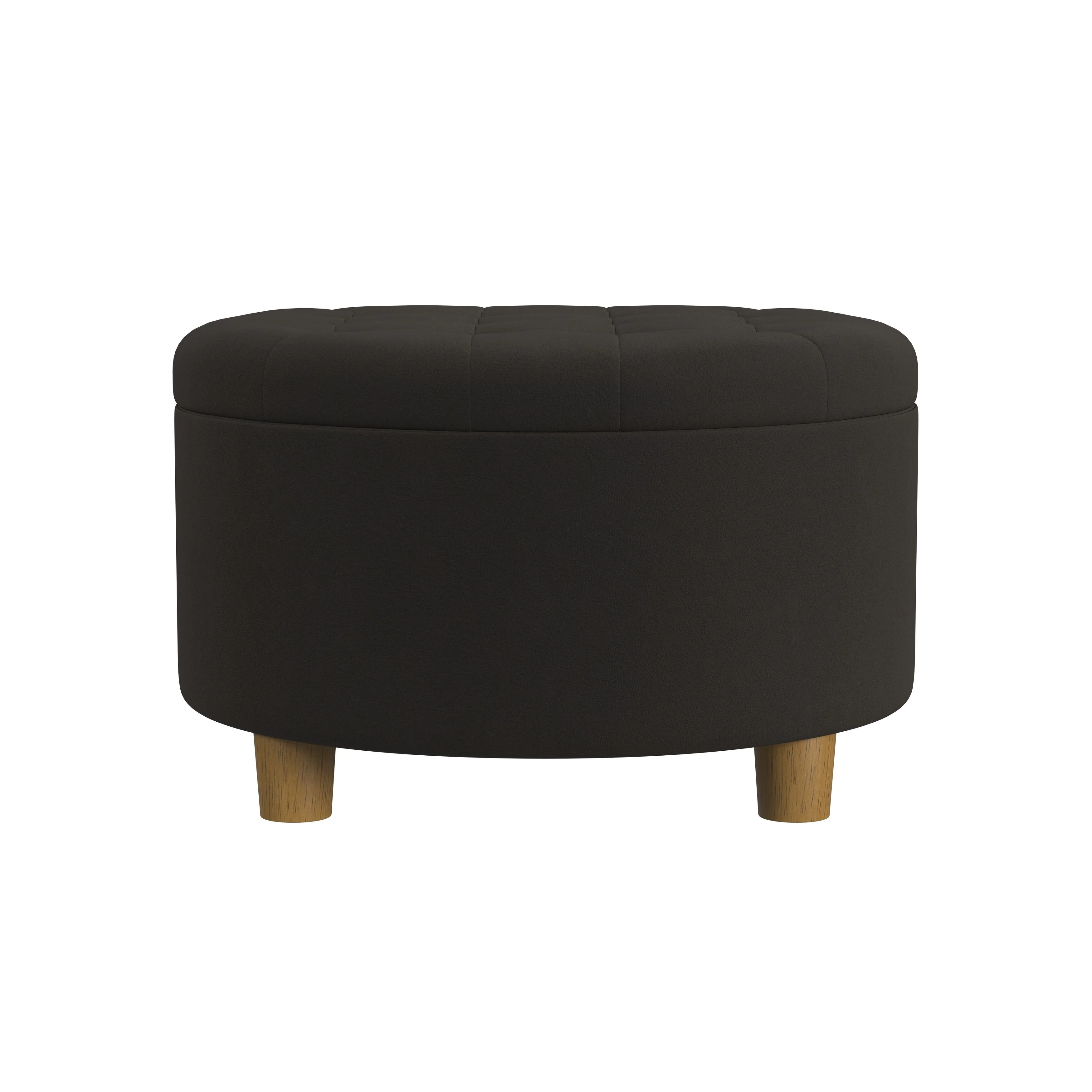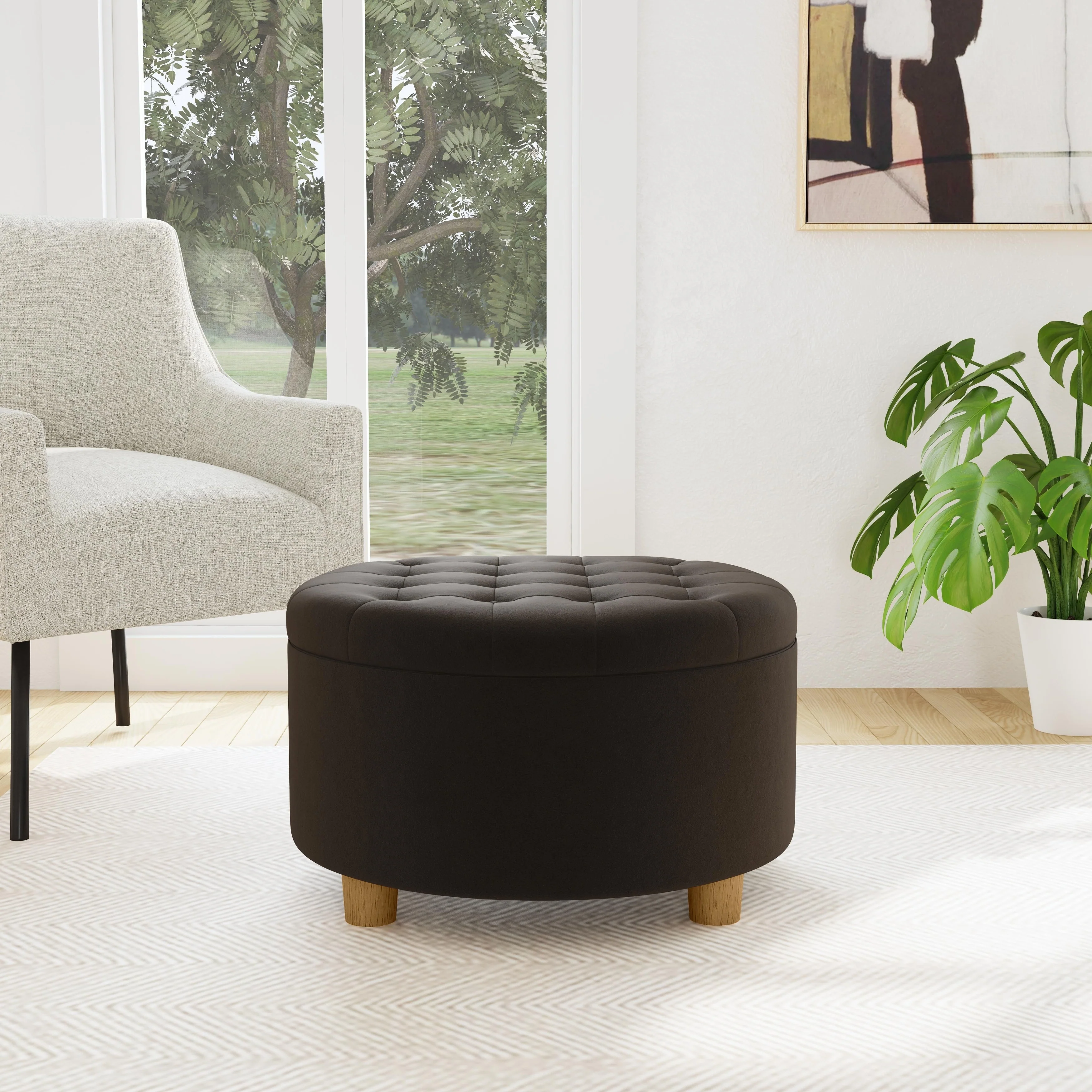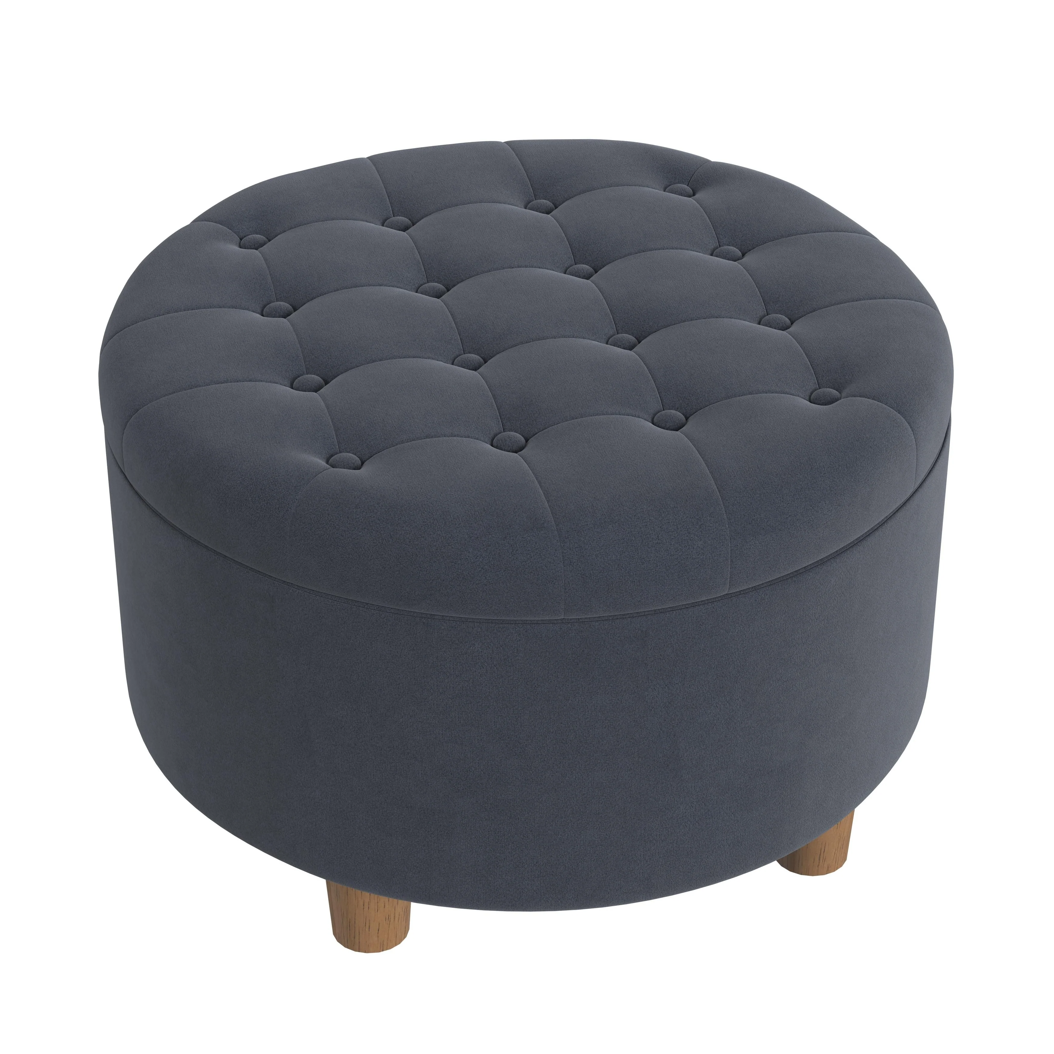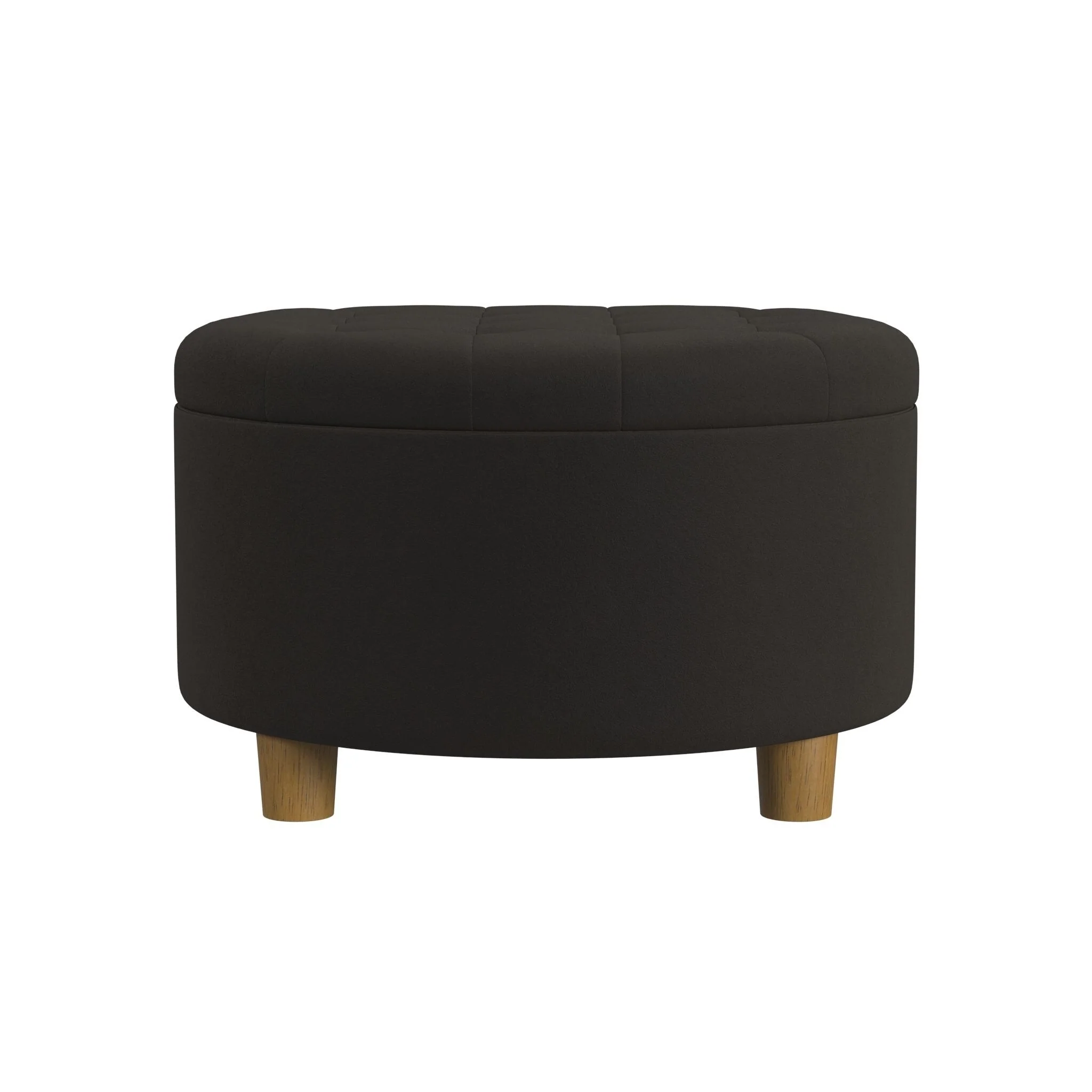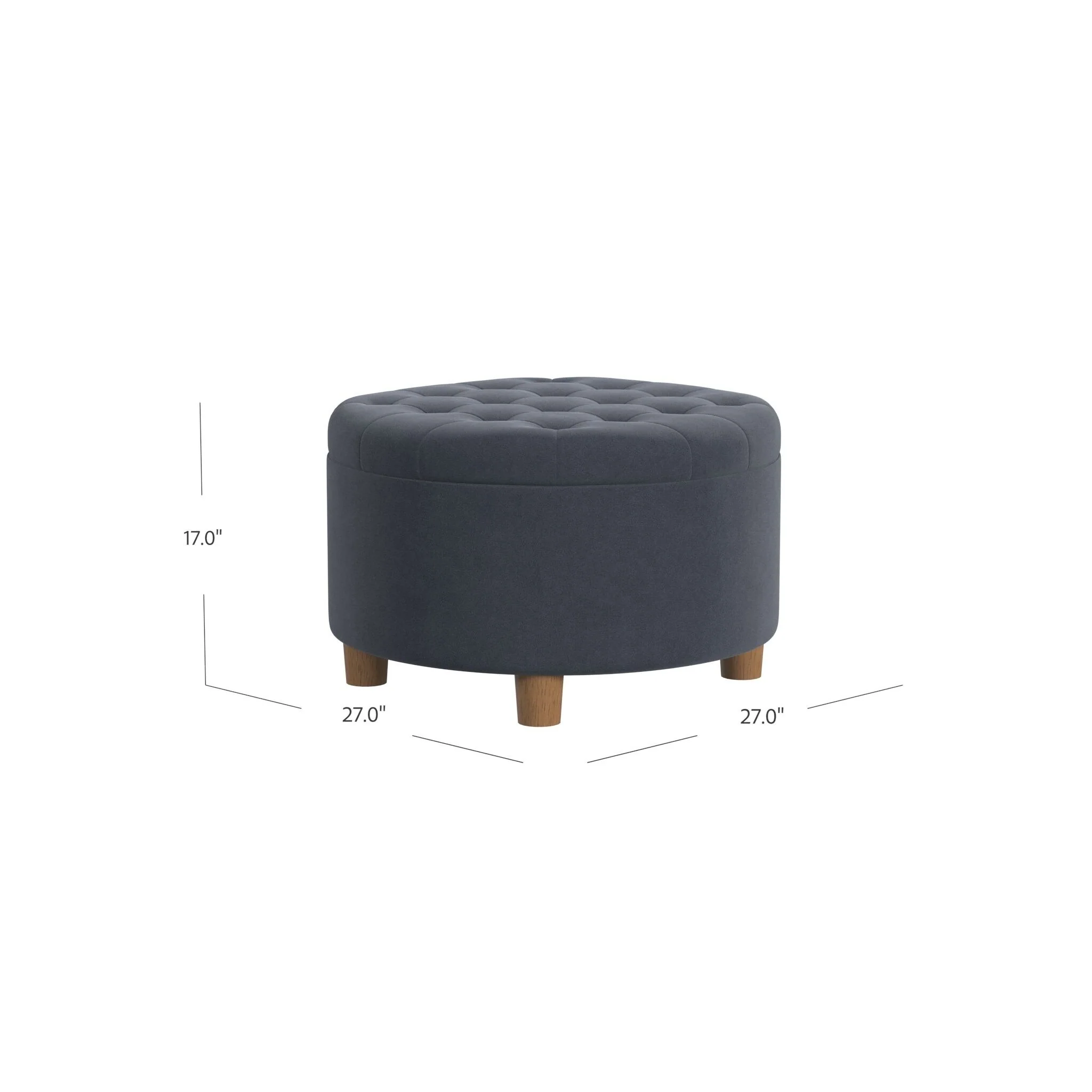 Our large round ottoman offers interest, seating and a stylish storage solution for everything from blankets to toys. With a button tufted lift off lid this modern ottoman has a relaxed feel. Enjoy in your living room as a pair or in front of an accent chair for a comfortable seating arrangement. This storage ottoman with a lift off top and honey oak finished legs is easy to assemble and maintain.