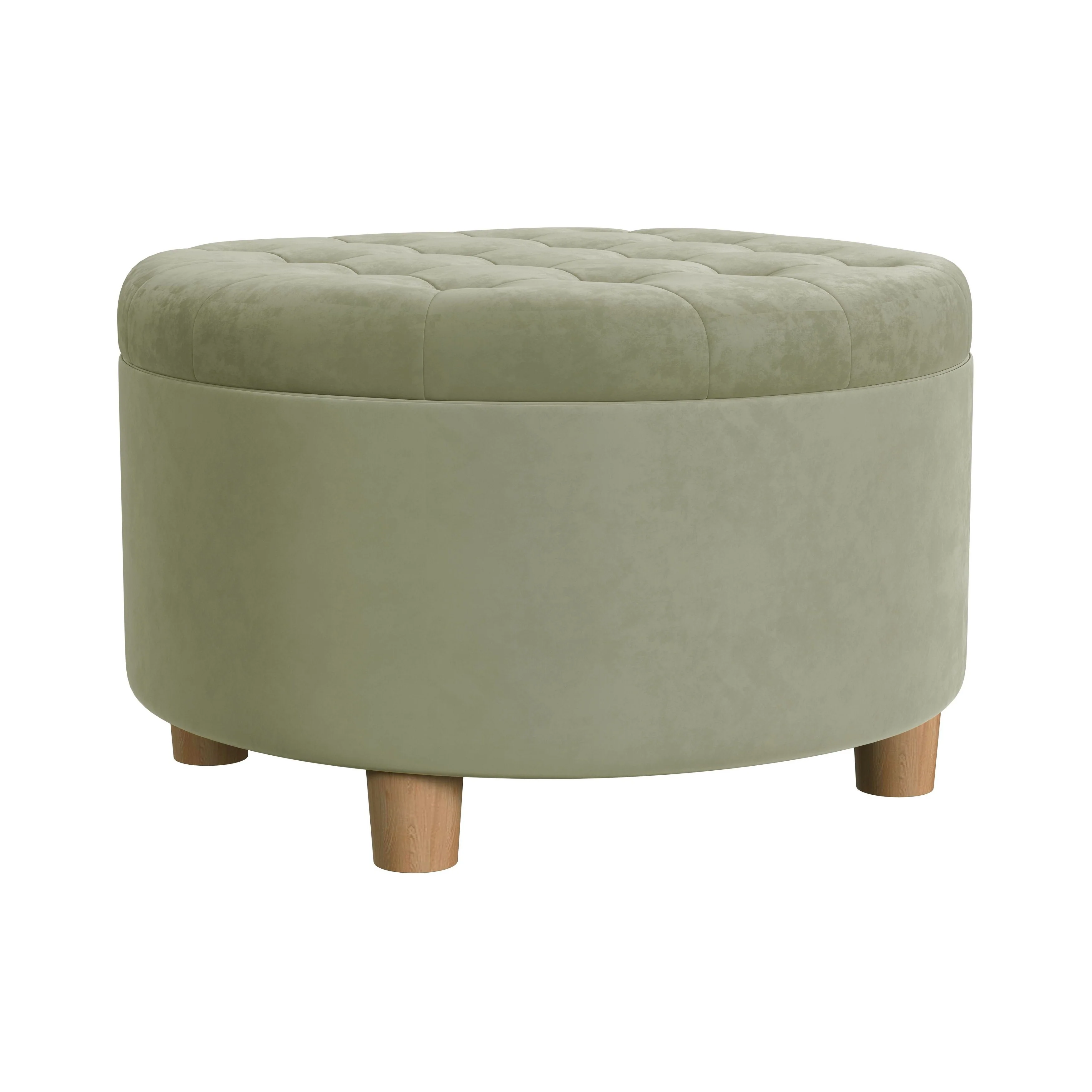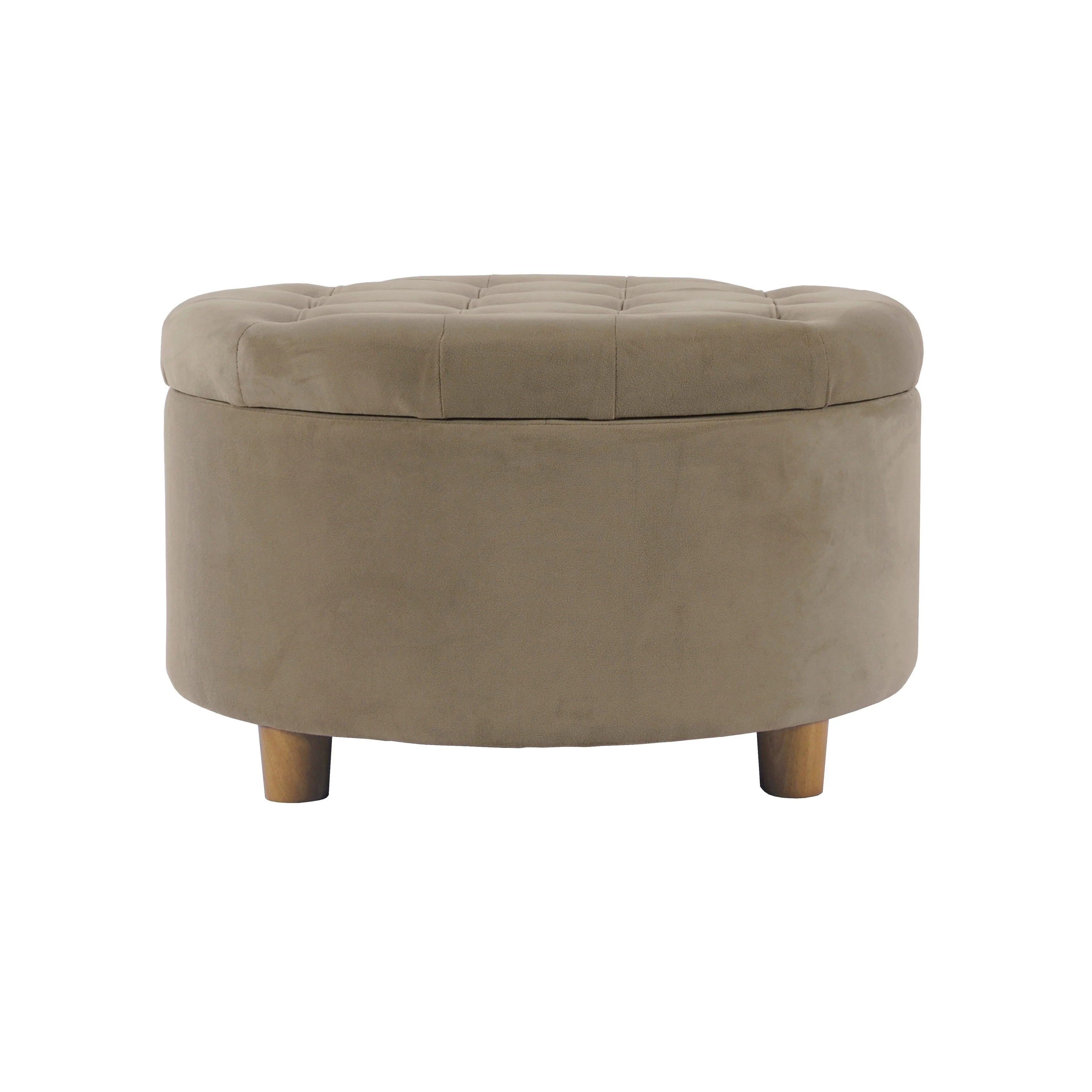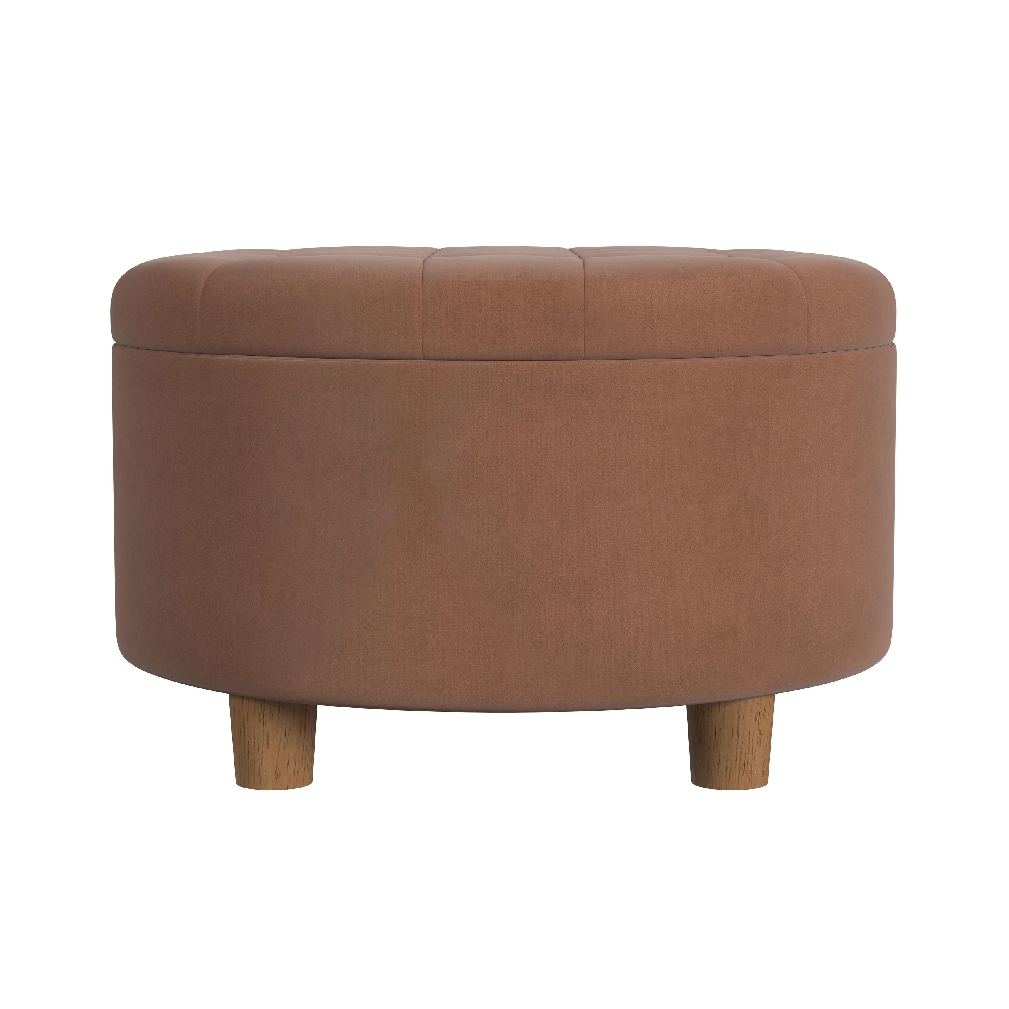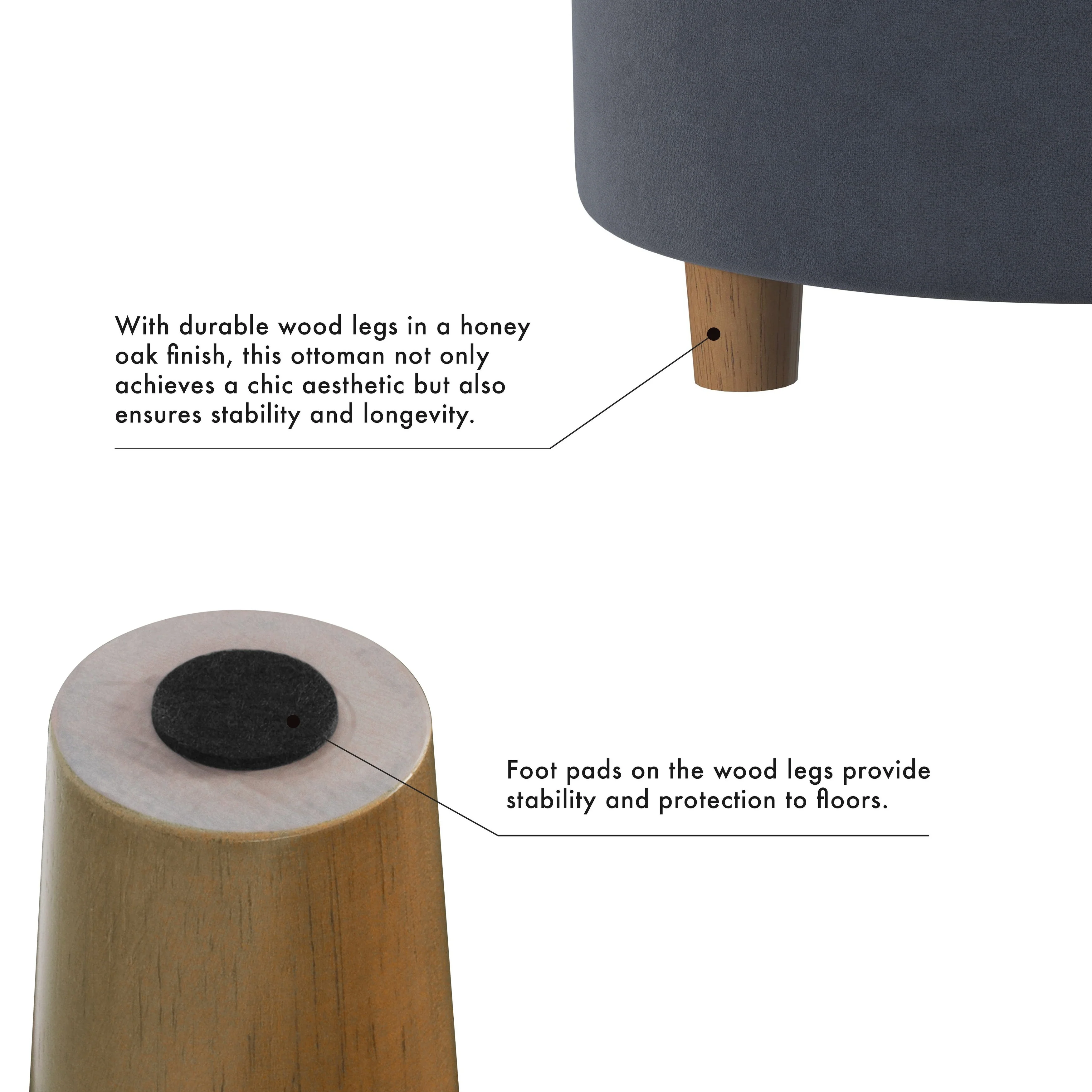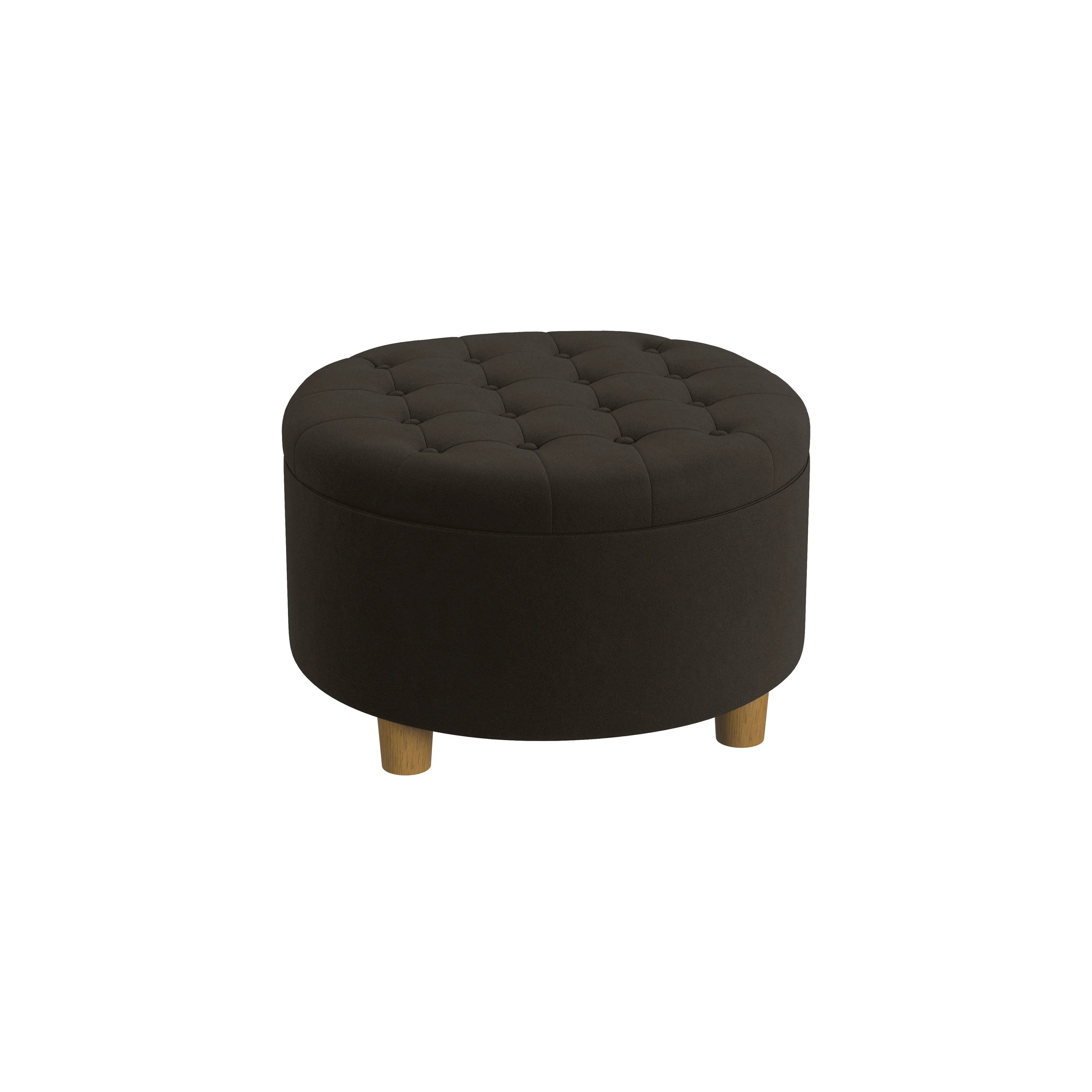 Our large round ottoman offers interest, seating and a stylish storage solution for everything from blankets to toys. With a button tufted lift off lid this modern ottoman has a relaxed feel. Enjoy in your living room as a pair or in front of an accent chair for a comfortable seating arrangement. This storage ottoman with a lift off top and honey oak finished legs is easy to assemble and maintain.