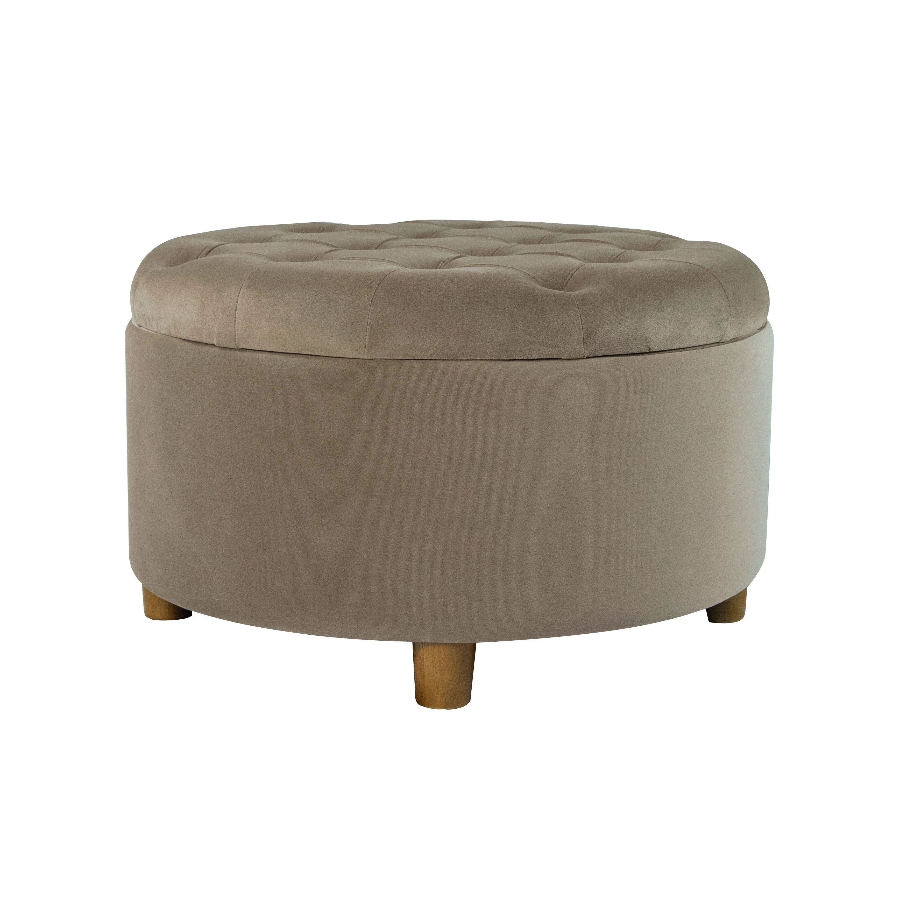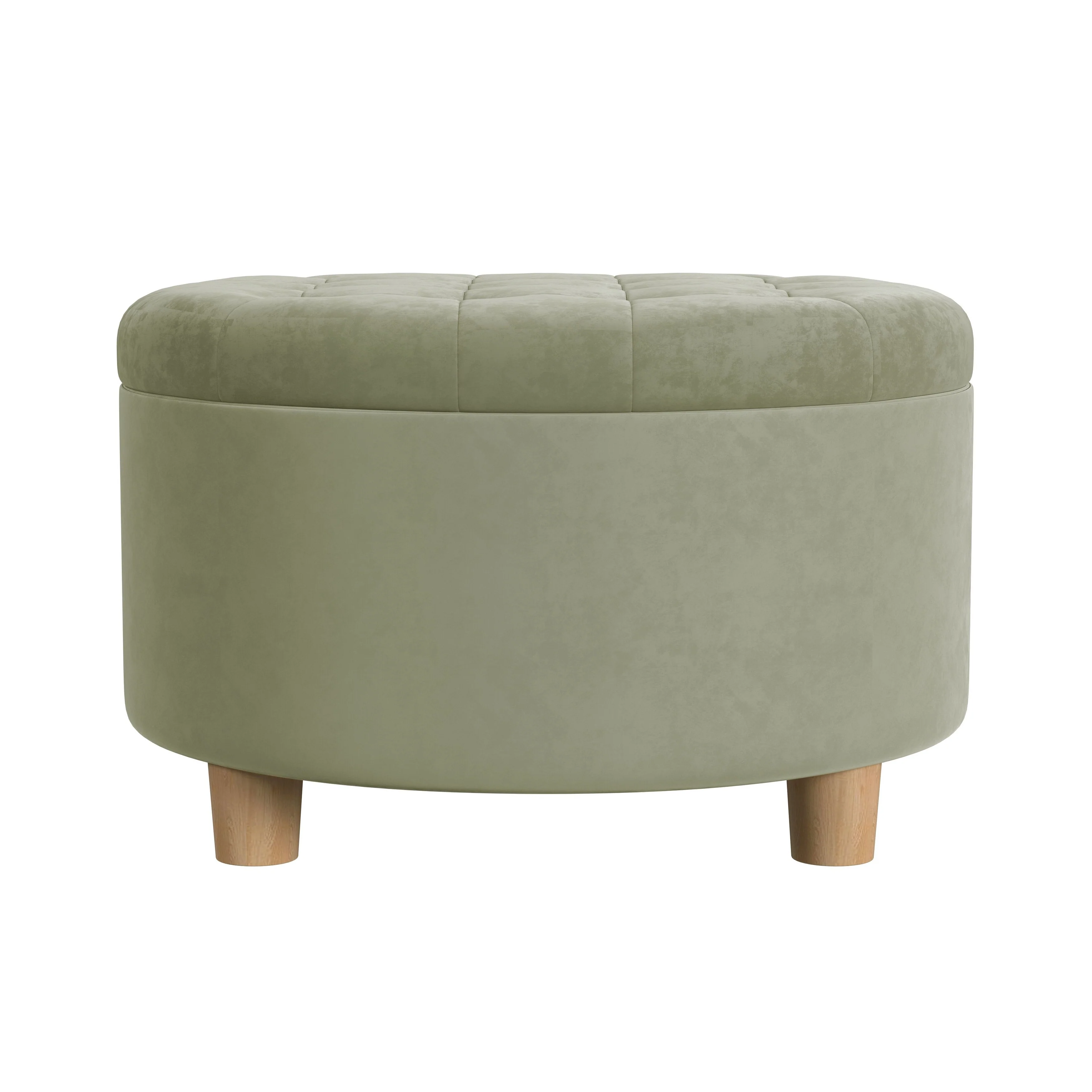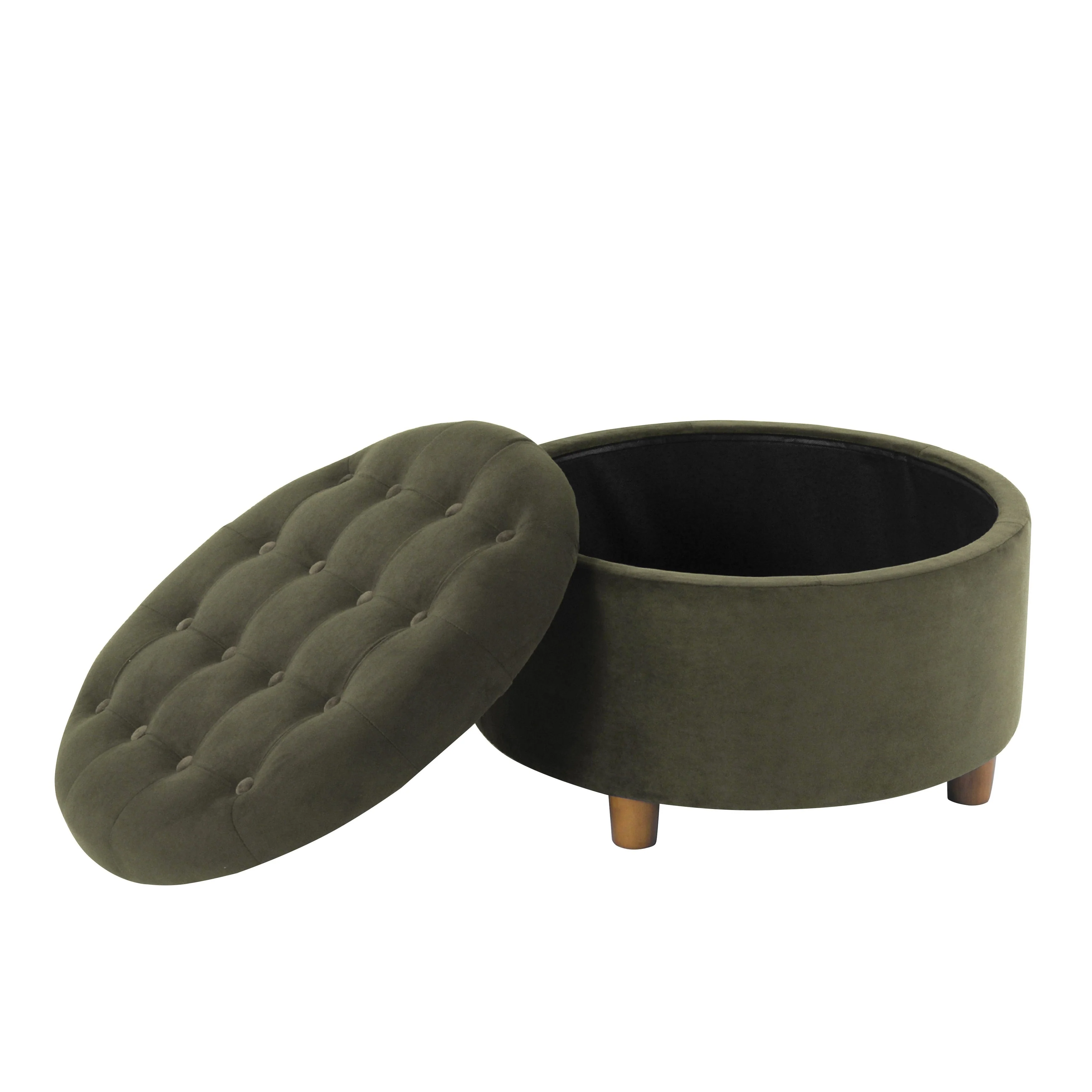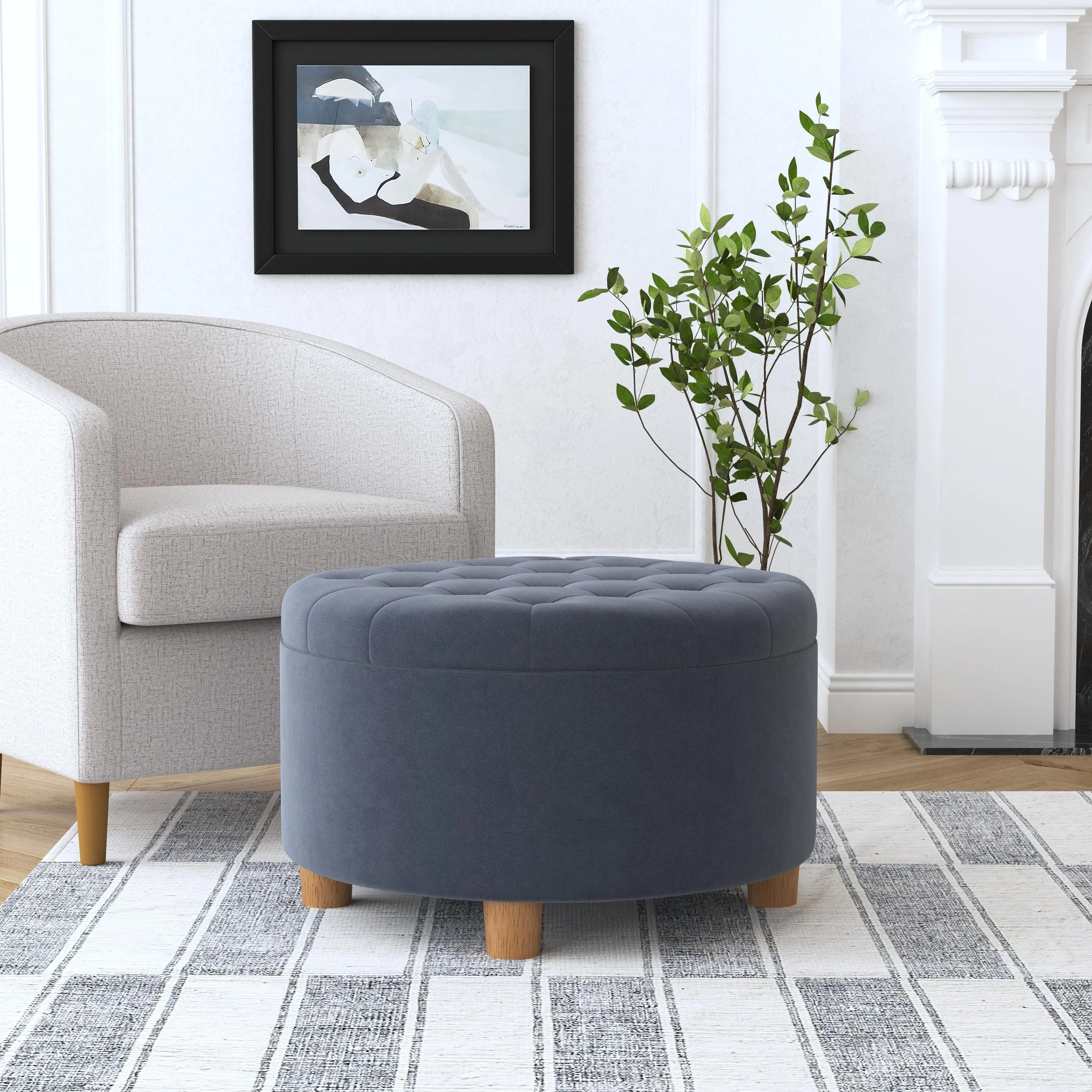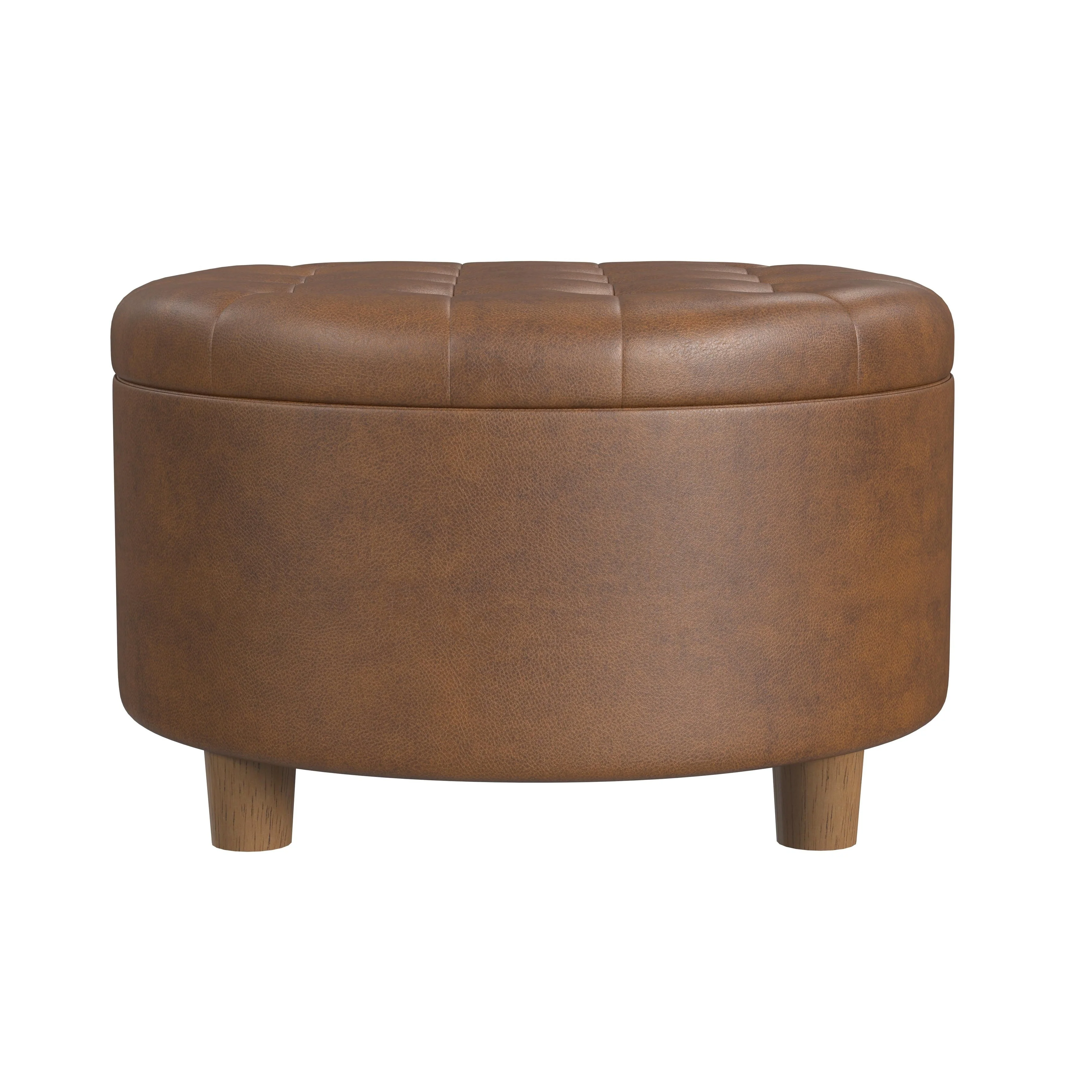Our large round ottoman offers interest, seating and a stylish storage solution for everything from blankets to toys. With a button tufted lift off lid this modern ottoman has a relaxed feel. Enjoy in your living room as a pair or in front of an accent chair for a comfortable seating arrangement. This storage ottoman with a lift off top and honey oak finished legs is easy to assemble and maintain.